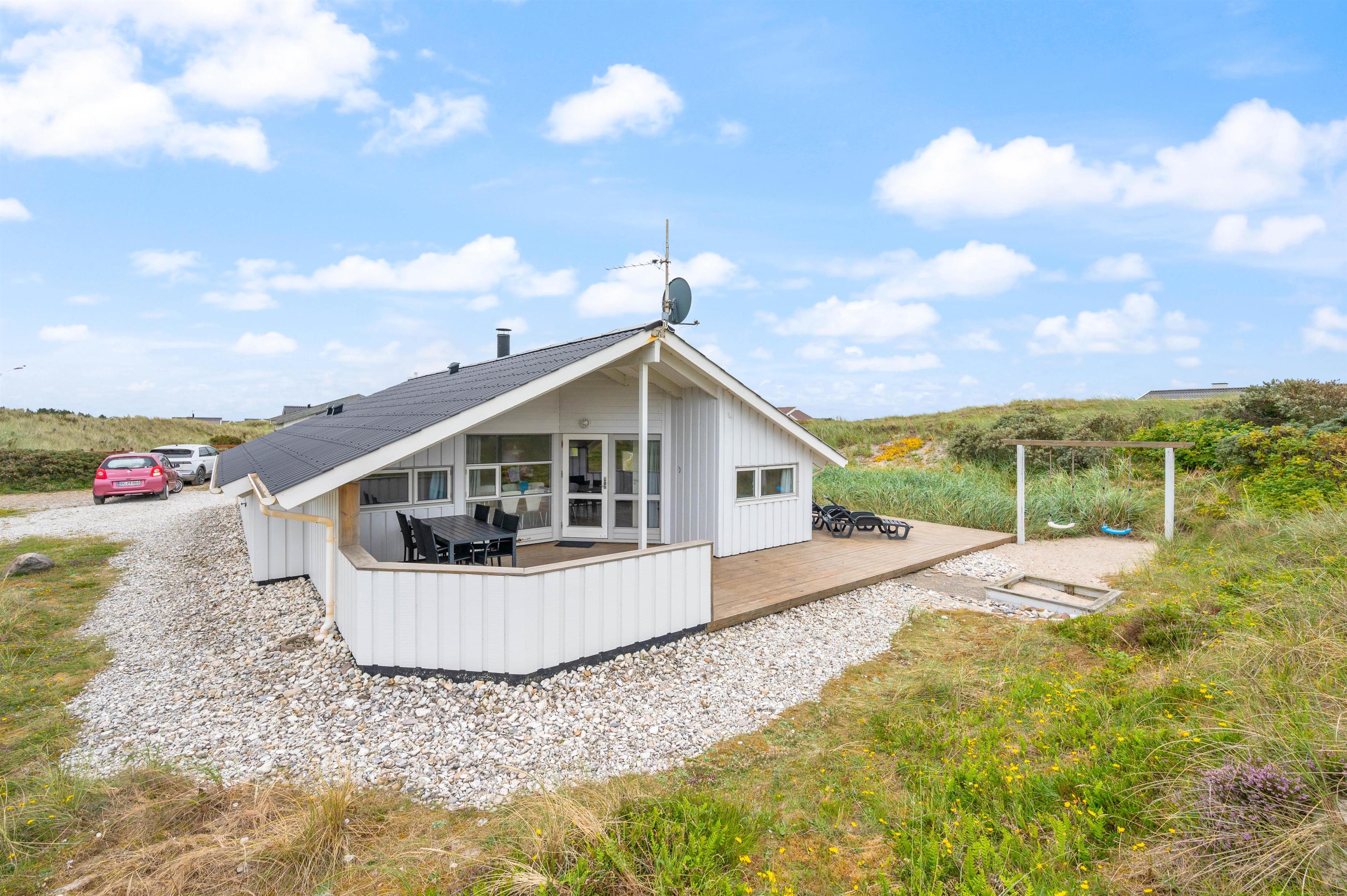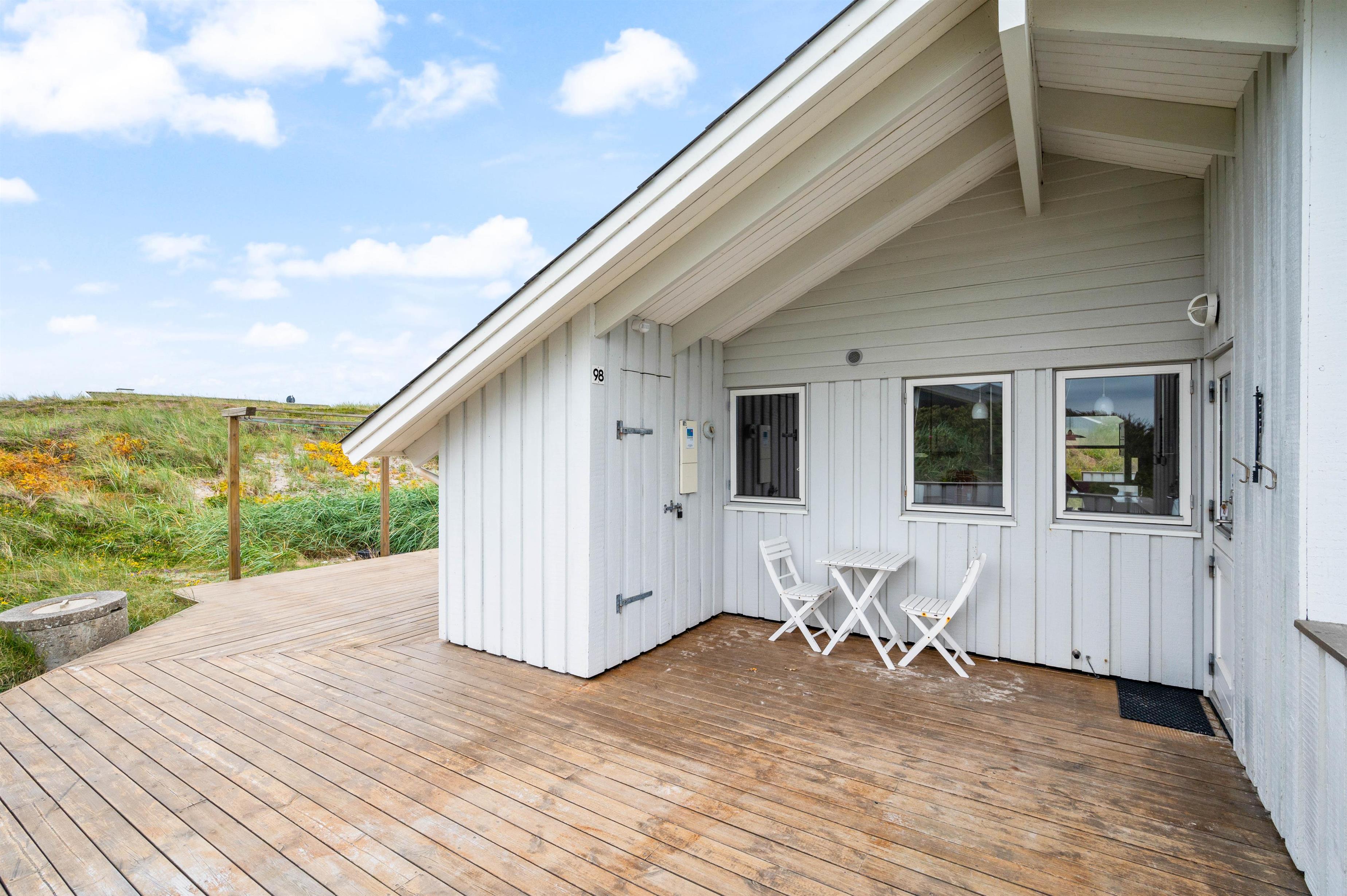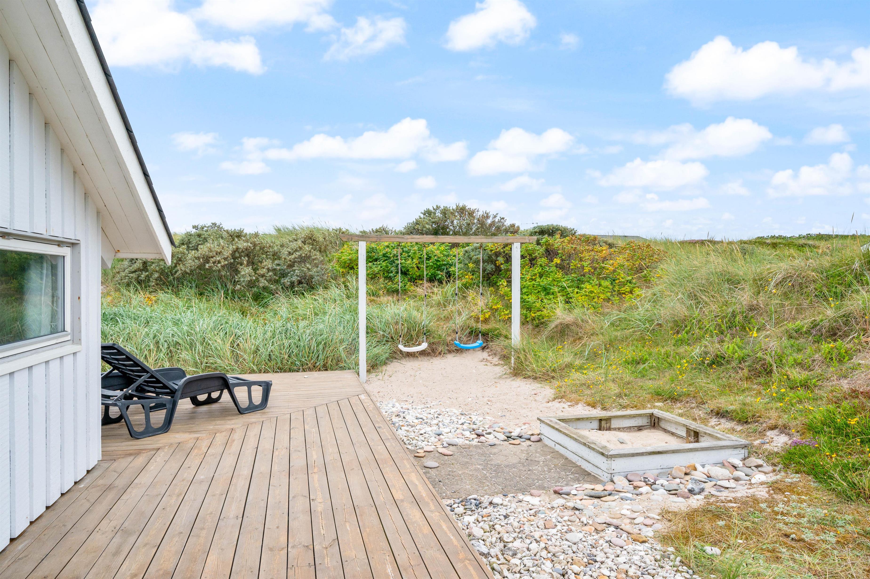 Sommerhuset har en stor flot træterrasse mod syd, hvor klitten sørger for, at I helt ugeneret kan nyde den friske luft. Terrassen er naturligvis udstyret med havemøbler, liggestole og en grill. Her er lagt op til mange solskinstimer på terrassen, mens terrassen mod vest er delvist overdækket. Her kan I nyde skyggen eller den første forårssol. For de mindste er der opsat gynger og sandkasse.