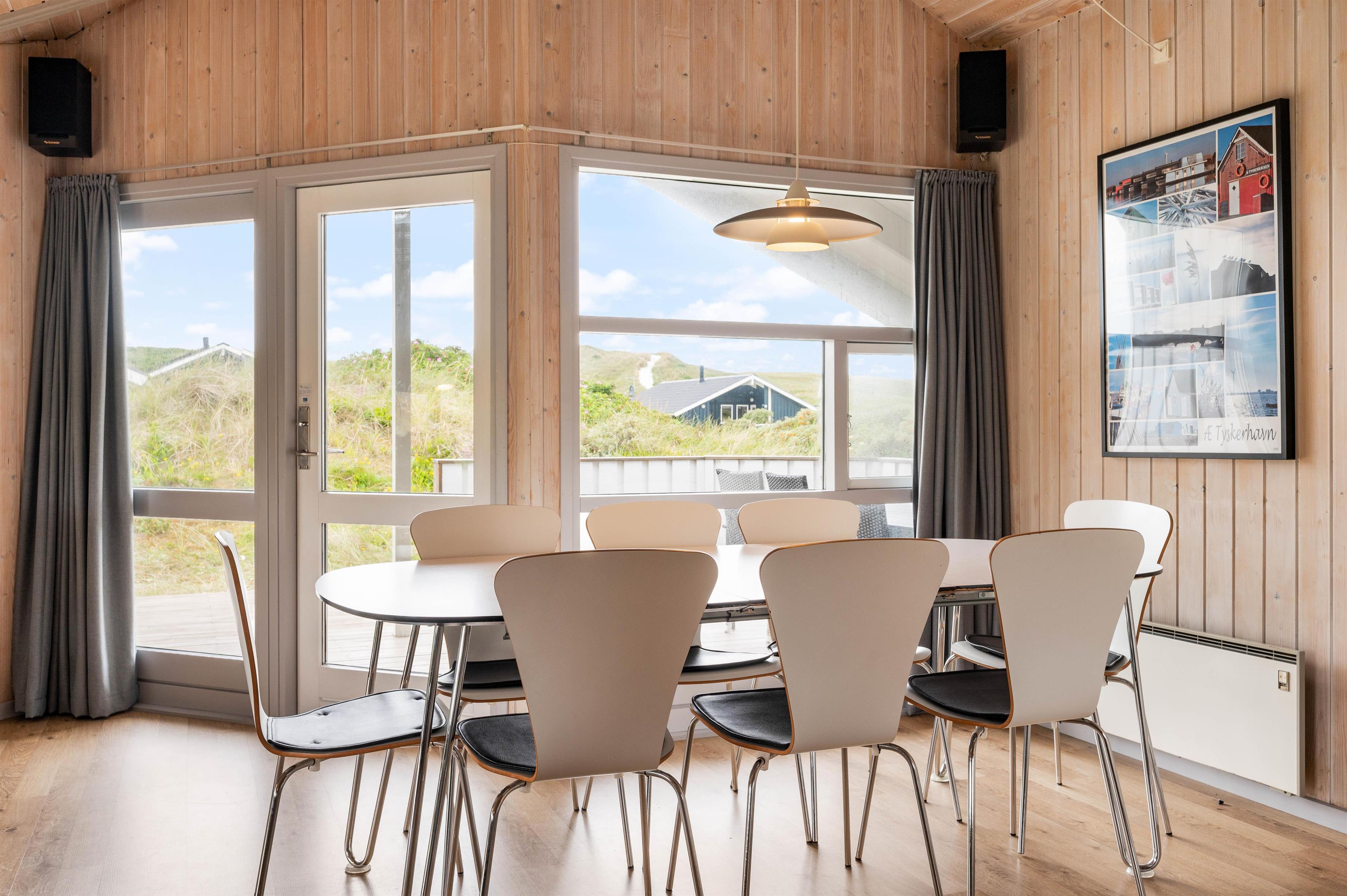 Dette dejlige sommerhus har en skøn ugeneret beliggenhed for enden af en lille stikvej. Herfra er der kun små 200 meter til den flotte og brede sandstrand. Sommerhuset ligger på landtangen mellem Vesterhavet og Ringkøbing Fjord. Her er gode stier langs det kuperede klitlandskab. Tag naturstien til købmanden i Bjerregård. Her er åbent året rundt og kan hver dag købes friskt bagværk og rundstykker.