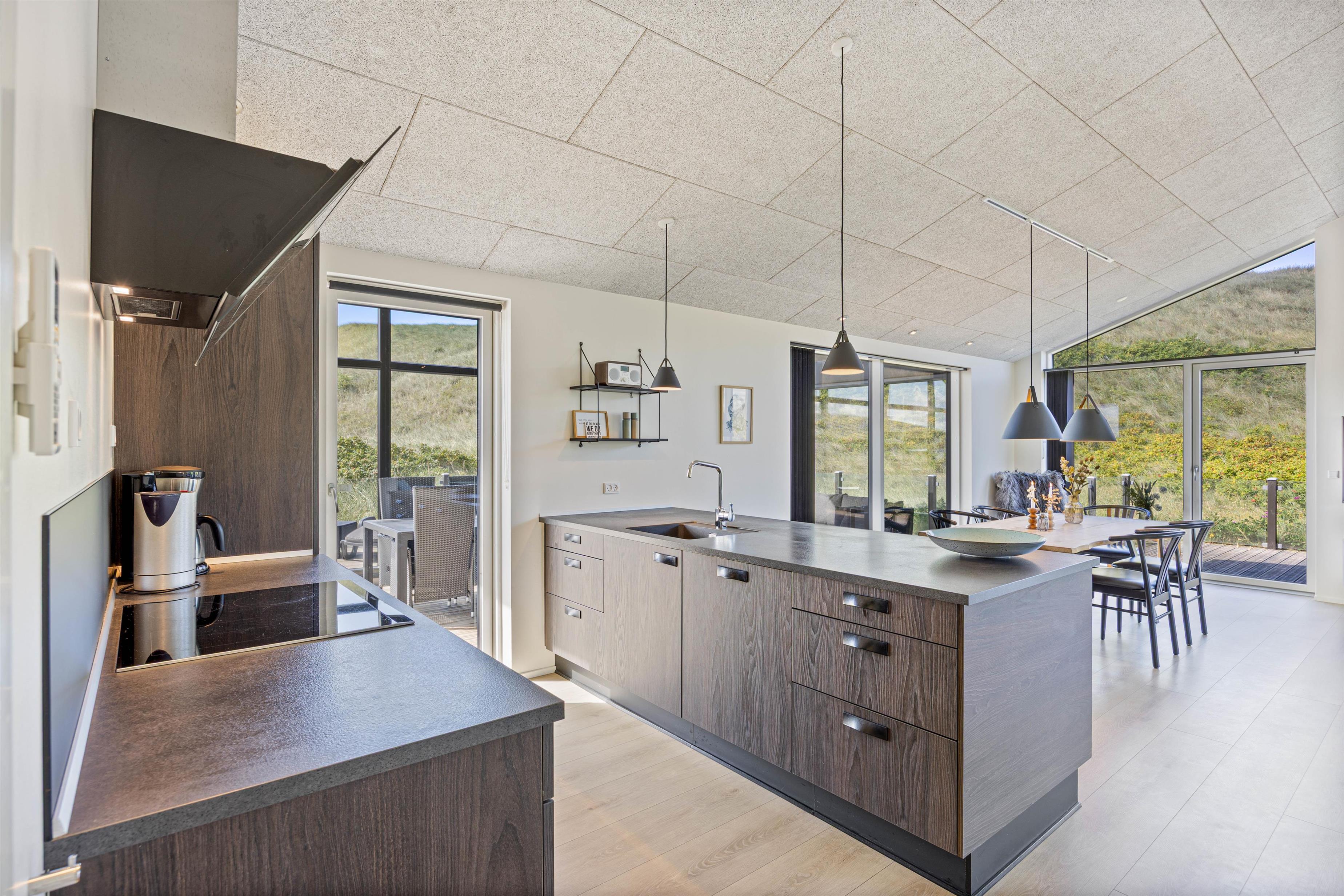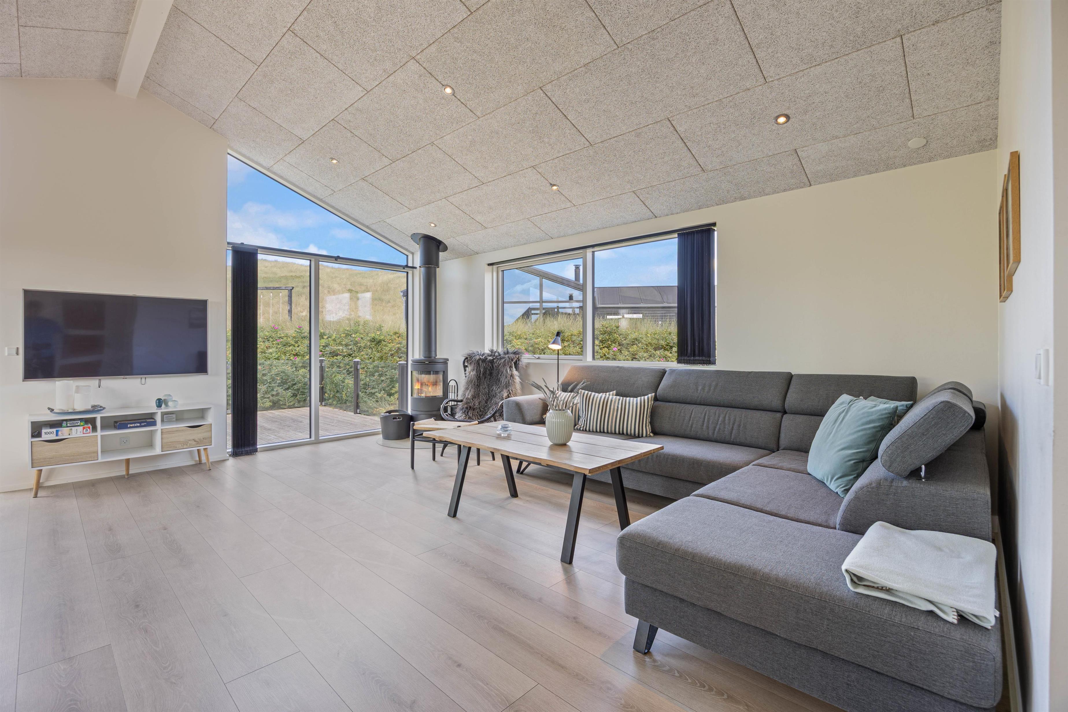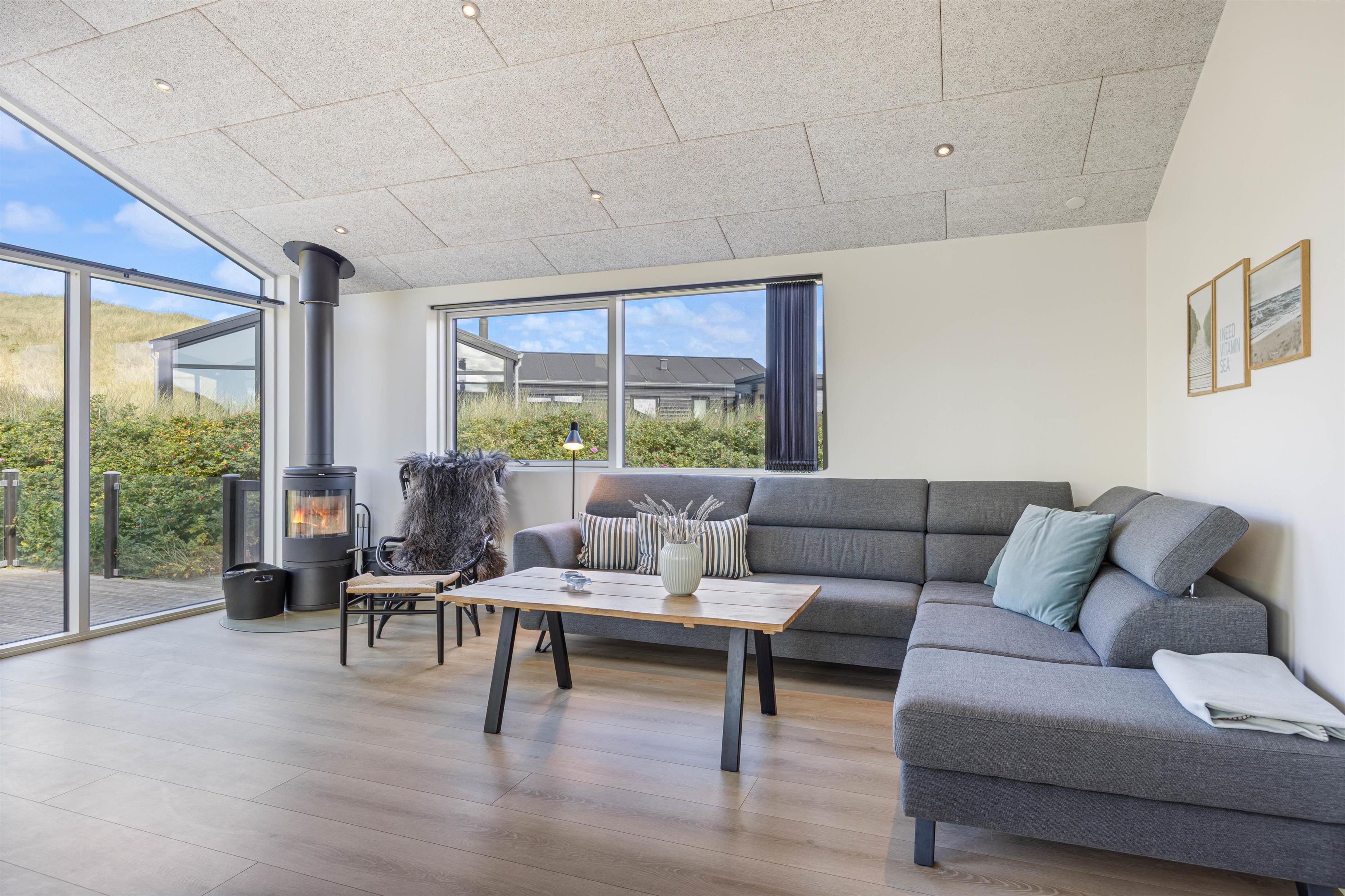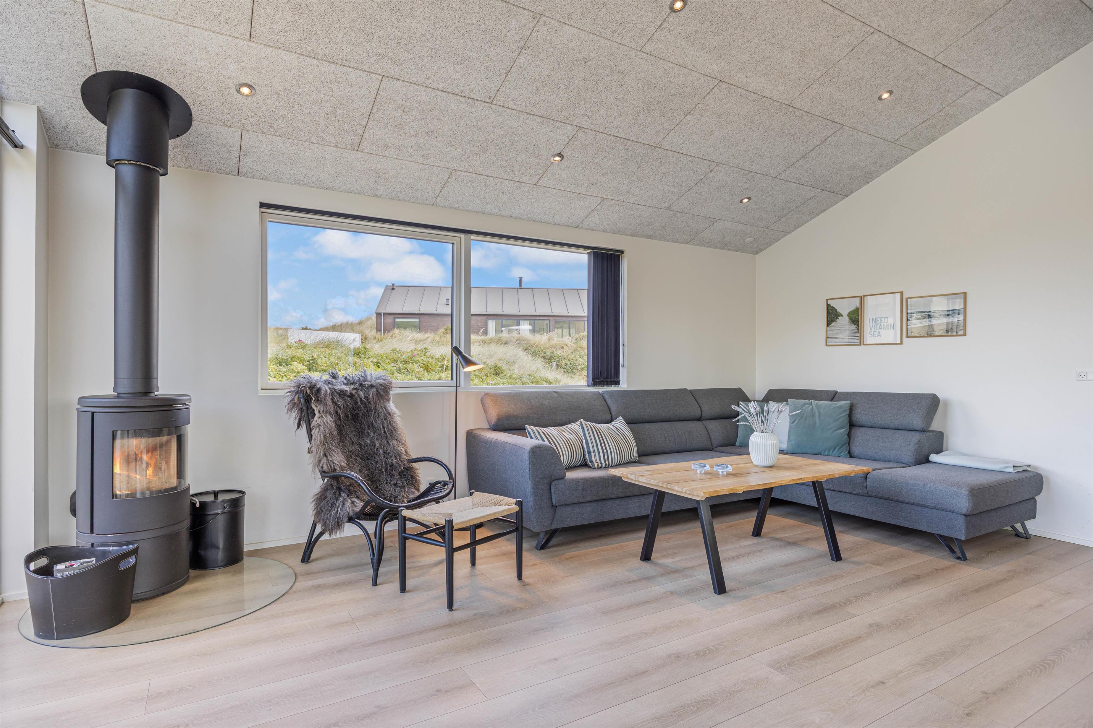 De store vinduer inviterer solens lys og den vestjyske natur indenfor, og gør de flotte omgivelser endnu mere indbydende. Især i det store opholdsrum, hvor stue og køkken er slået sammen, er der rigtig lyst og åbent. Her står også den klassiske brændeovn, som med sine knitrende flammer gør de mørke aftentimer og regnfulde efterårsdage endnu hyggeligere.