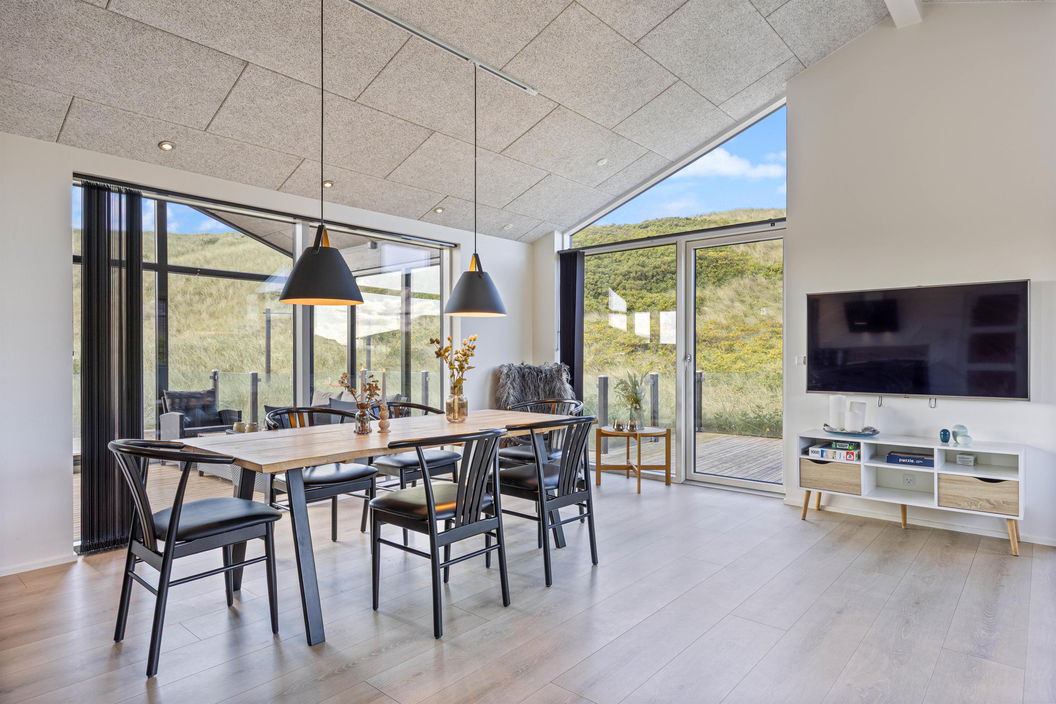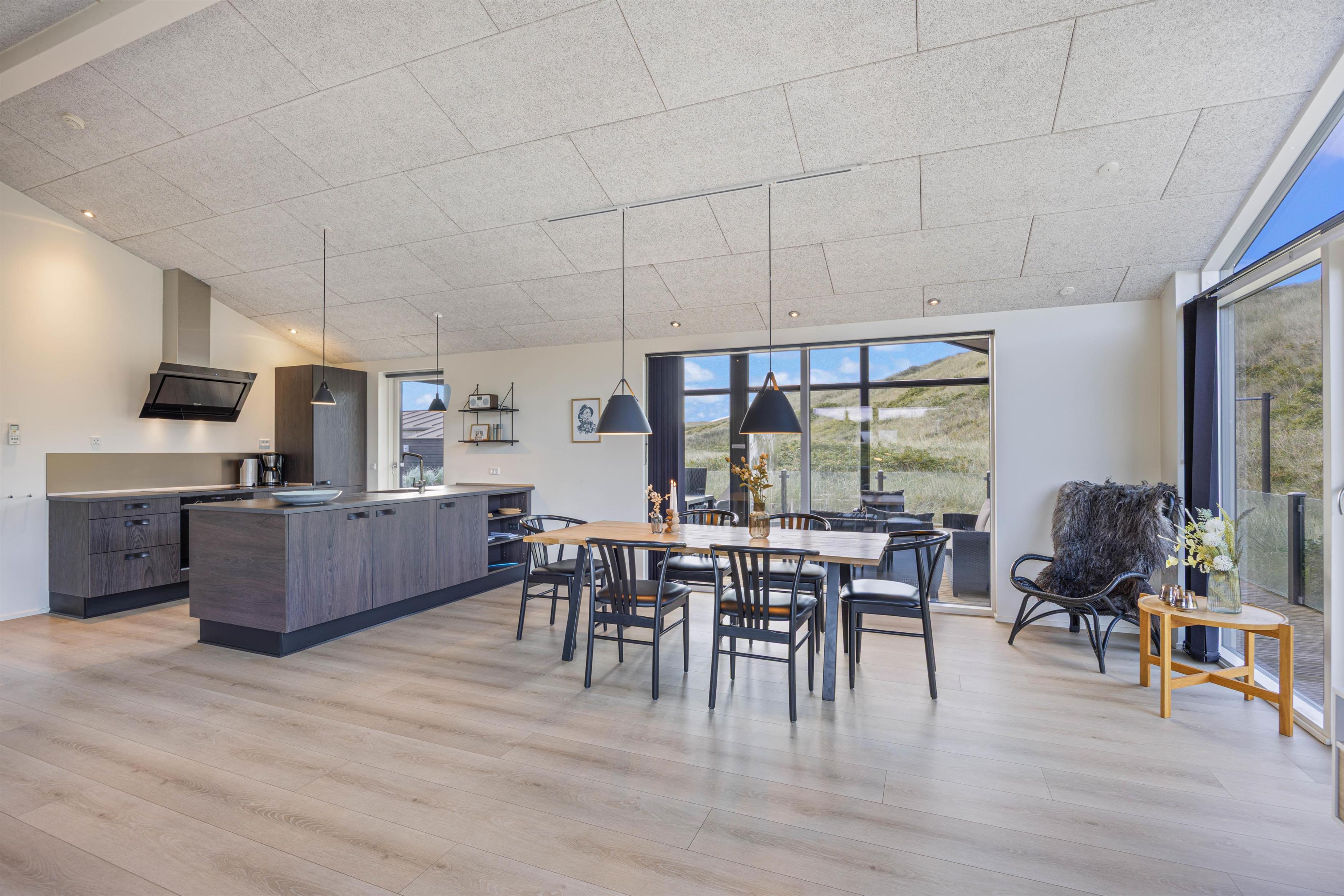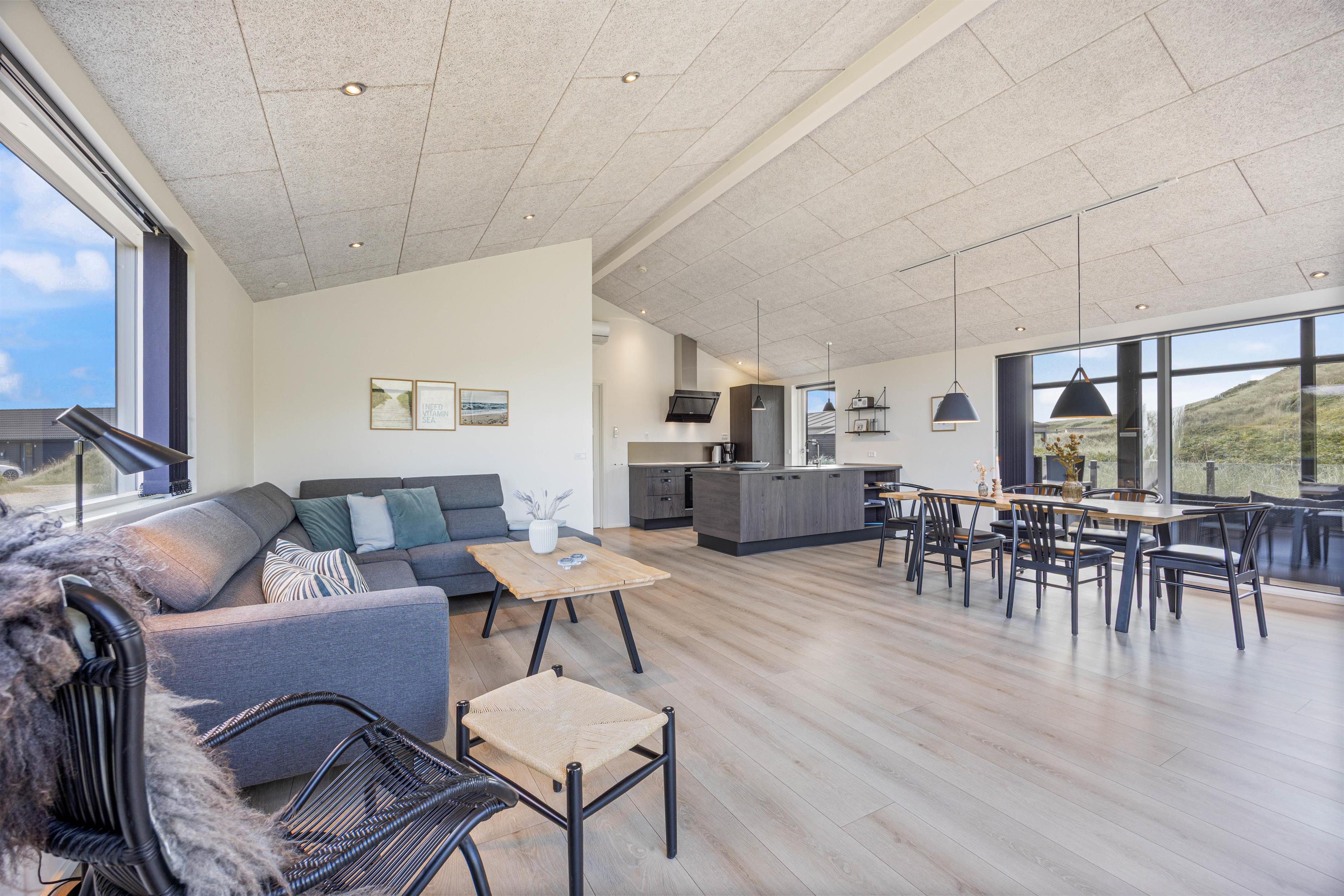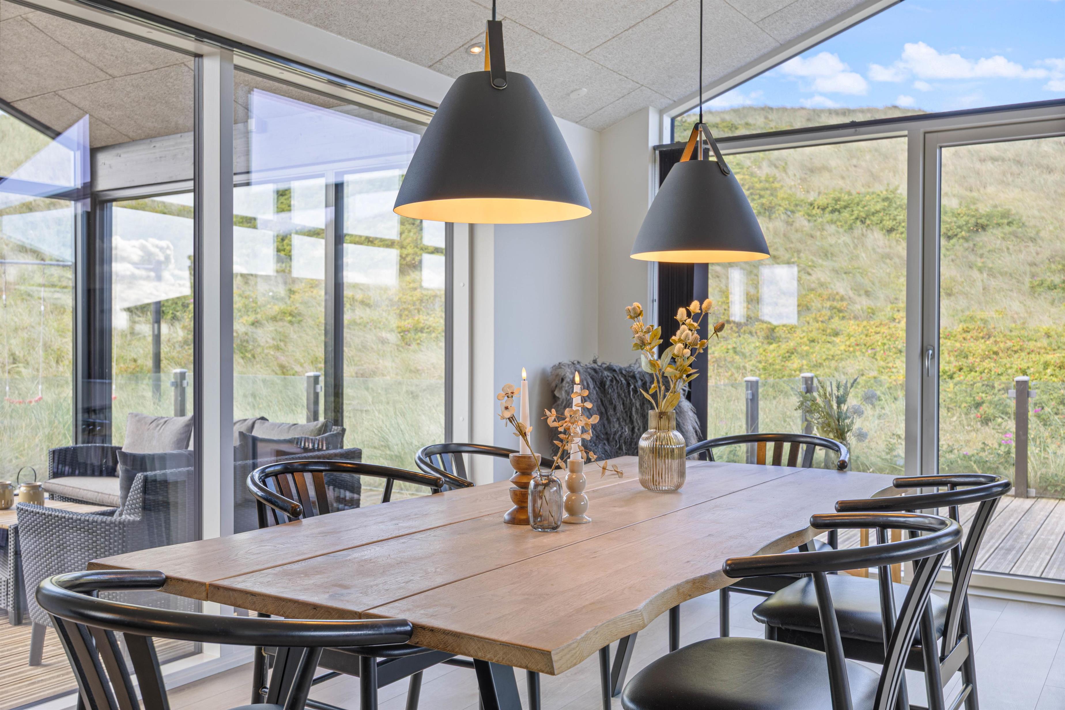 De store vinduer inviterer solens lys og den vestjyske natur indenfor, og gør de flotte omgivelser endnu mere indbydende. Især i det store opholdsrum, hvor stue og køkken er slået sammen, er der rigtig lyst og åbent. Her står også den klassiske brændeovn, som med sine knitrende flammer gør de mørke aftentimer og regnfulde efterårsdage endnu hyggeligere.