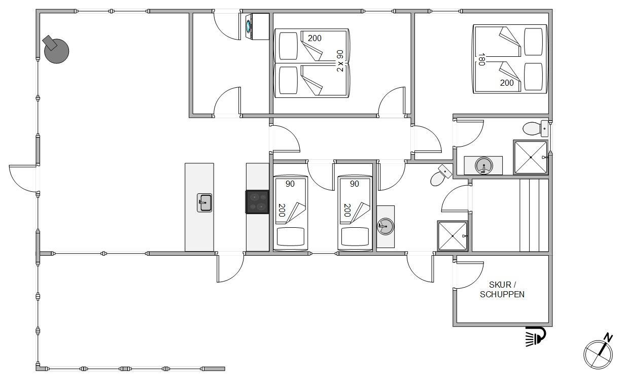 Feriehuset har en helt fantastisk beliggenhed i første klitrække. Der er kun 50 meter til stranden, og både store og små kan følge med på den korte gåtur over strandopgangen. Når I kommer hjem fra en hyggelig dag ved havet, kan I skylle fødderne rene i jeres helt egen udebruser på terrassesom kan benyttes fra april til november.