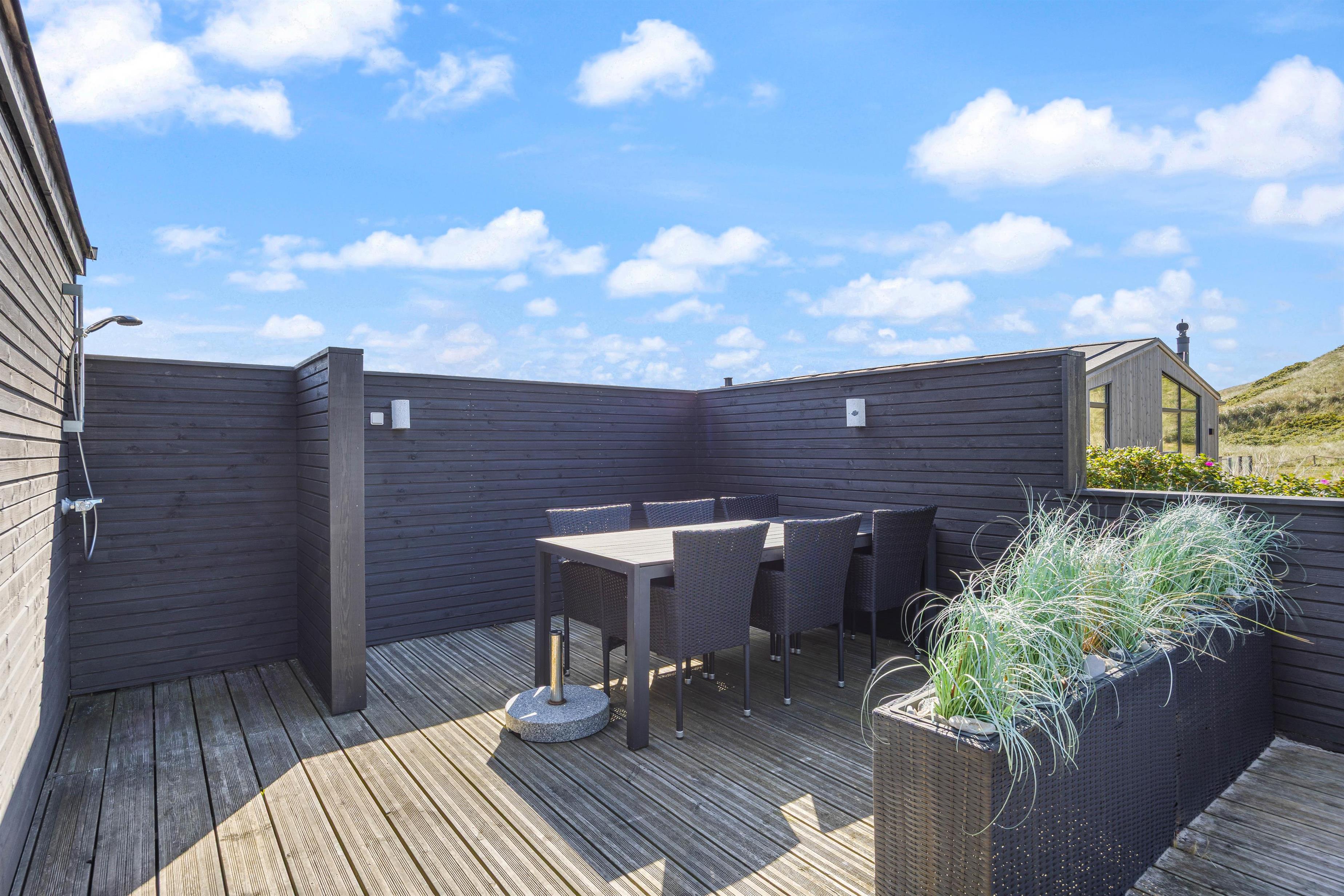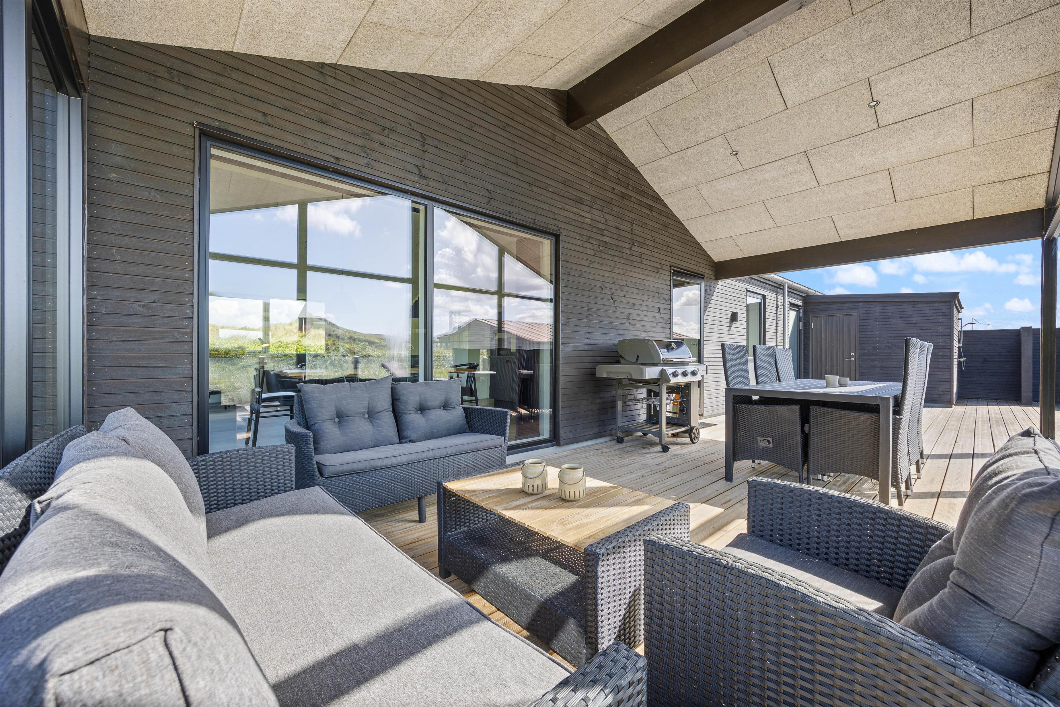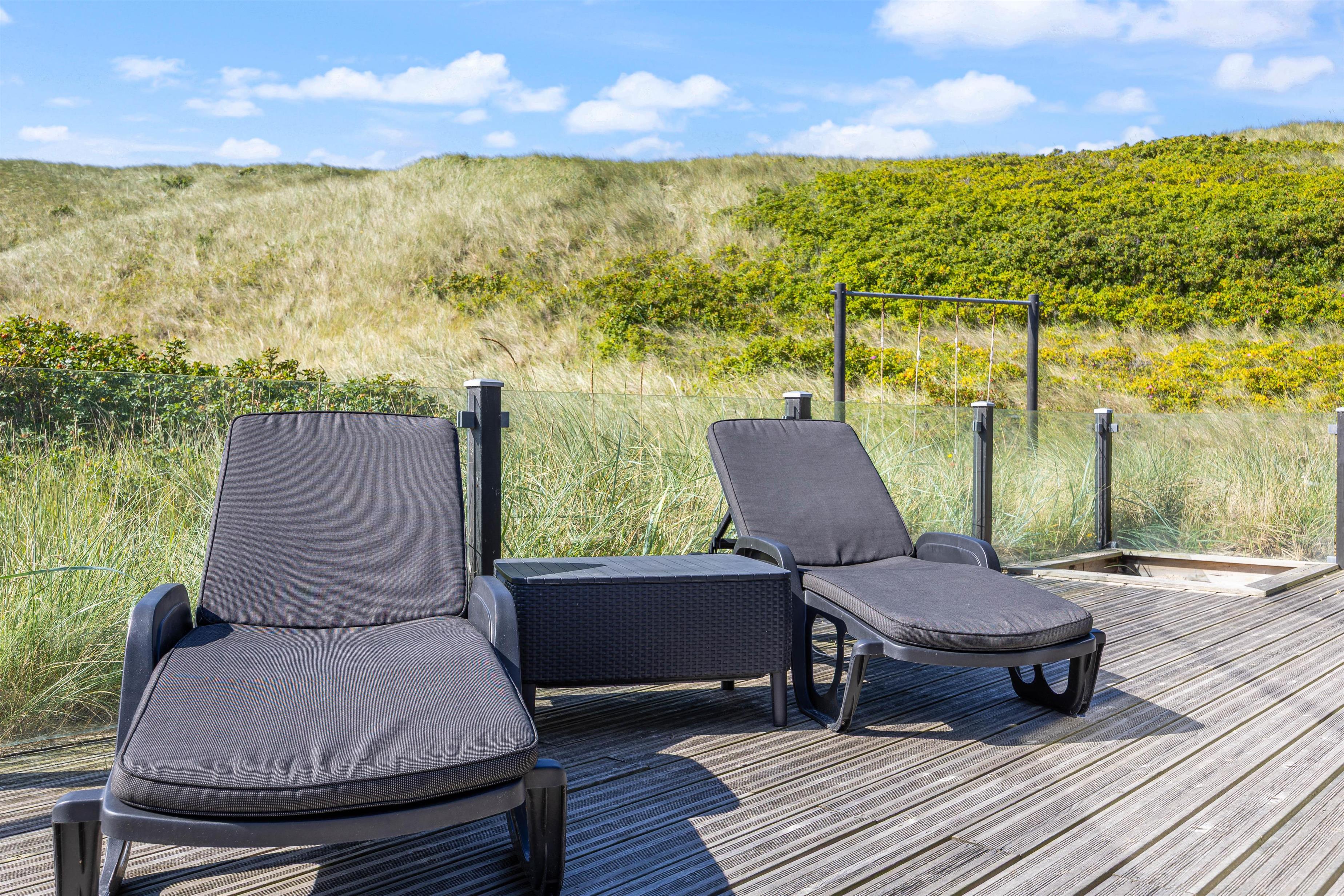 Den fede træterrasse går stort set hele vejen rundt om huset, og der er masser af afskærmning, så I til enhver tid kan sidde i læ for den friske vestenvind. Nyd feriedagene i de gode havemøbler og liggestole, og følg solen rundt dagen lang på den store terrasse.
