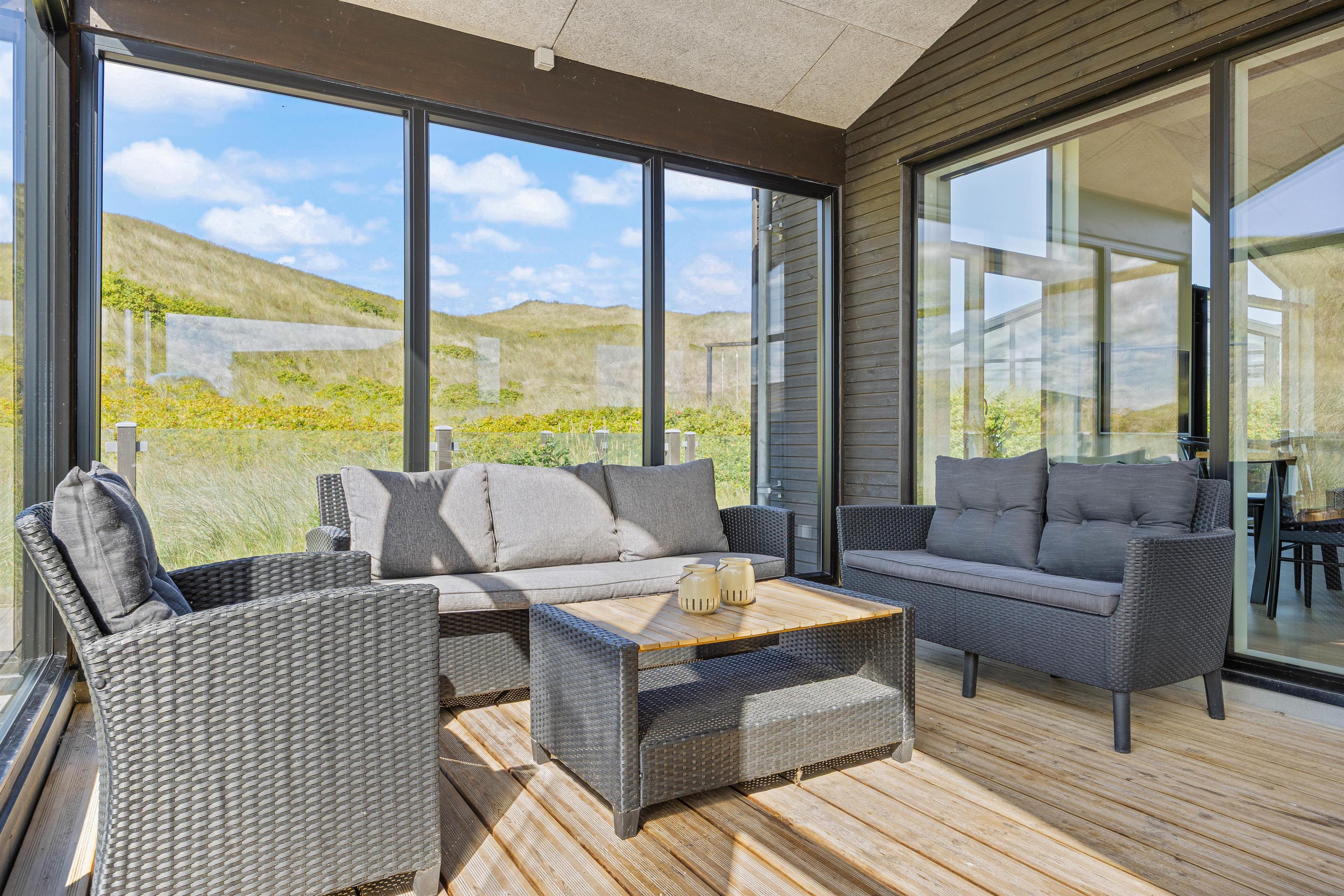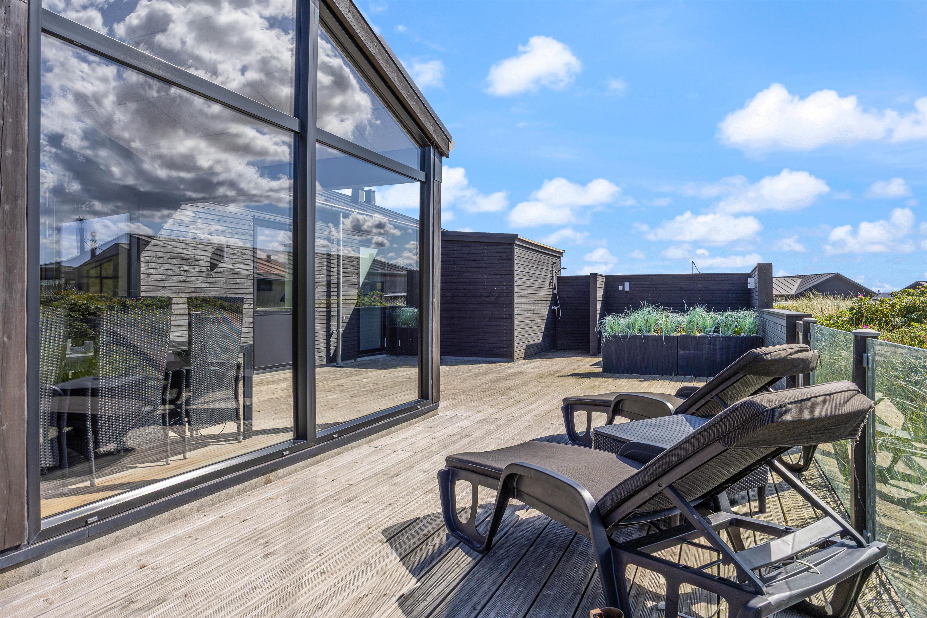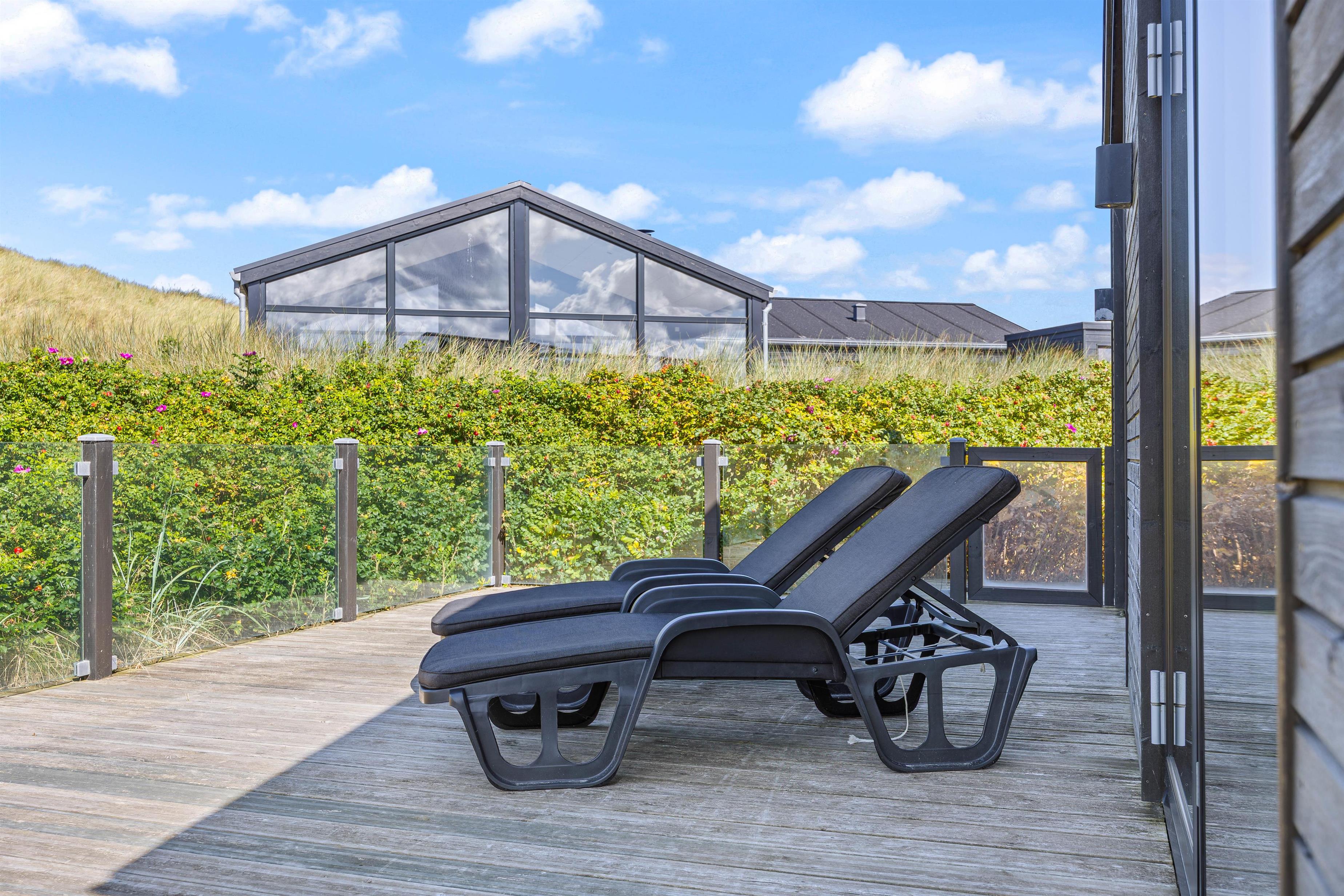Den fede træterrasse går stort set hele vejen rundt om huset, og der er masser af afskærmning, så I til enhver tid kan sidde i læ for den friske vestenvind. Nyd feriedagene i de gode havemøbler og liggestole, og følg solen rundt dagen lang på den store terrasse.