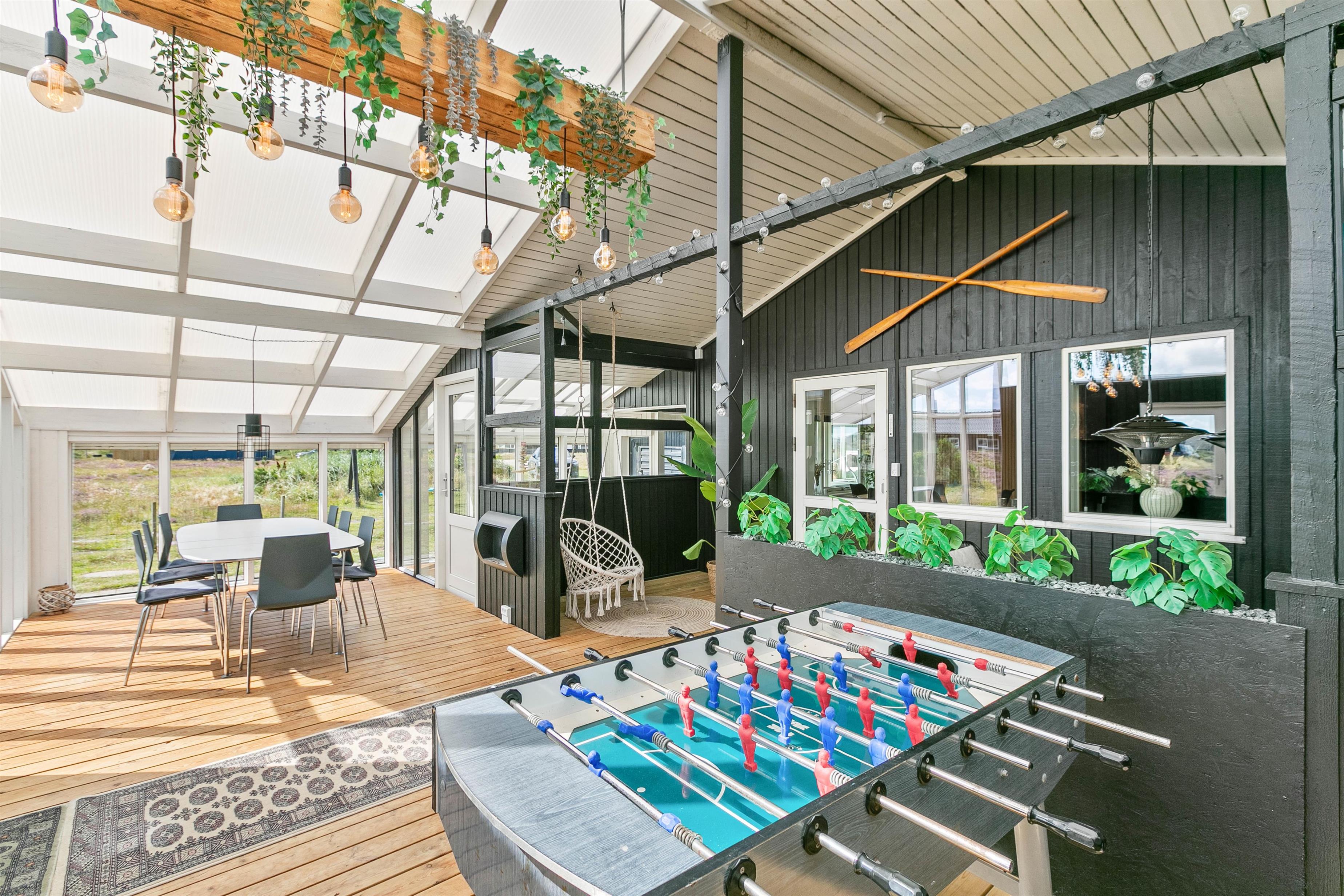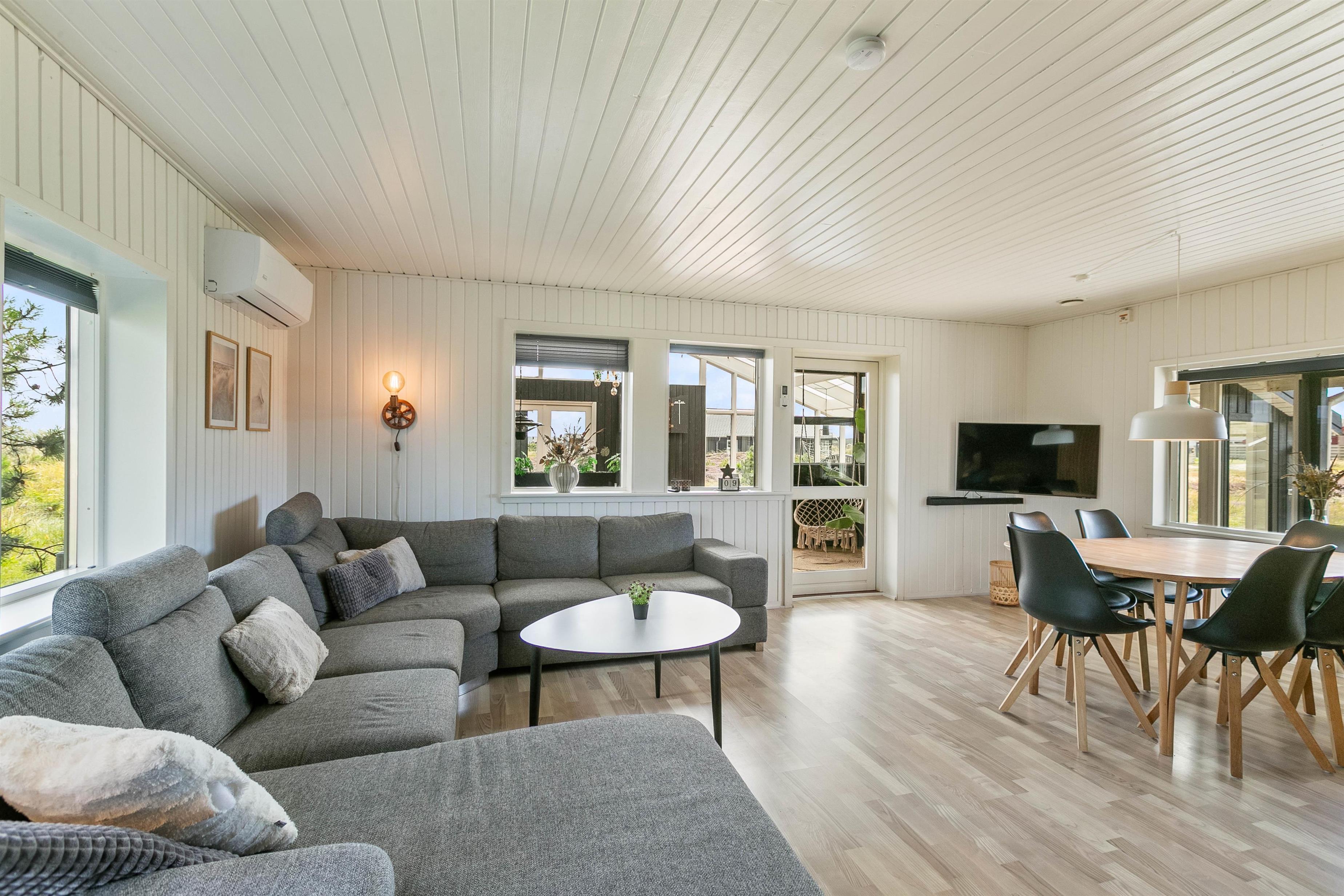 Så snart I træder ind i det hyggelige feriehus, vil I føle jer hjemme. Hjertet i sommerhuset er opholdsstuen med en varmende, knitrende brændeovn, som også skaber en ekstra hyggelig feriestemning på en regnvejrsdag. I udestuen kan I tilbringe mange afslappende timer og nyde en fin udsigt til det naturskønne landskab.