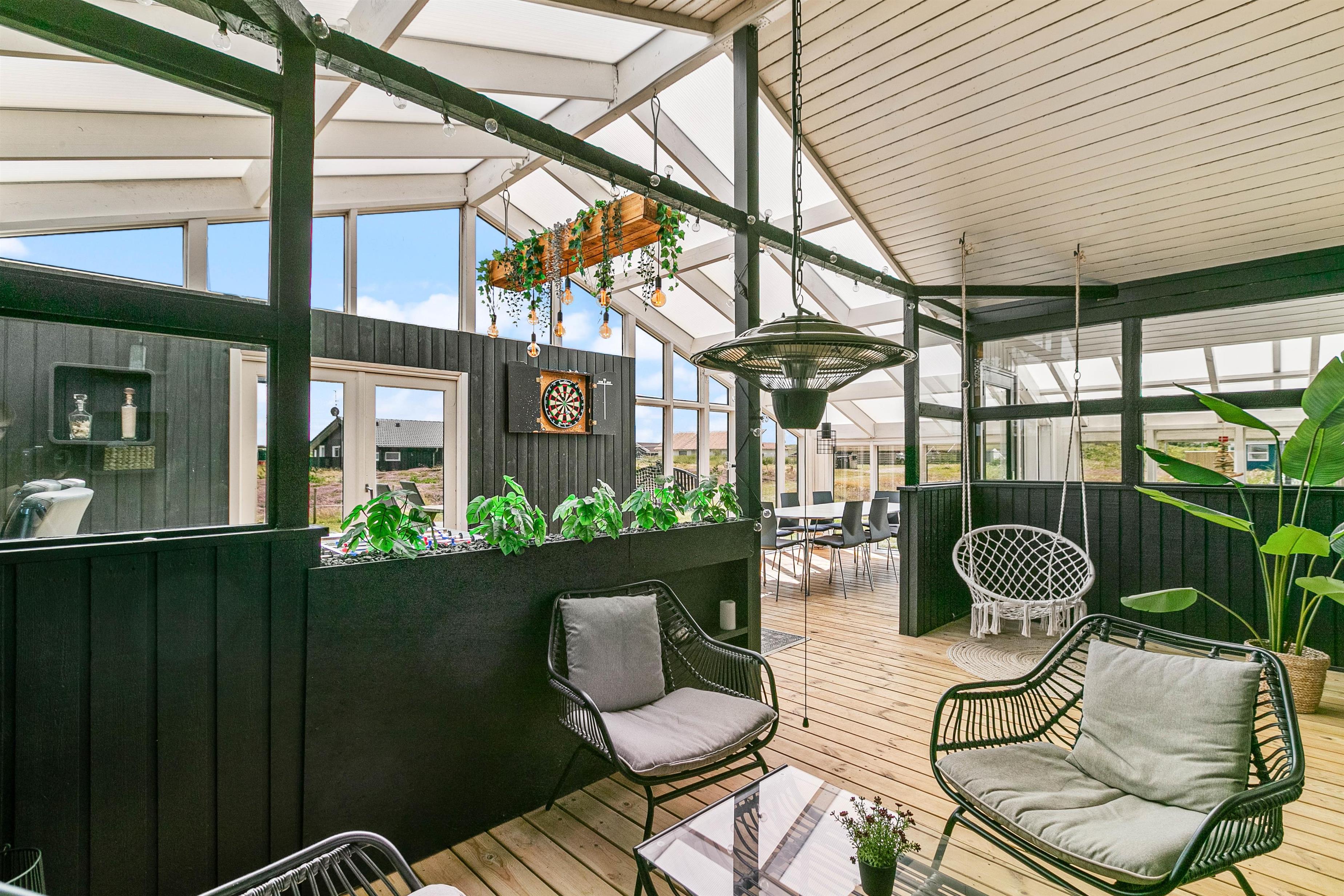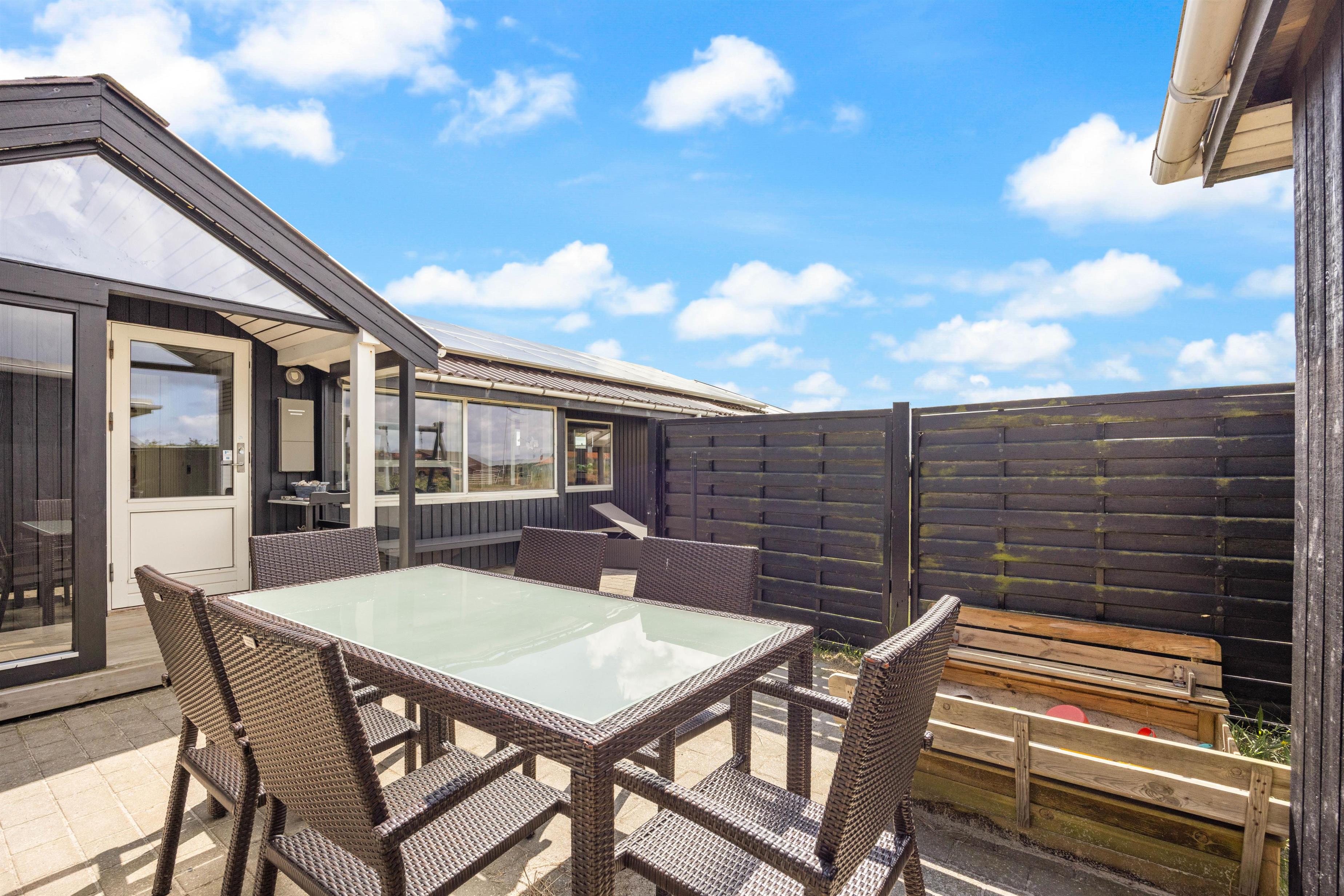 Sommerhuset har en skøn, åben terrasse, hvorfra I kan nyde den friske havluft i de komfortable havemøbler. Her er desuden en grill, så I kan slutte dagen af med et lækkert grillmåltid på en lun sommeraften.