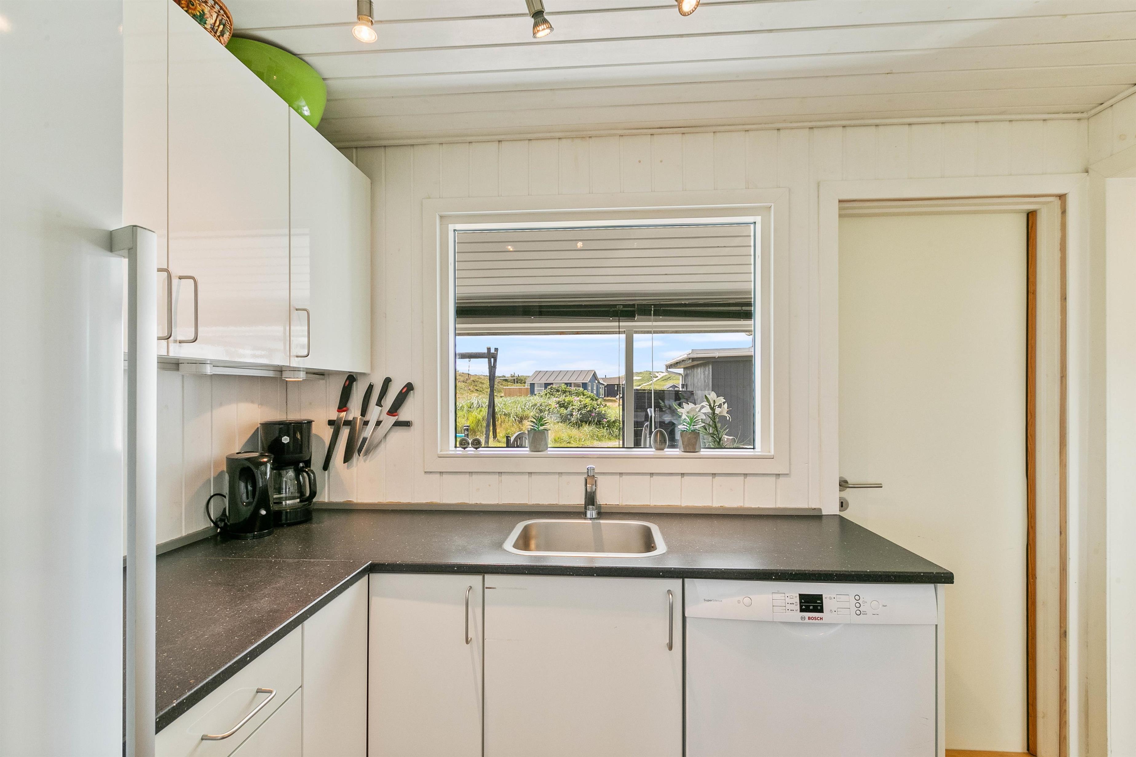 Sommerhuset har et praktisk udstyret køkken med køleskab, 120L fryser og mikroovn. Her kan familiens kok tilberede yndlingsretterne, mens opvaskemaskinen klarer opvasken.