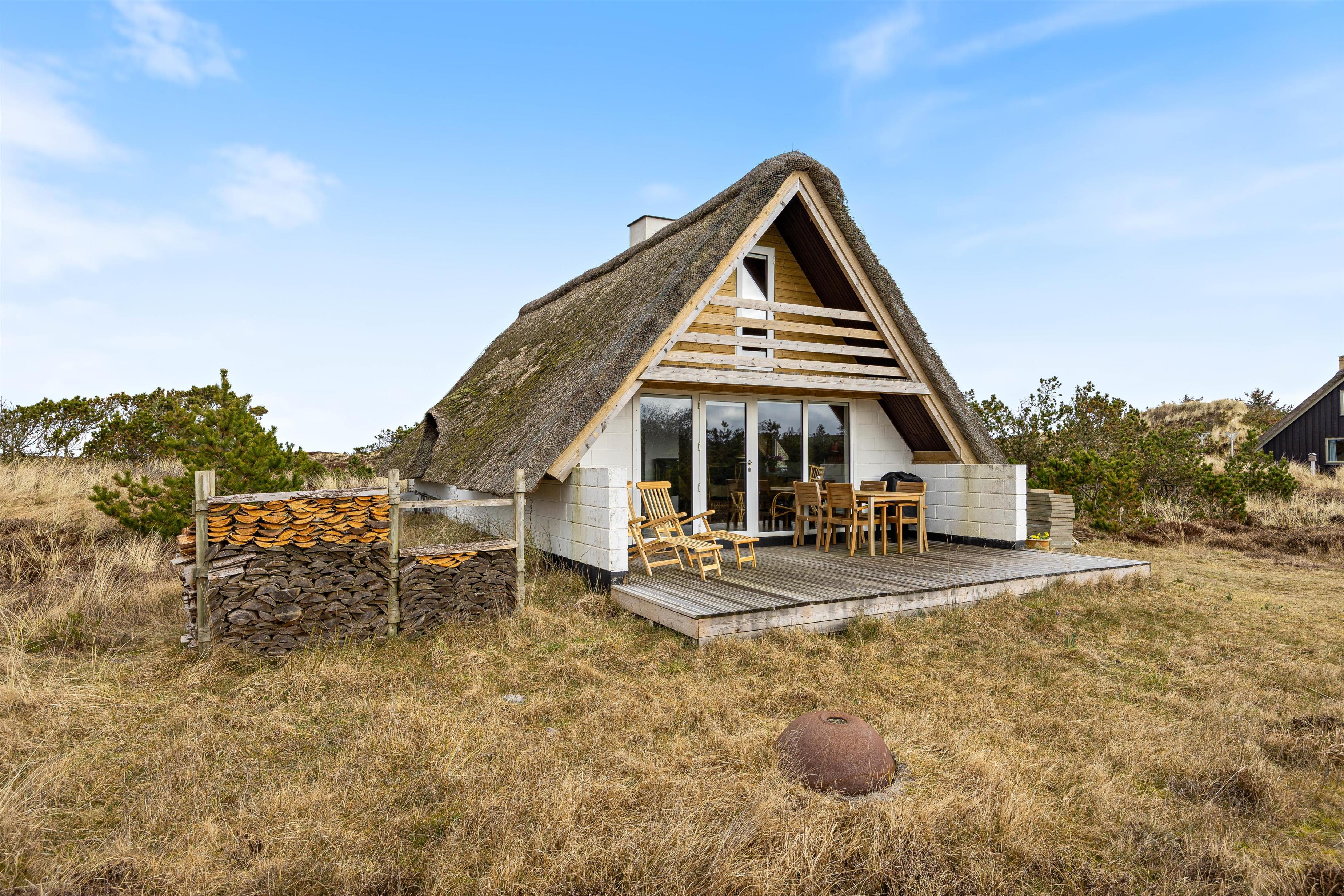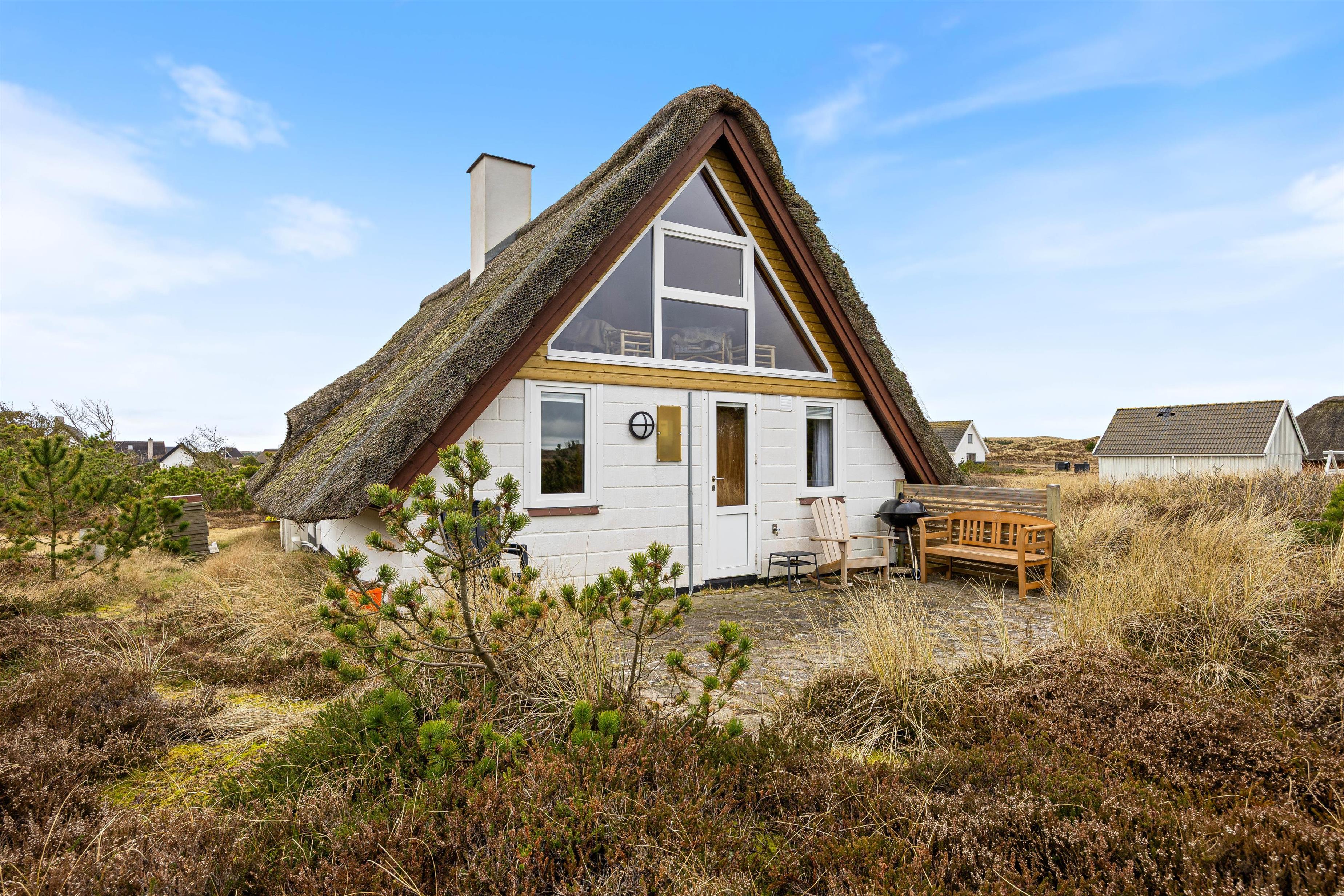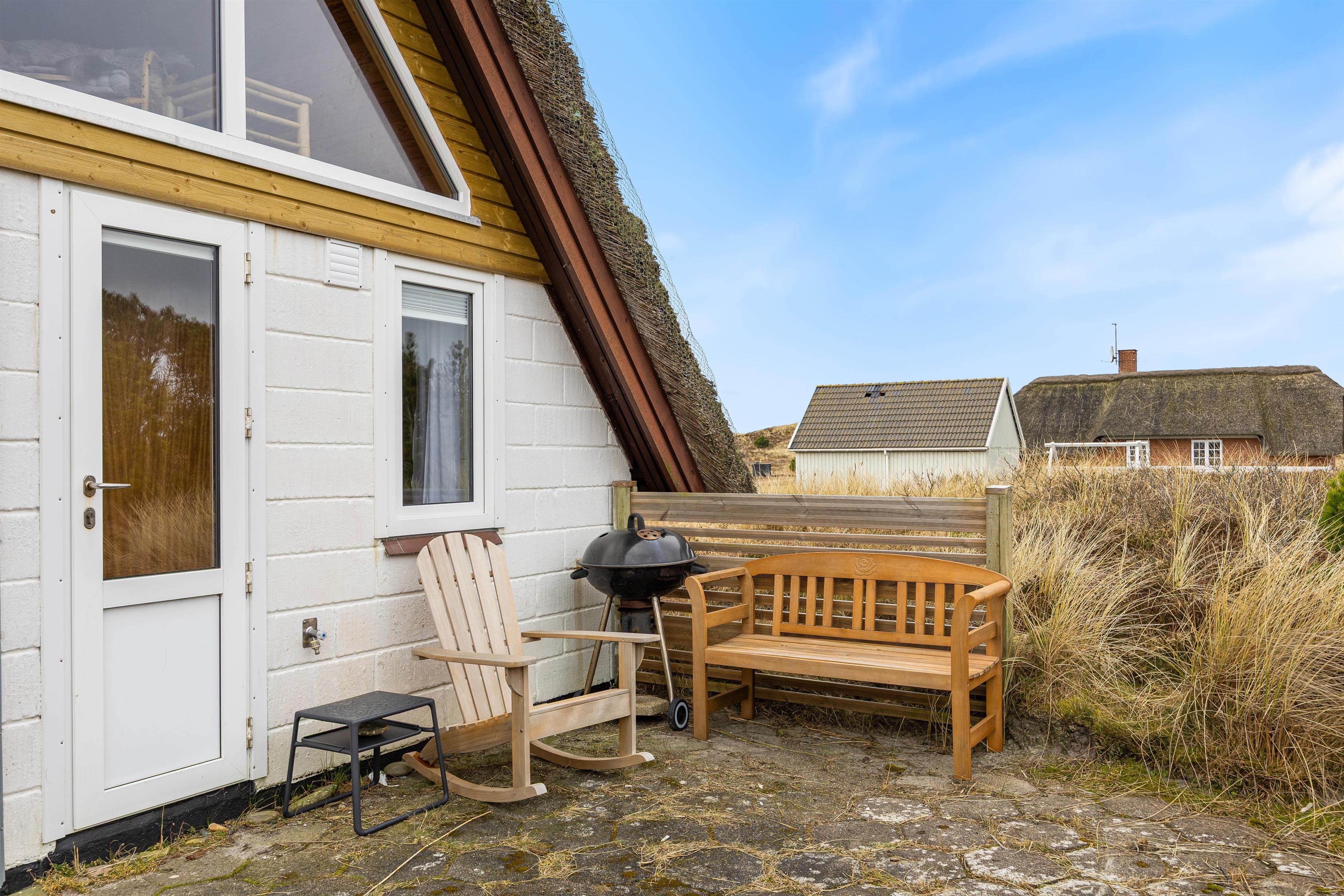 Også udenfor på terrassen kan I nyde ferien og de maleriske omgivelser. Sommerhuset er beliggende på en stor, smuk naturgrund med masser af plads til aktiviteter og afslappende øjeblikke. Her kan I nyde varme sommerdage og en lækker middag efter en lang dag ved Vesterhavet. Skønt er her en kulgrill, så I kan tilberede lækker sommermad til hele familien.