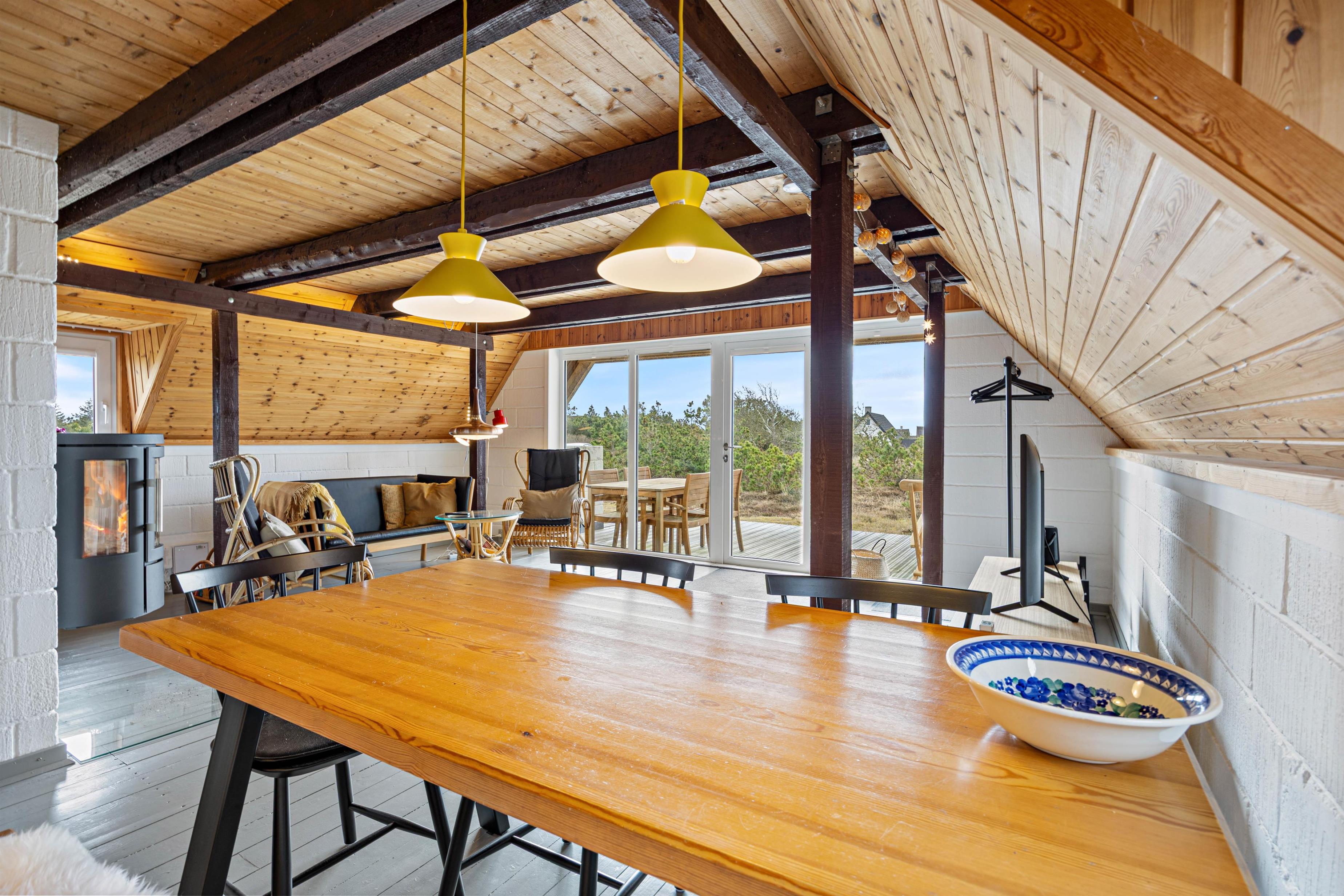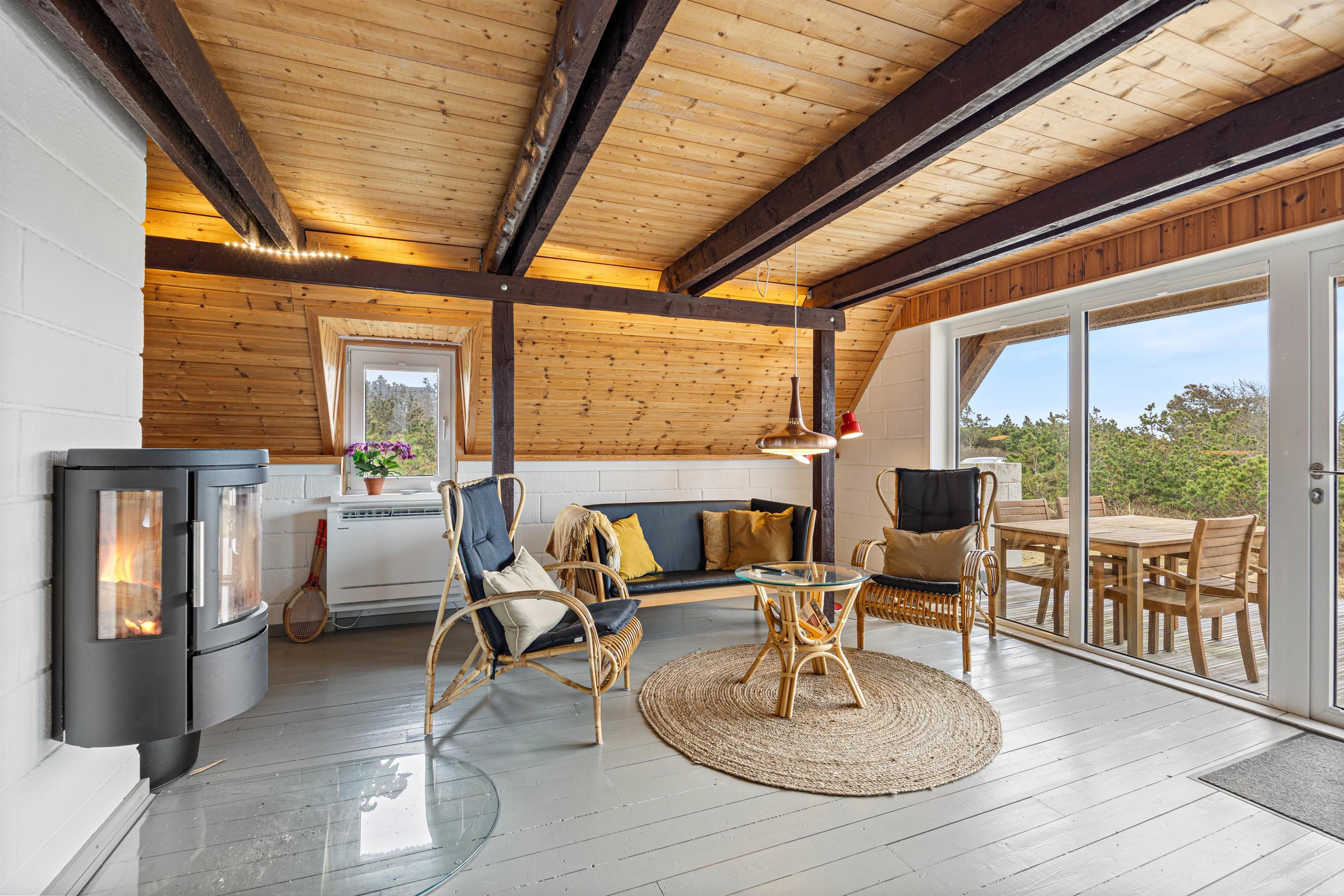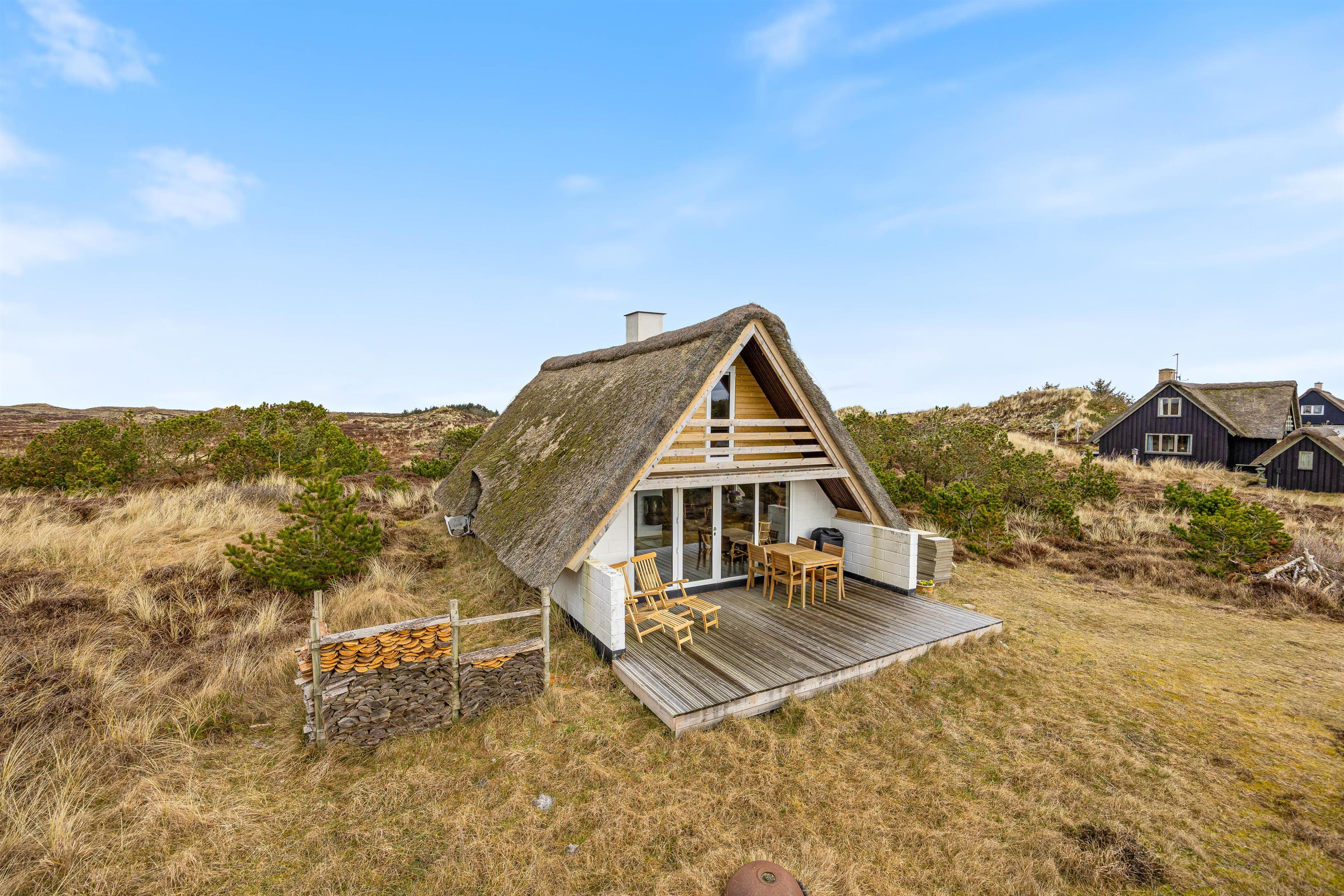 Også udenfor på terrassen kan I nyde ferien og de maleriske omgivelser. Sommerhuset er beliggende på en stor, smuk naturgrund med masser af plads til aktiviteter og afslappende øjeblikke. Her kan I nyde varme sommerdage og en lækker middag efter en lang dag ved Vesterhavet. Skønt er her en kulgrill, så I kan tilberede lækker sommermad til hele familien.