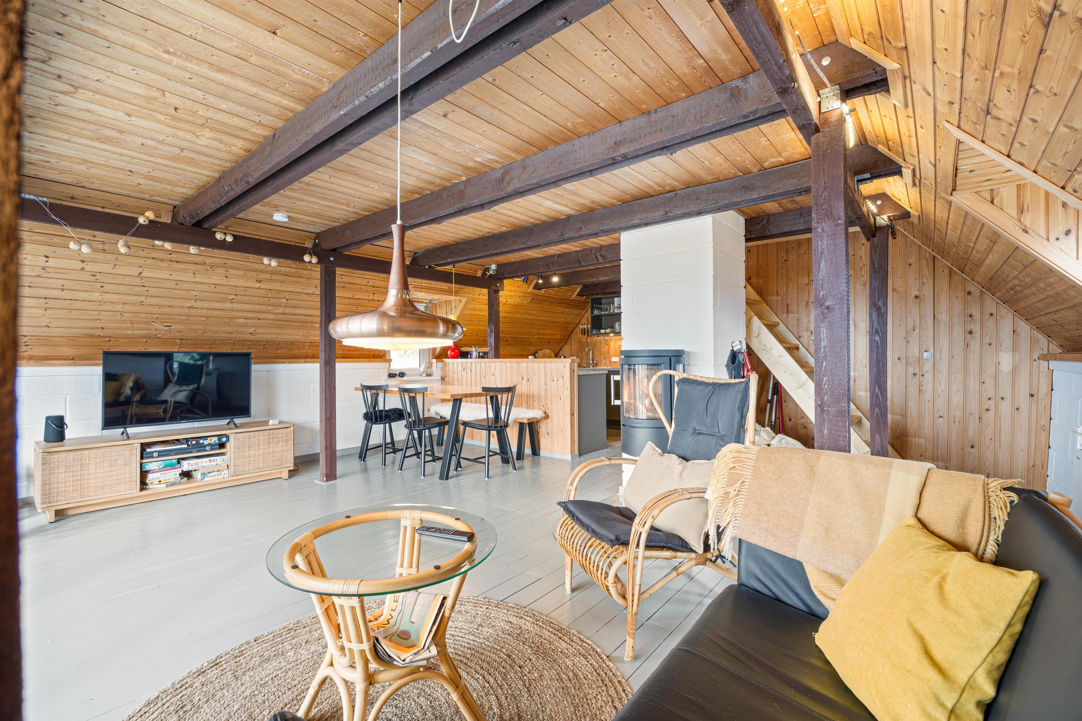 Sommerhusets hjerterum er opholdsrummet, der inviterer jer indenfor til skønne stunder foran den knitrende brændeovn. Her kan I slappe af på sofaen, holde spilleaftner eller fordybe jer i en god bog. Imens kan der laves dejlig mad i køkkenet, der er udstyret med separat 40L fryser og naturligvis en opvaskemaskine.