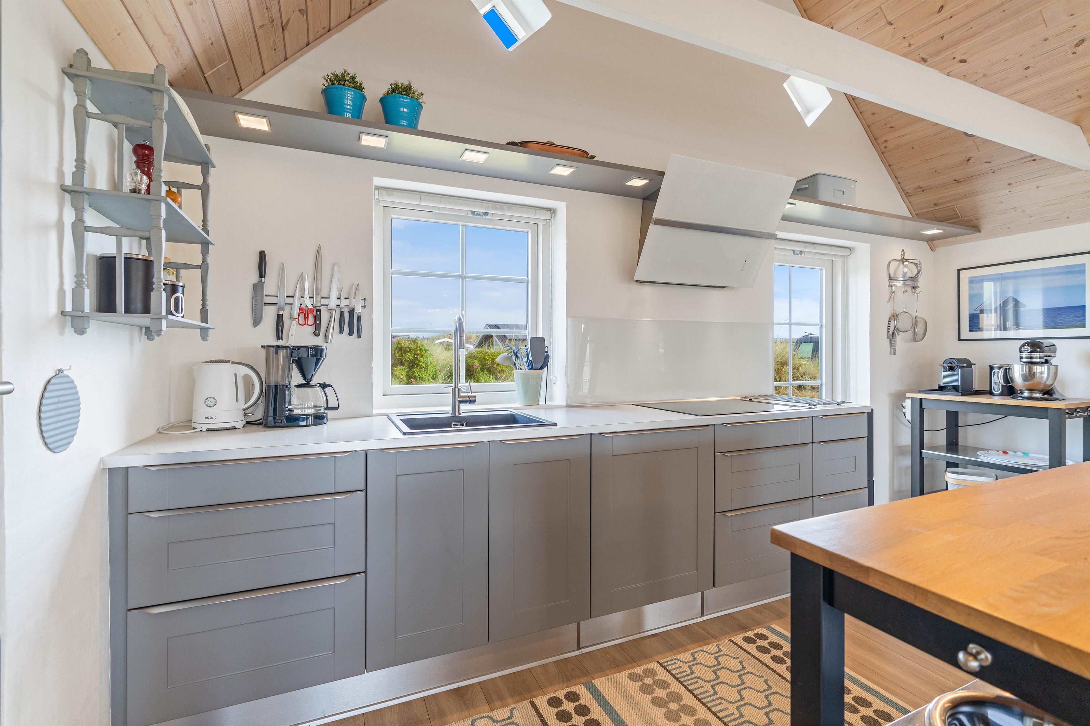 Fra første øjekast vil I blive mødt af den stilfulde indretning. Fra ende til anden er sommerhuset lyst og lækkert indrettet, og med et areal på 120 m² er der mere end god plads til 6 personer. Huset er indrettet med både soveværelser og badeværelser i begge ender, hvorfor huset er ideelt for 2 par, som ønsker at holde ferie sammen, eller for en familie med ældre børn, som har mulighed for at trække sig tilbage i deres egen afdeling.