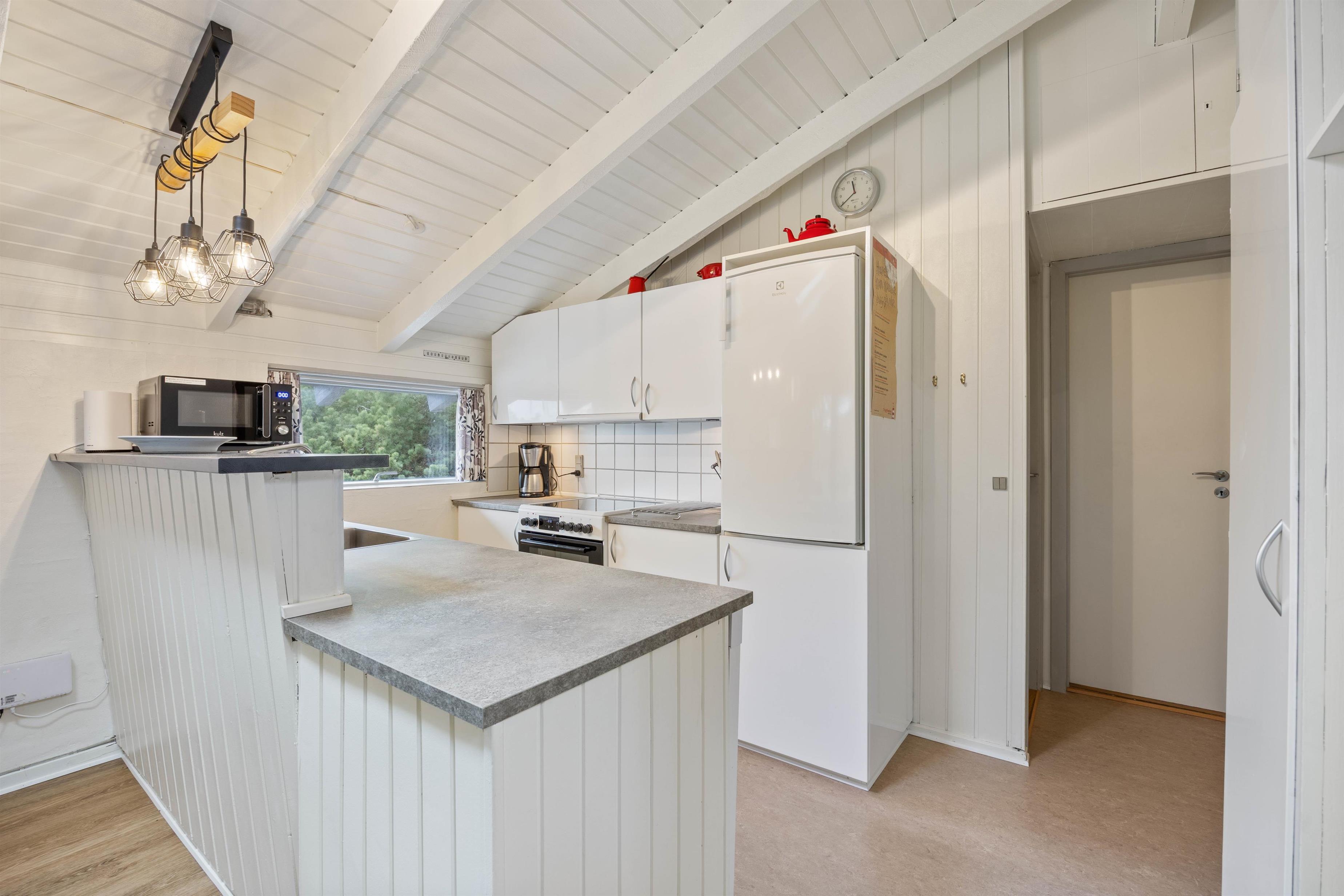 Her er en virkelig charmerende indretning, hvor de lyse lofter og de sorte kontrastfarvede bjælker giver det helt rigtige indtryk af rummelighed. Det velfungerende køkken er adskilt fra resten af rummet med en halvmur, så spisekrog og opholdsrum fremstår som selvstændige afdelinger af sommerhuset.