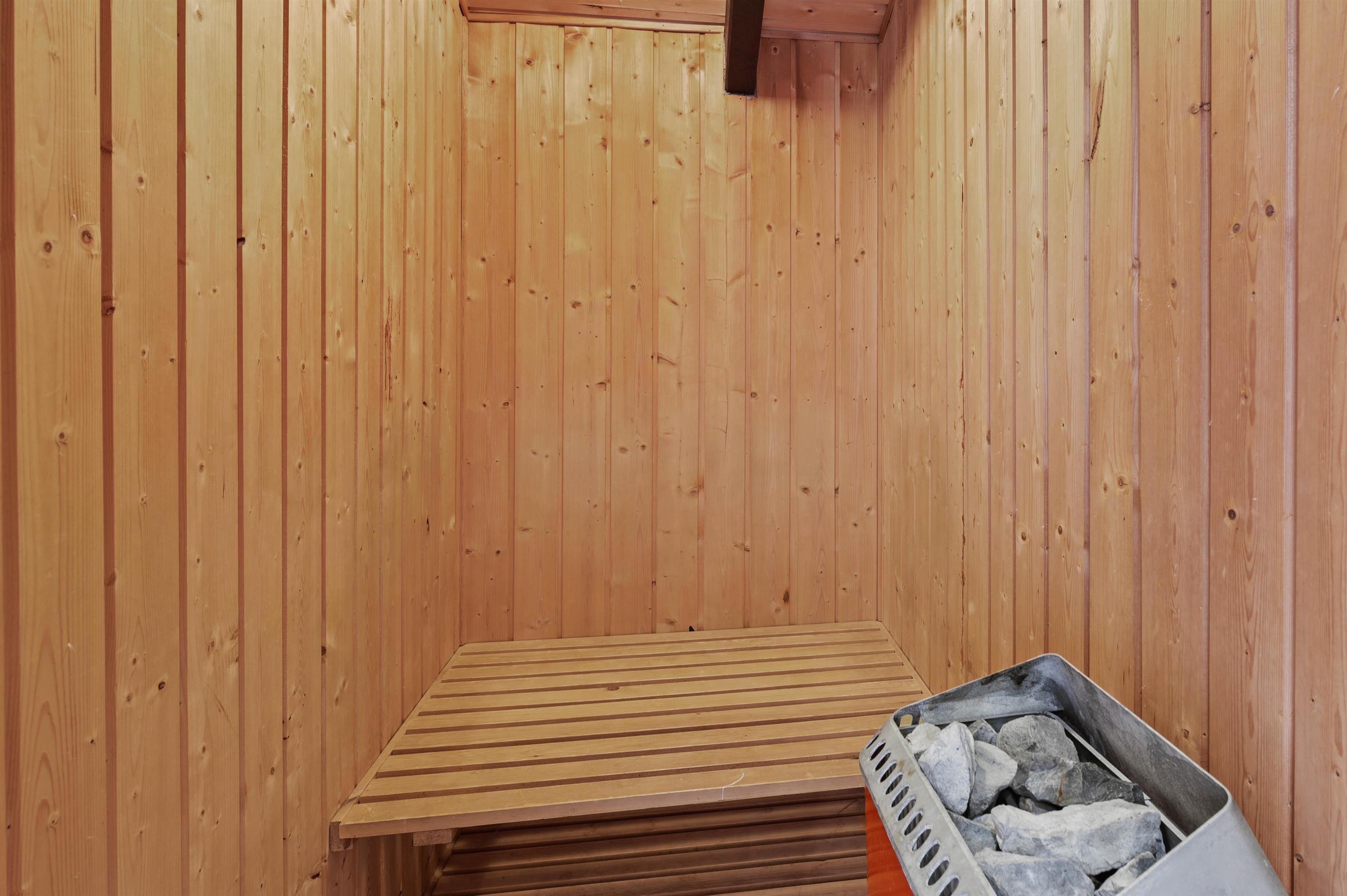 I den komfortable opholdsafdeling er der mulighed for afslapning i den store sofa og både brændeovn og fladskærms-TV understreger den hyggelige atmosfære. Sommerhuset opvarmes af en energibesparende varmepumpe m/aircondition, og saunaen i forbindelse med det gode badeværelse indbyder til afstressning på ferien.