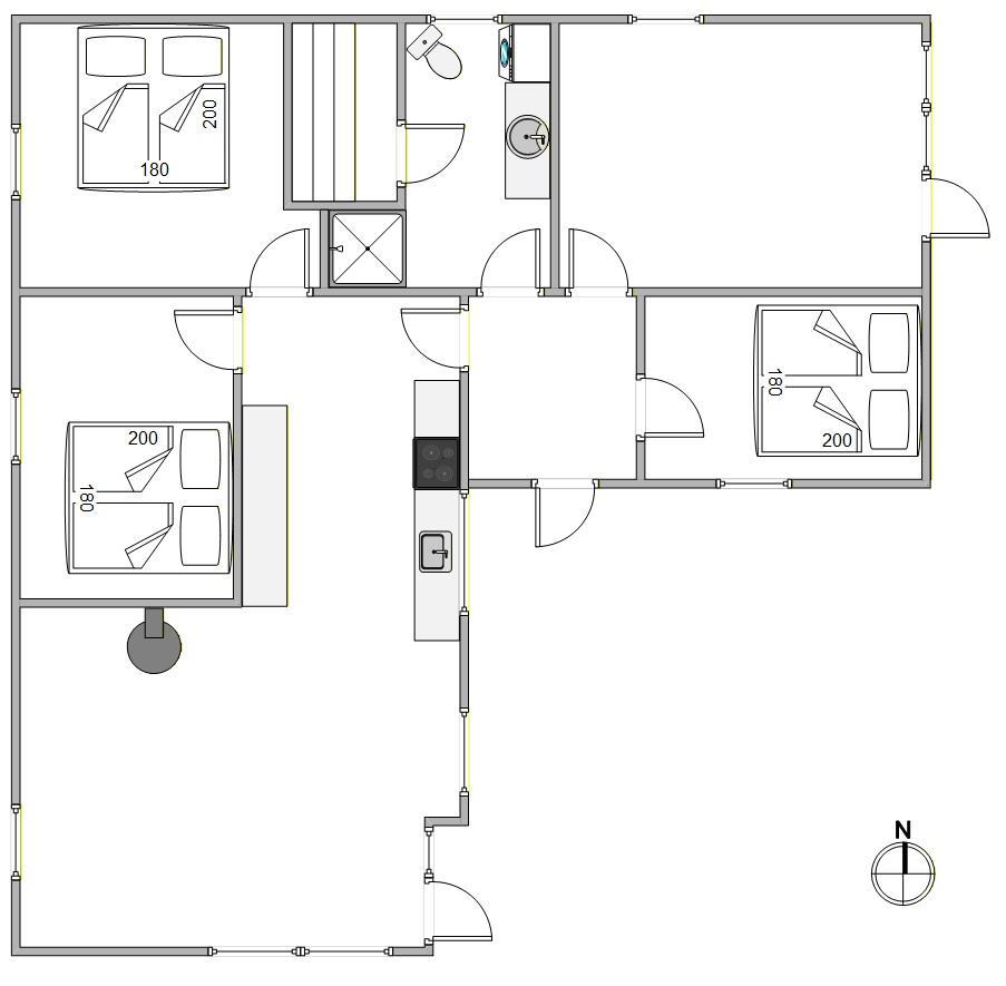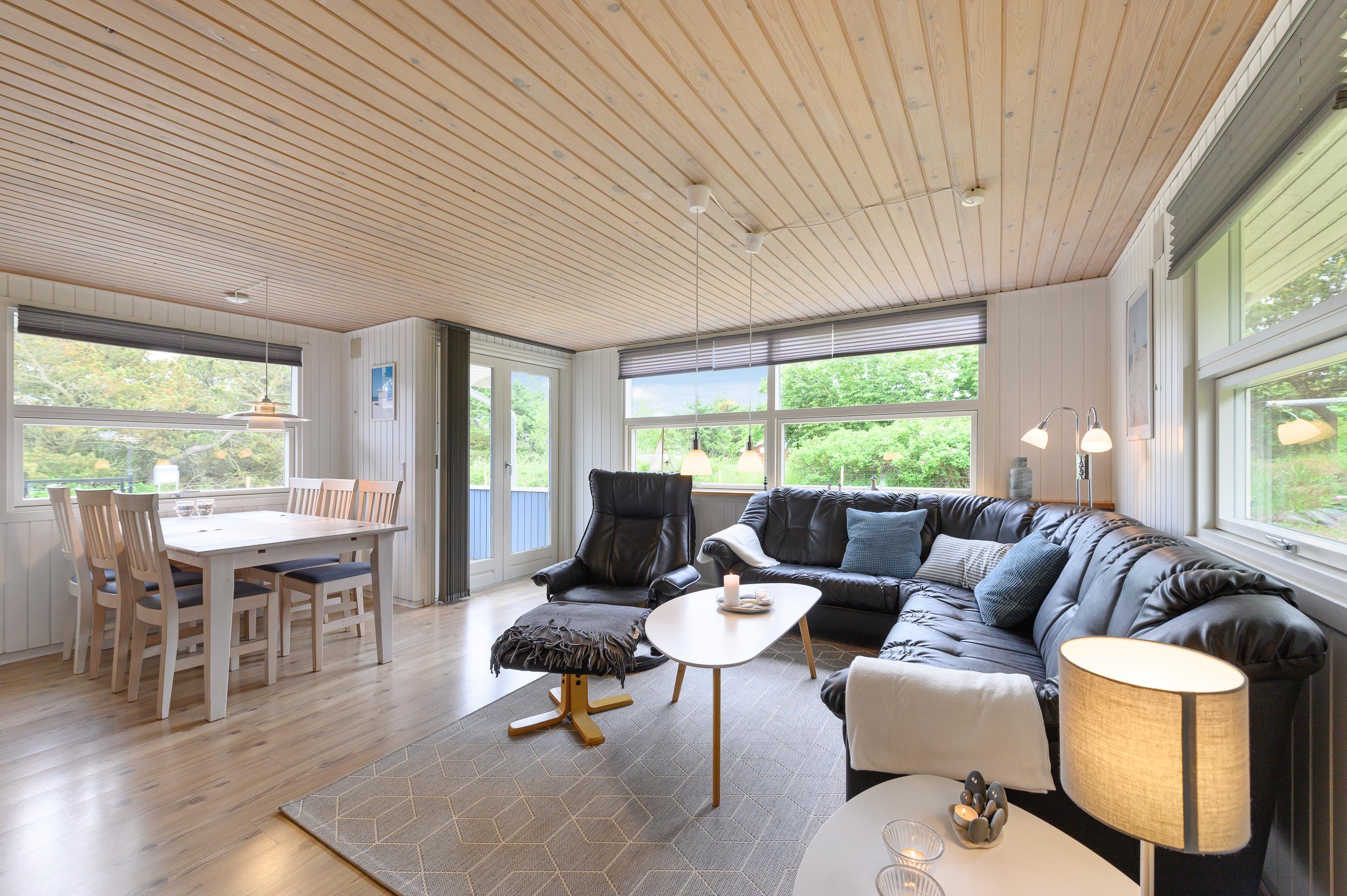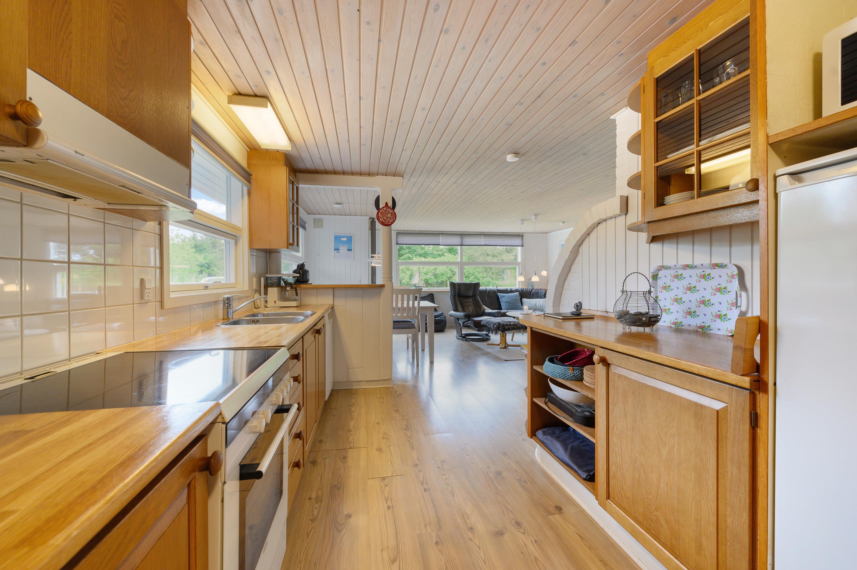 Feriehuset er renoveret i 2020. De hvidmalede vægge står i fin kontrast til de flotte gennemgående gulve og lofter i køkken/alrum og stue, og køkkenelementerne i træ giver rummet et varmt look. Fra køkkenet er der fri adgang til den åbne stue. Her er rammerne sat til børnehygge ved spisebordet, mens der kokkereres i det funktionelle køkken. Der er god skabsplads i køkkenet, og opvaskemaskinen klarer opvasken efter dagens måltider.