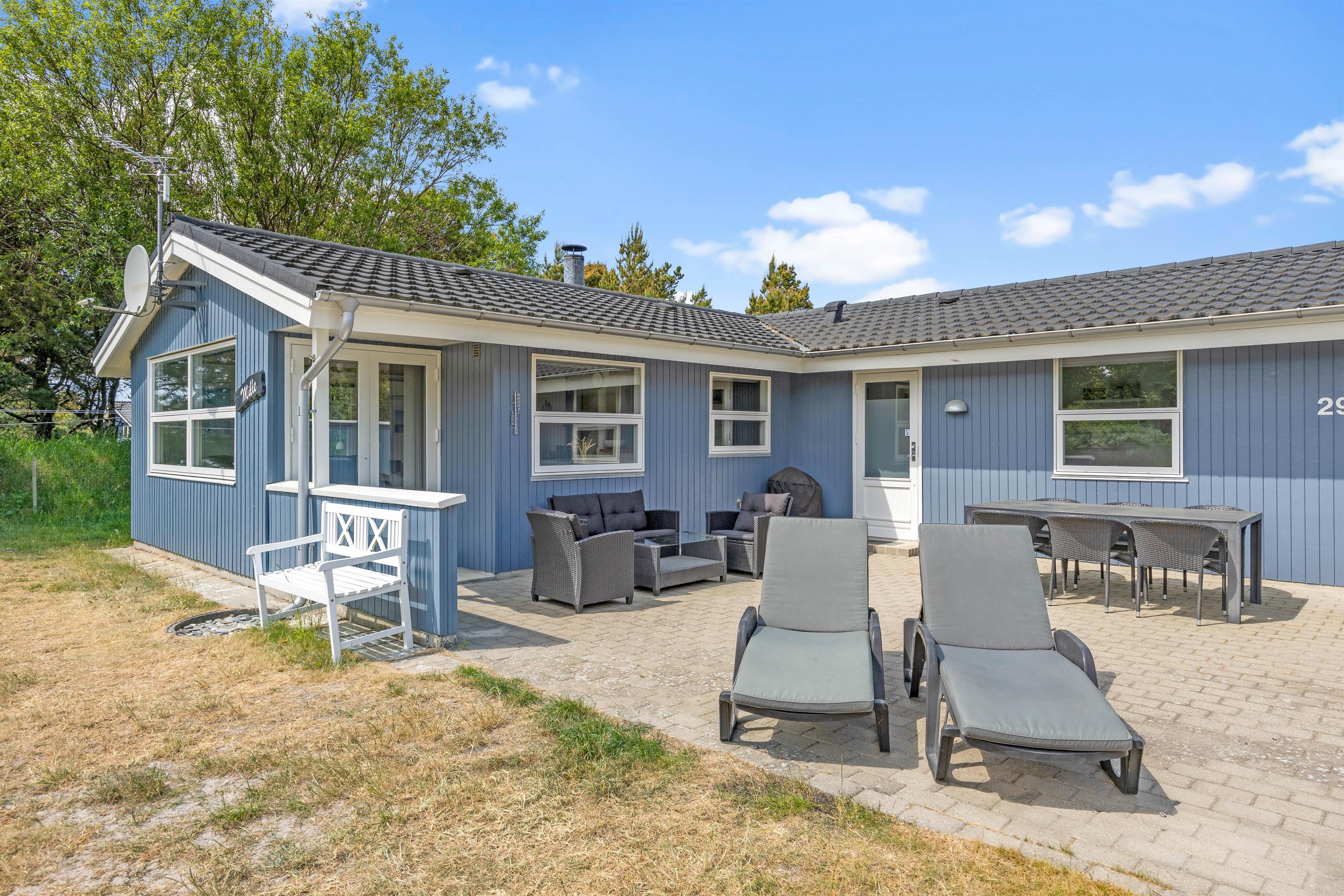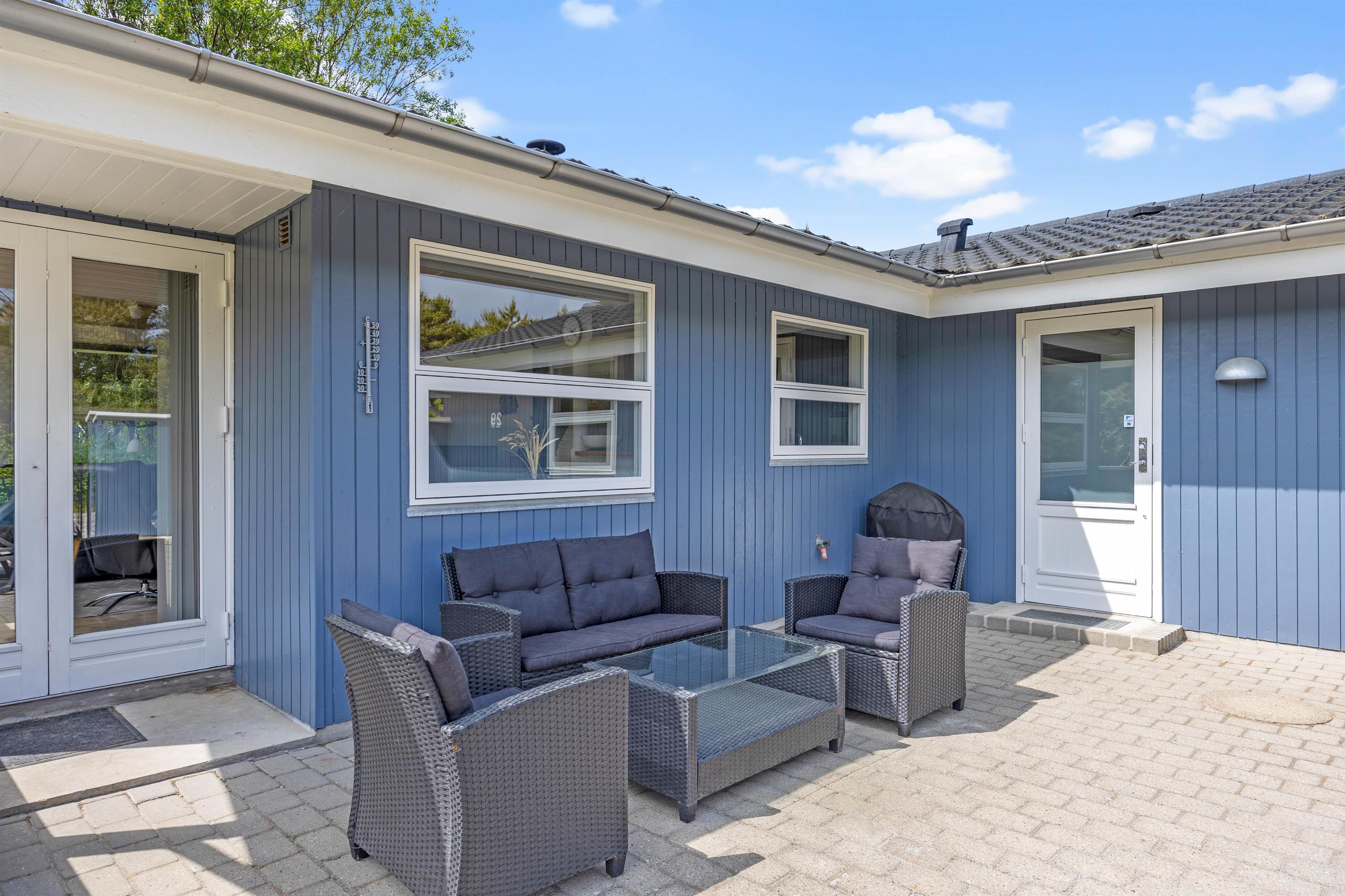 Sommerhusets fliseterrasse og plænen er indhegnet, så I kan roligt lade børnene boltre sig i haven og hunden løbe frit, mens der hygges ved grillen.