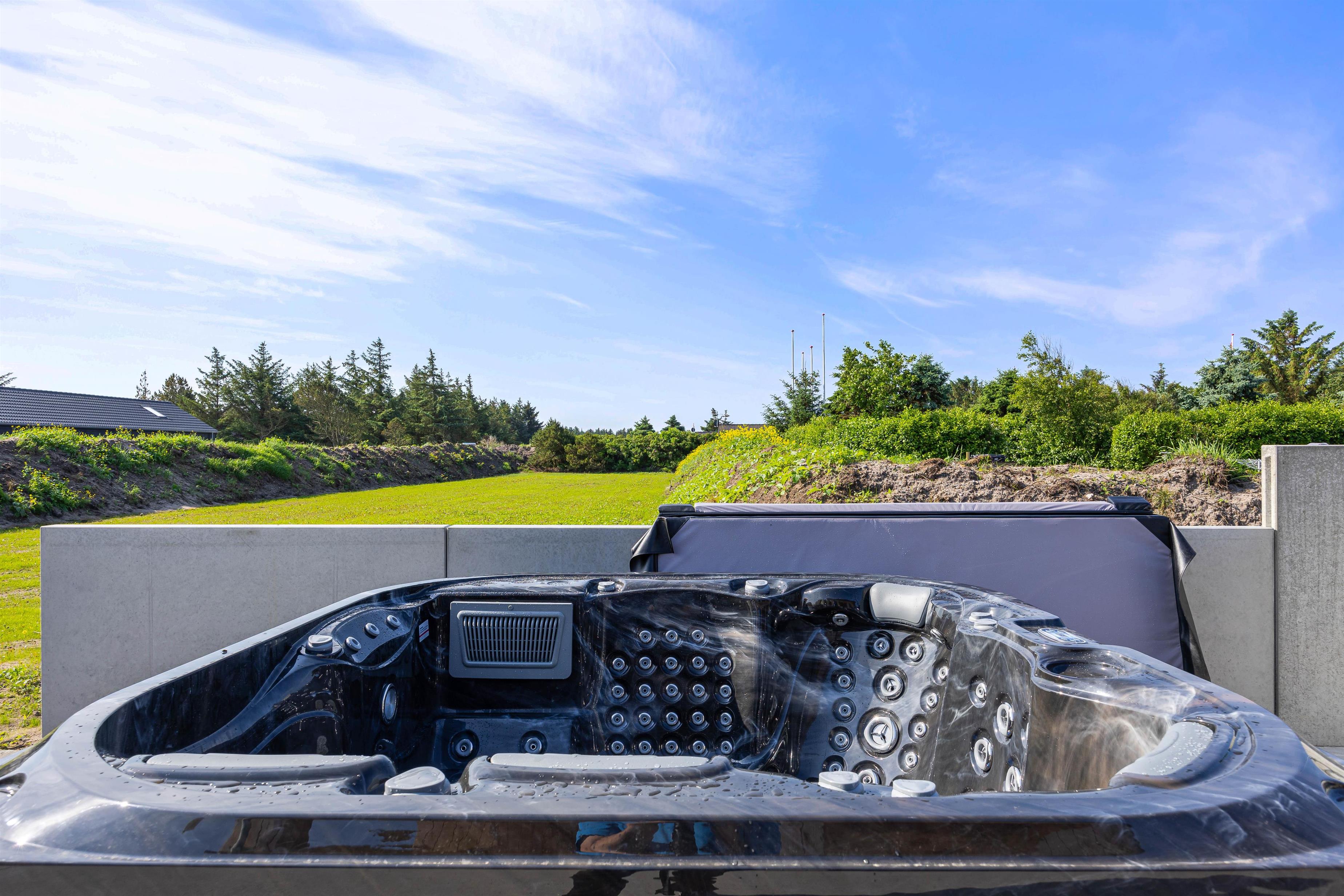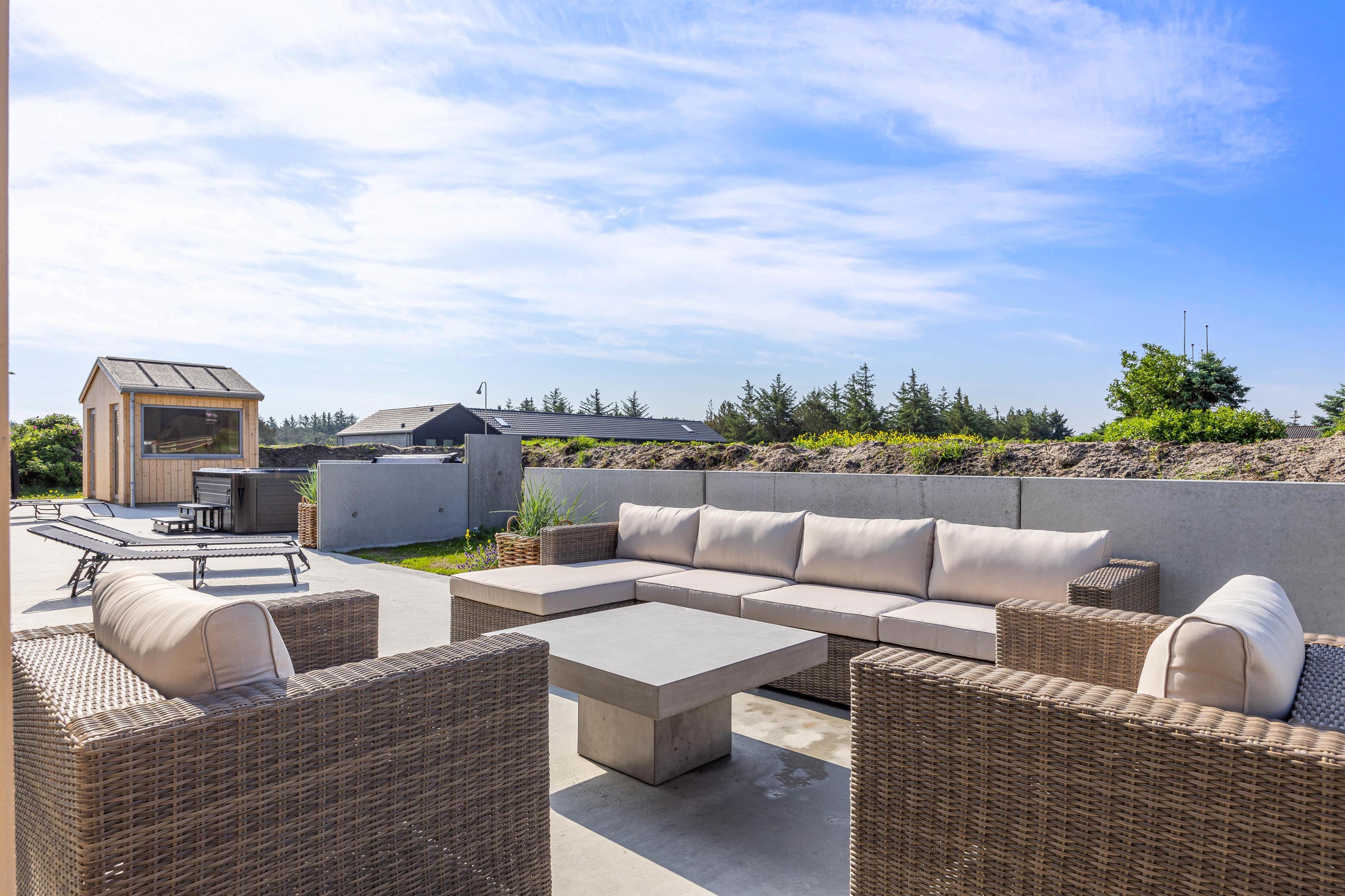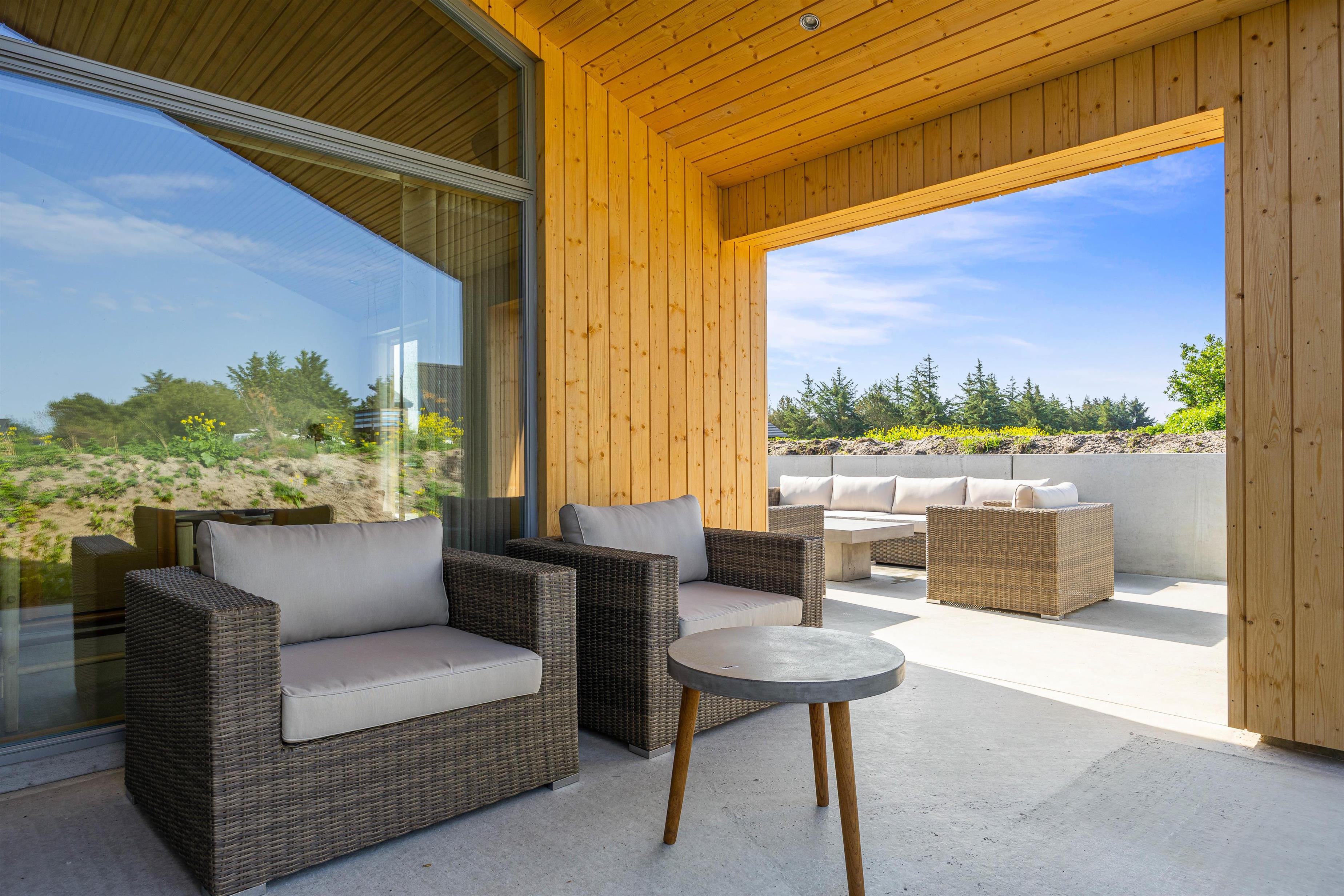 Den fine terrasse har både en afskærmet og en overdækket del, så I kan rykke rundt efter solen. Tag solbad i liggestolene eller slap af i havemøblerne. Har I brug for mere aktivitet, kan I udfordre børnene i et spil viking på plænegrunden. Tænd op i grillen til aften og nyd et lækkert grillmåltid sammen. Måske skal teenagerne stå for menuen denne dag. I kan stadig nå en spadseretur til stranden og opleve solnedgangen i Vesterhavet – det er altid en imponerende oplevelse. Udebruseren og udespaen kan I benytte, lige når det passer jer - wellness på en kølig dag eller under stjernehimlen med et glas vin. Udebruseren er tilgængelig fra april til november.