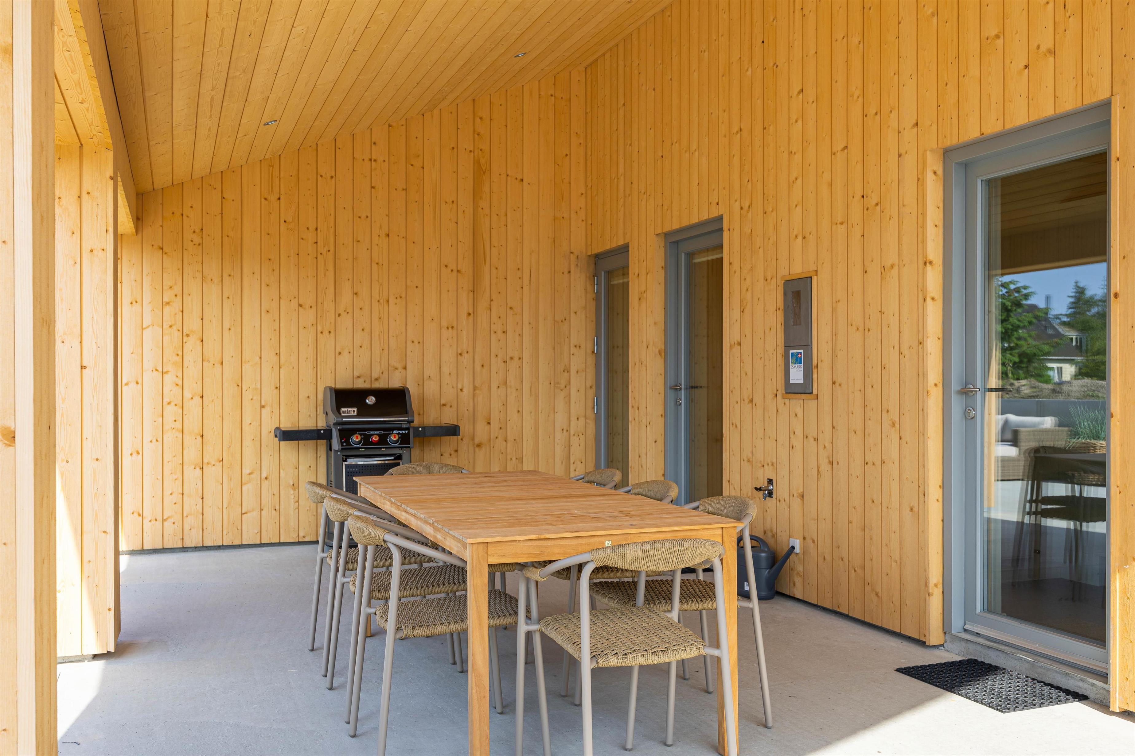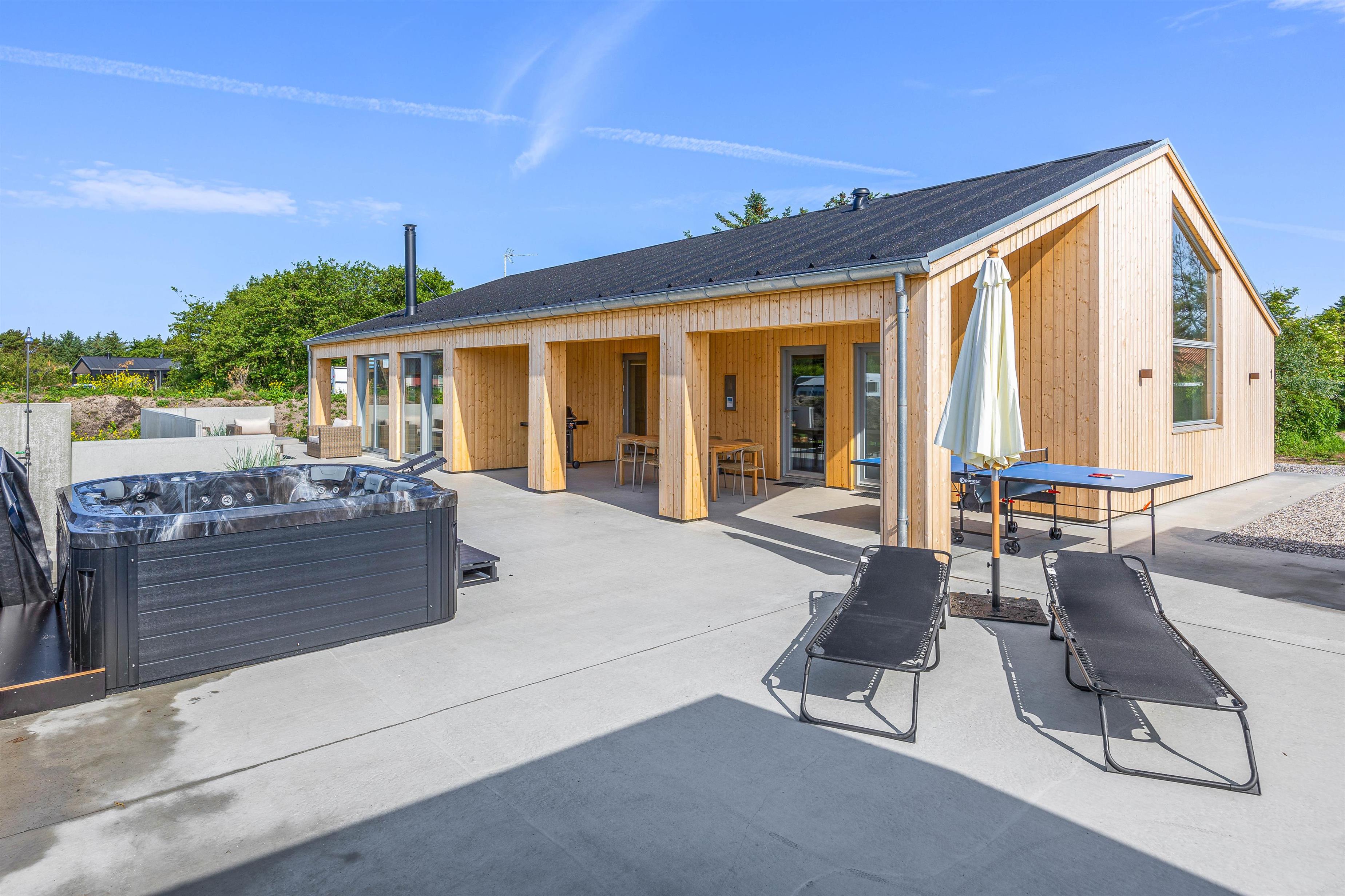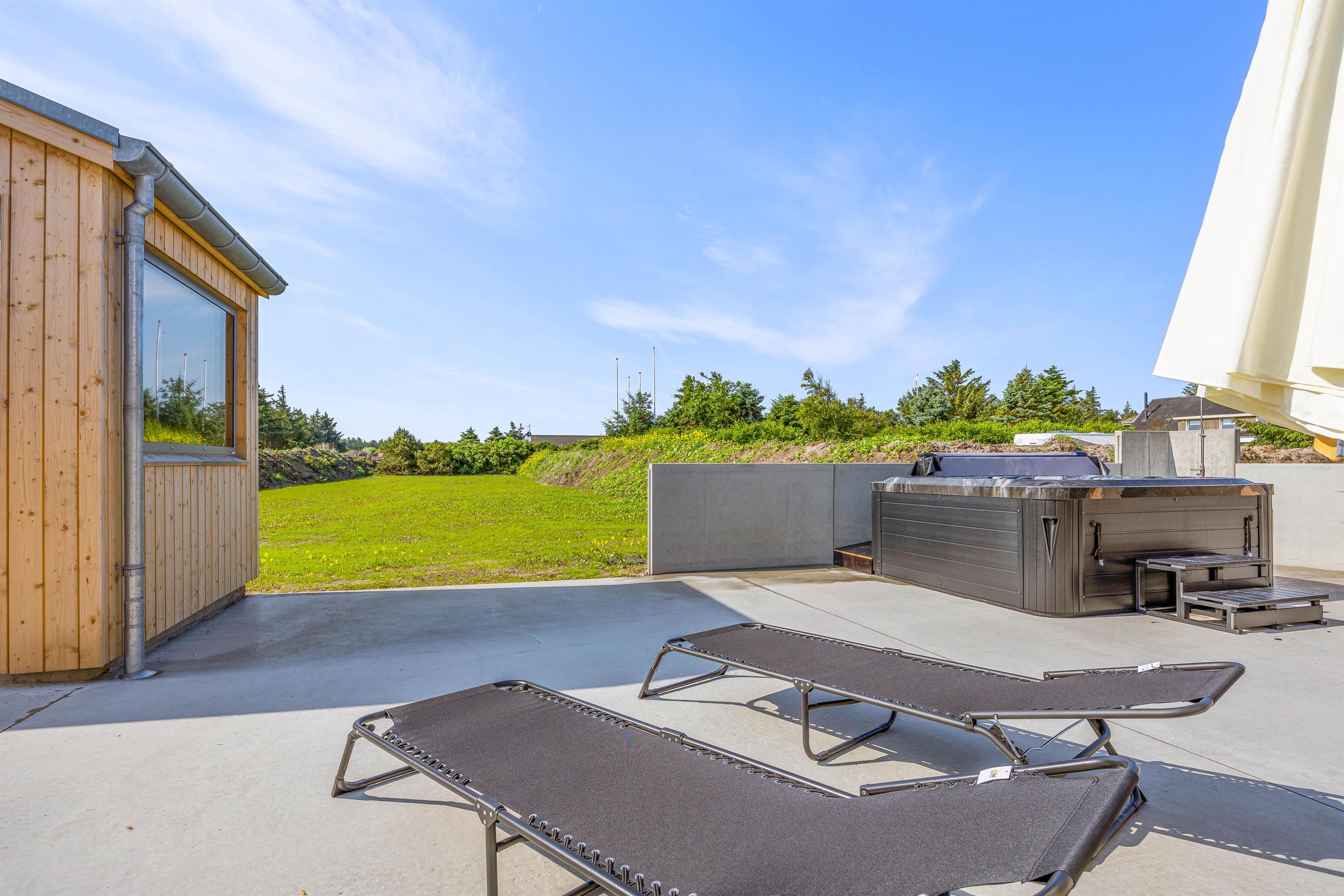 Den fine terrasse har både en afskærmet og en overdækket del, så I kan rykke rundt efter solen. Tag solbad i liggestolene eller slap af i havemøblerne. Har I brug for mere aktivitet, kan I udfordre børnene i et spil viking på plænegrunden. Tænd op i grillen til aften og nyd et lækkert grillmåltid sammen. Måske skal teenagerne stå for menuen denne dag. I kan stadig nå en spadseretur til stranden og opleve solnedgangen i Vesterhavet – det er altid en imponerende oplevelse. Udebruseren og udespaen kan I benytte, lige når det passer jer - wellness på en kølig dag eller under stjernehimlen med et glas vin. Udebruseren er tilgængelig fra april til november.