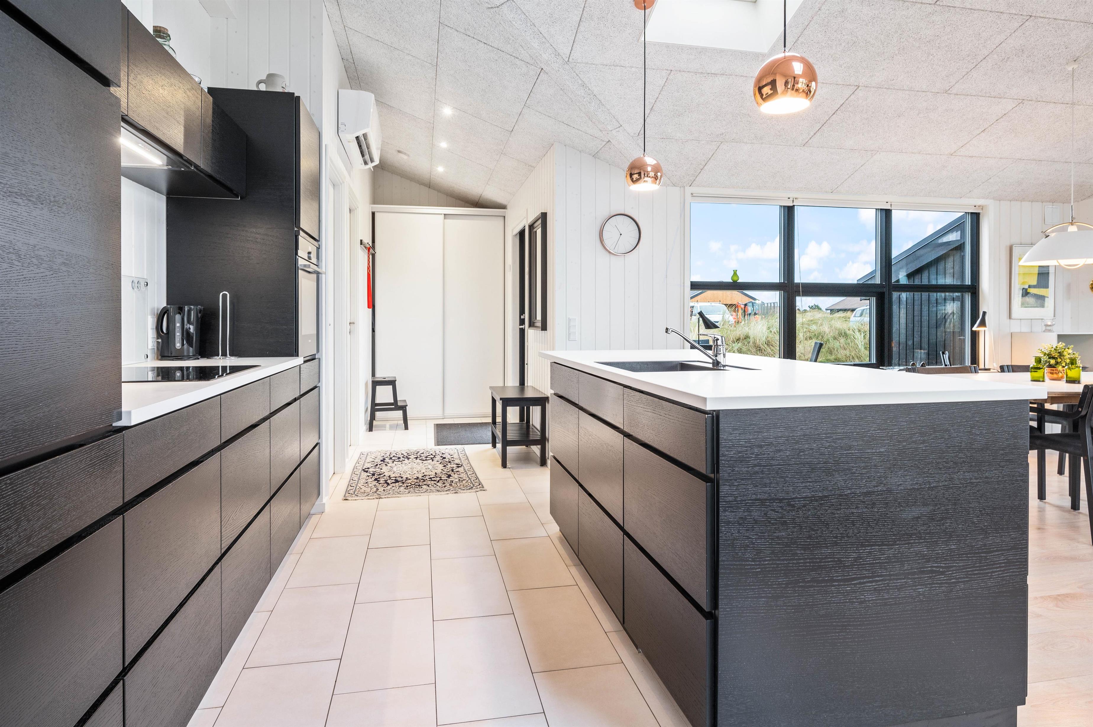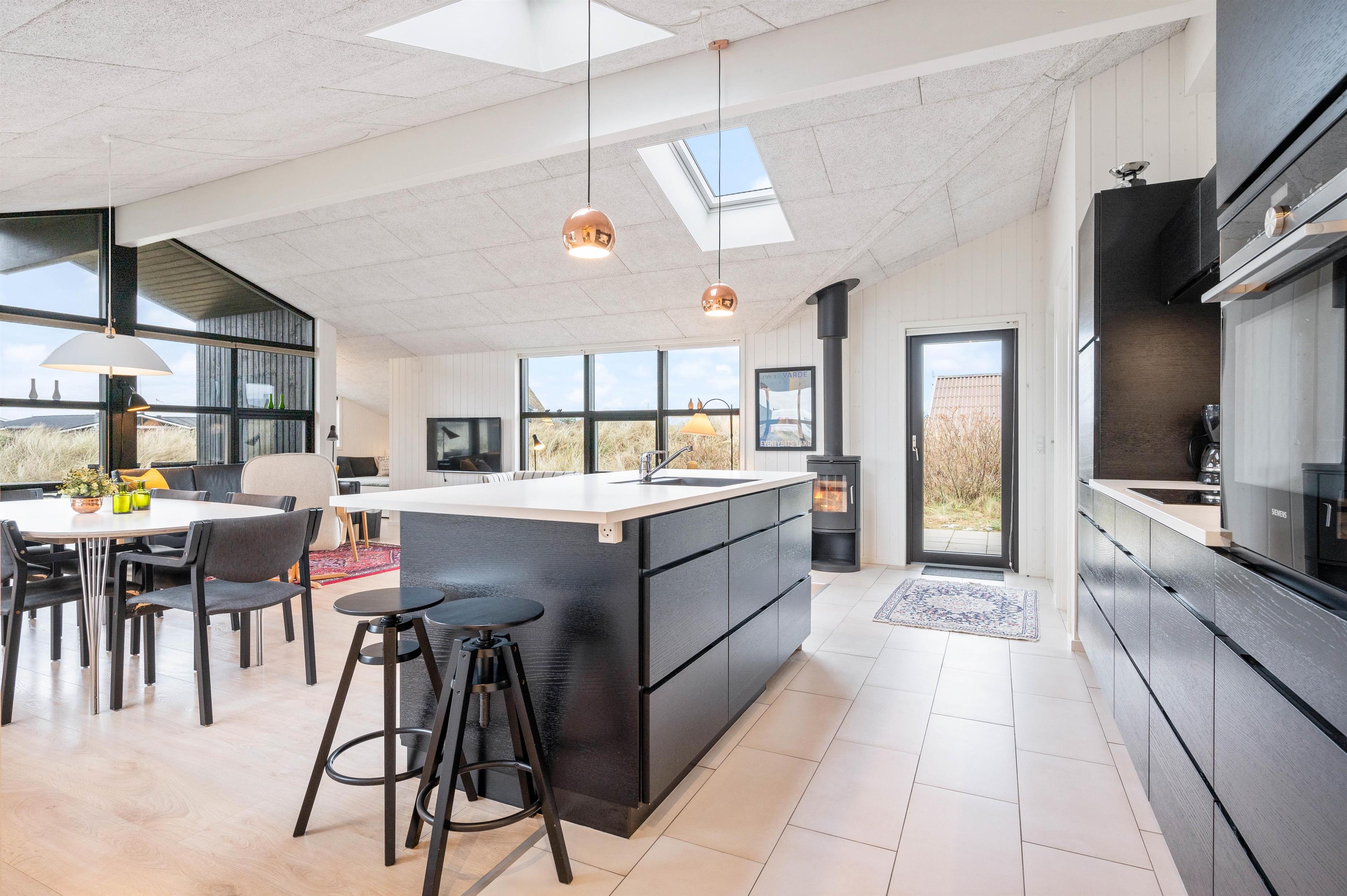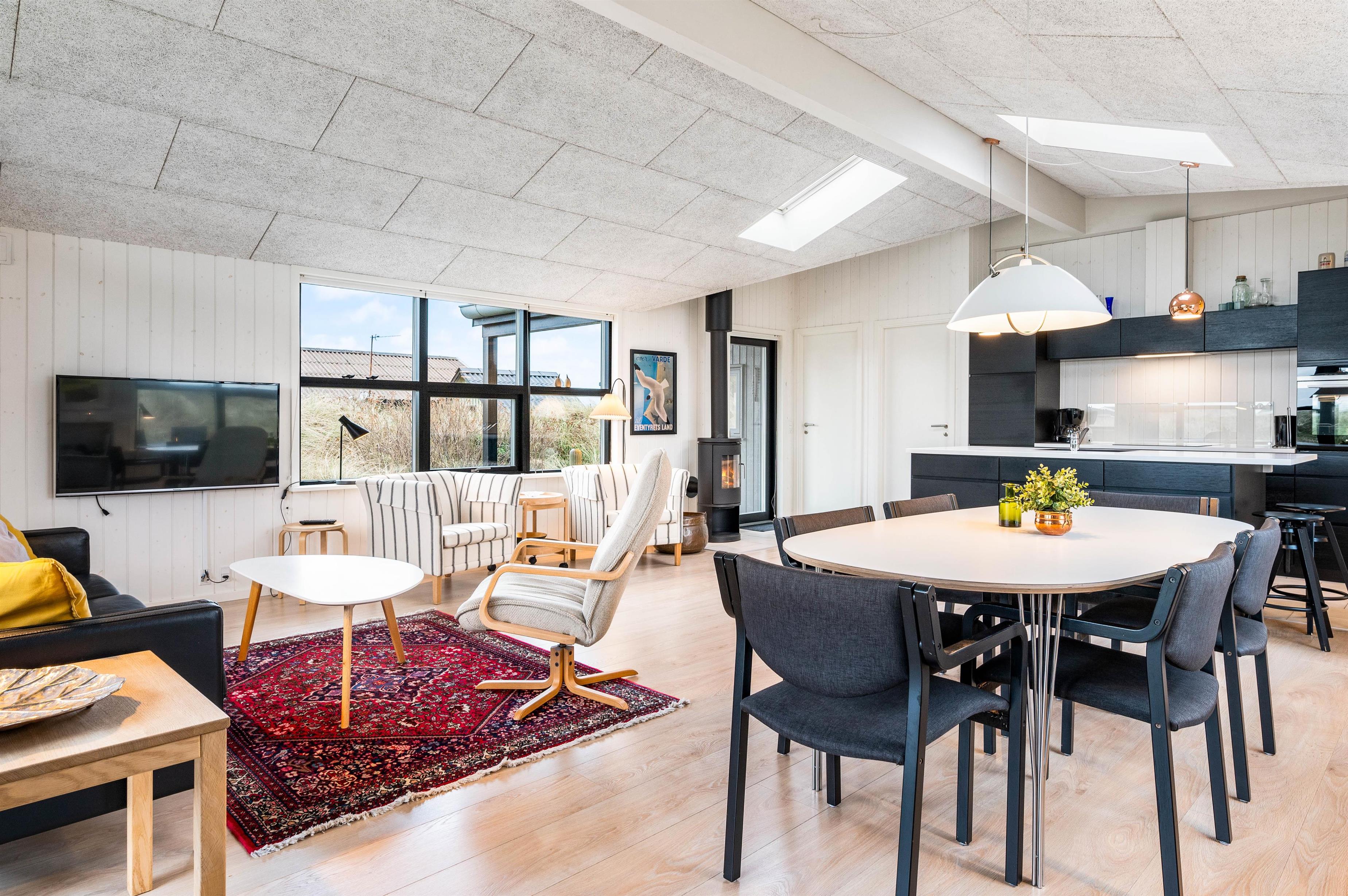 I dette feriehus mødes I af en gennemtænkt indretning med masser af lys og en behagelig stemning. Sommerhusets hjerte er det åbne køkkenalrum, hvor hele familien kan samles. Brændeovnen skaber hyggelig varme på køligere aftener, mens den energibesparende varmepumpe sikrer et behageligt indeklima året rundt.
