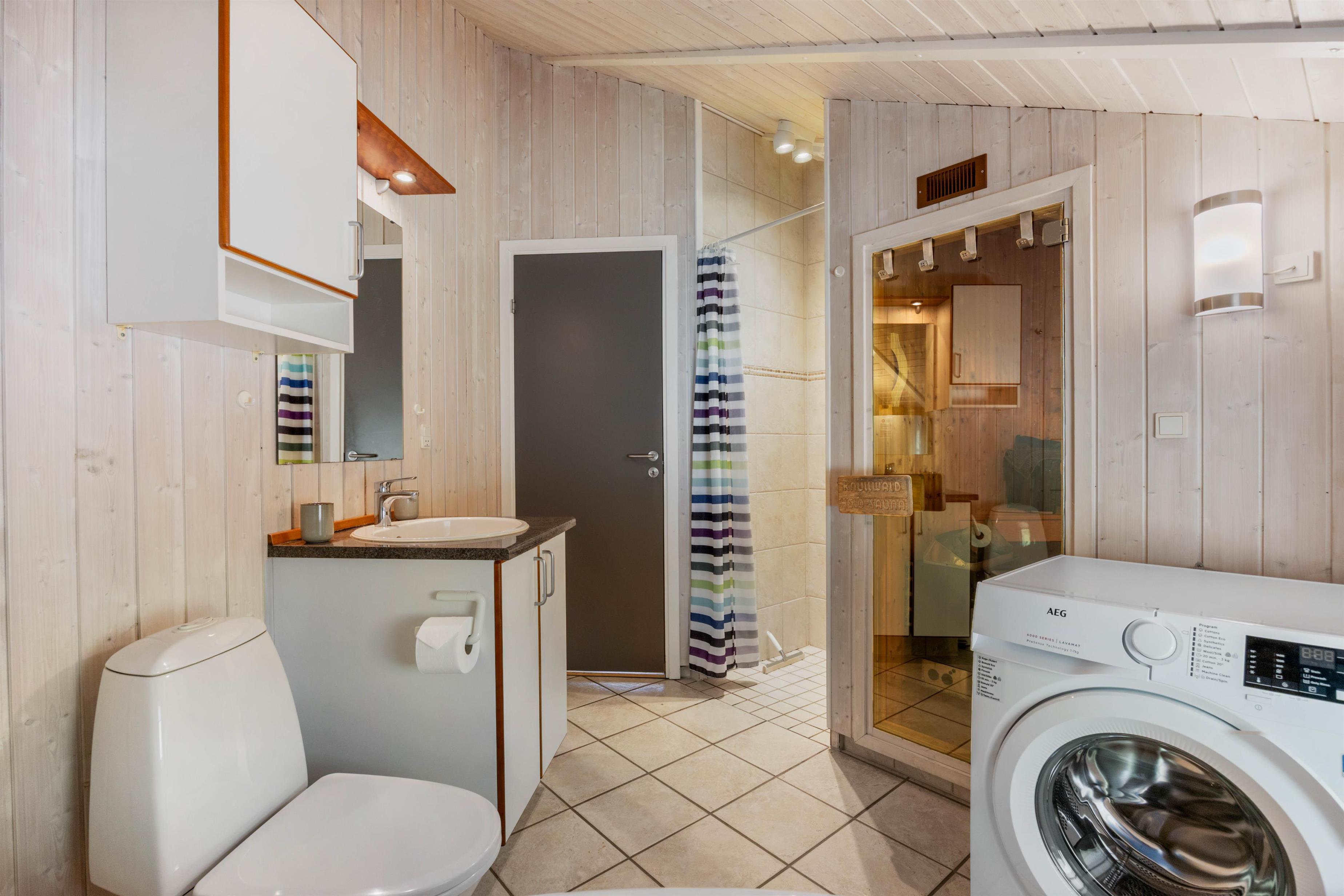 Badeværelset er, som alt andet, praktisk indrettet med plads til det hele, herunder også den uundværlige vaskemaskine. Der er også sørget for lidt ekstra wellness til jer, og efter en rask spadseretur i klitlandskabet eller ved stranden kan I lade jer forkæle med en tur i spaen og derefter saunaen. Velvære for krop og sjæl.