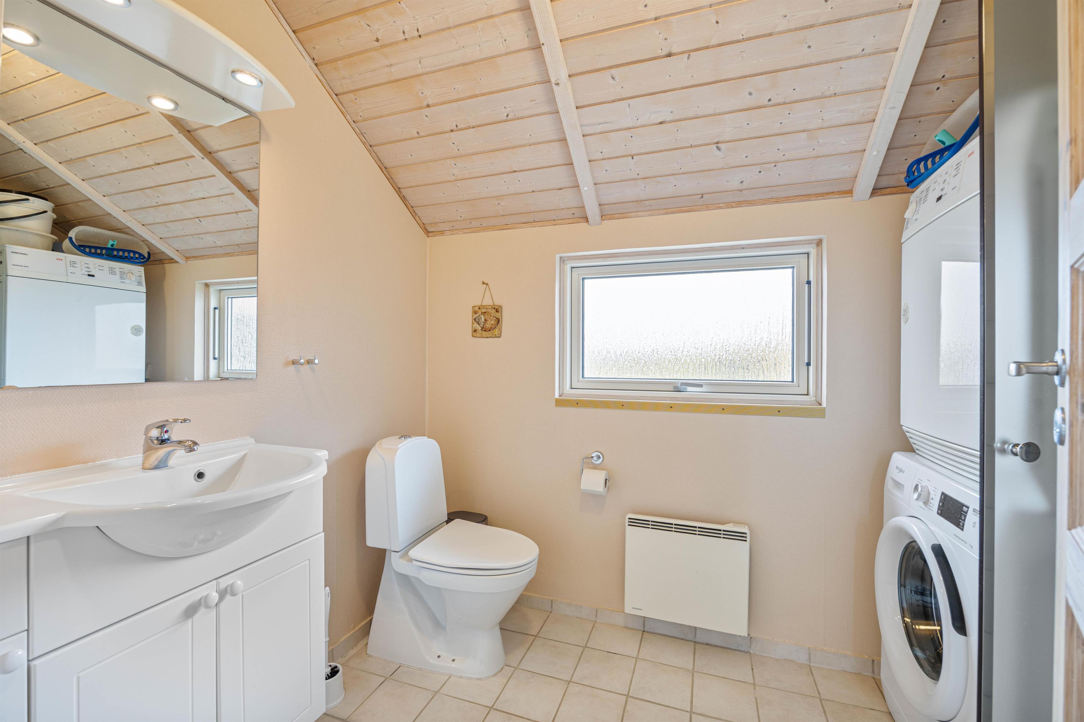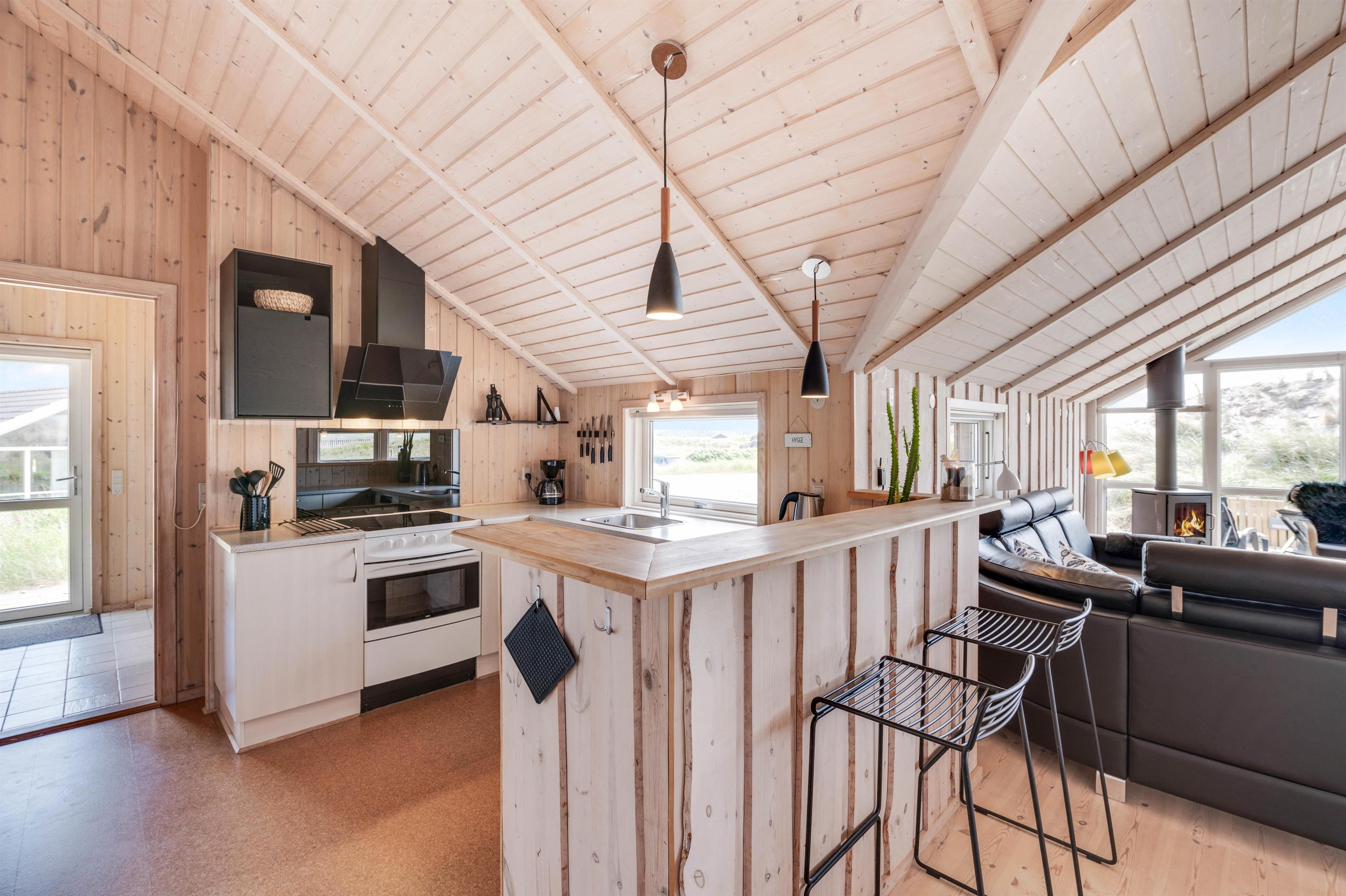 Her er et stort og praktisk indrettet køkken med alt i hårde hvidevarer, inkl. 92 liter fryseskab, opvaskemaskine og mikroovn. Køkkenet står i åben forbindelse med stuen, som er pænt indrettet med gode møbler, trægulve, brændeovn og fladskærm. Et skønt rum, med åbent til kip og masser af lysindfald. Her er også sørget for underholdning til store og små børn, med bl.a. Lego, Brio og gratis trådløs internetforbindelse.