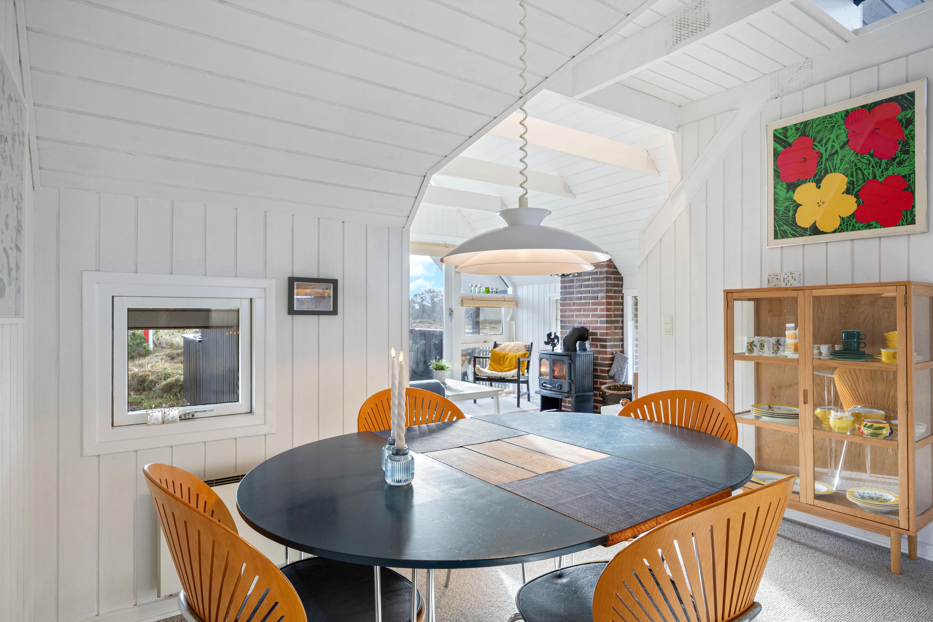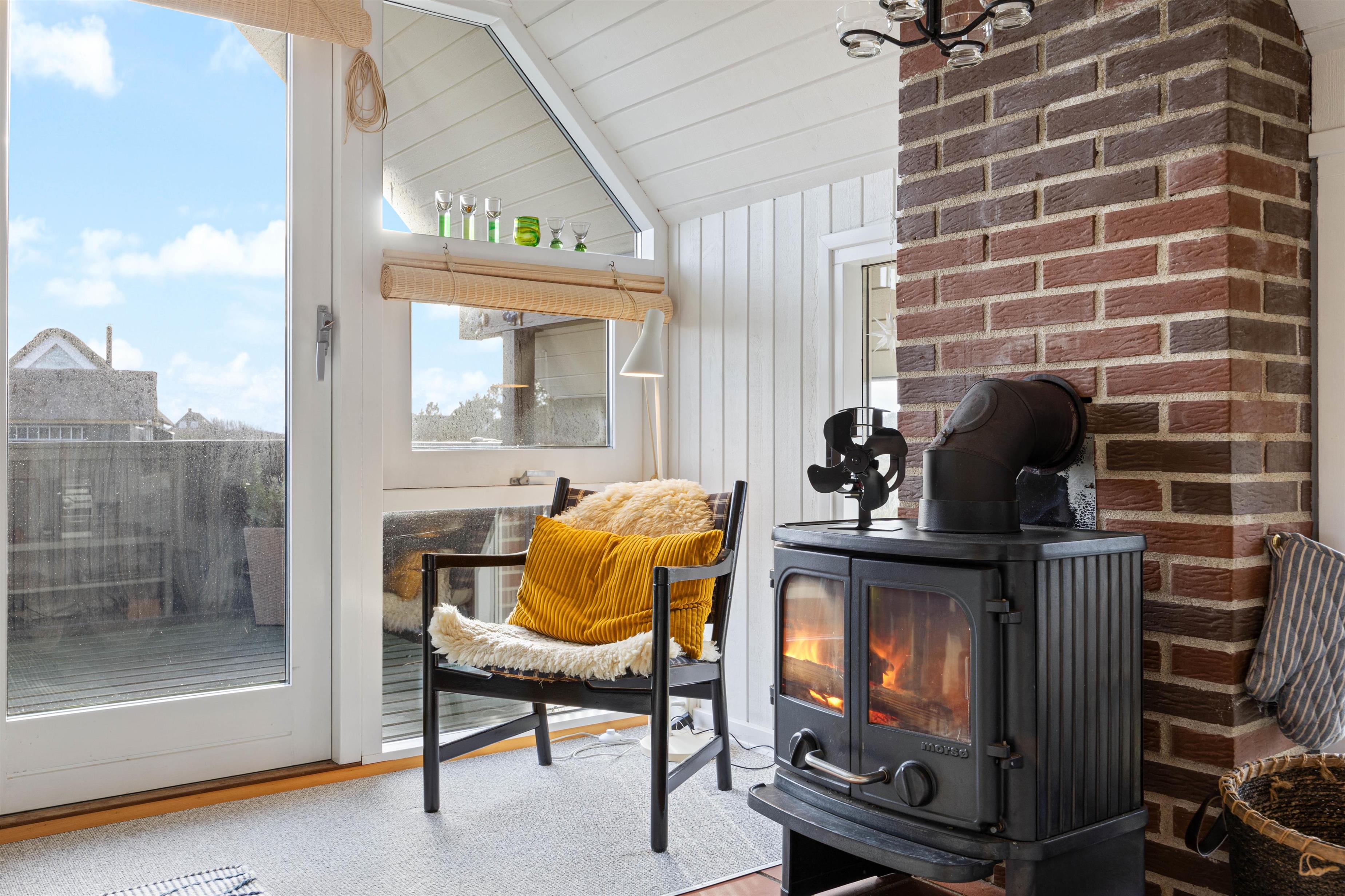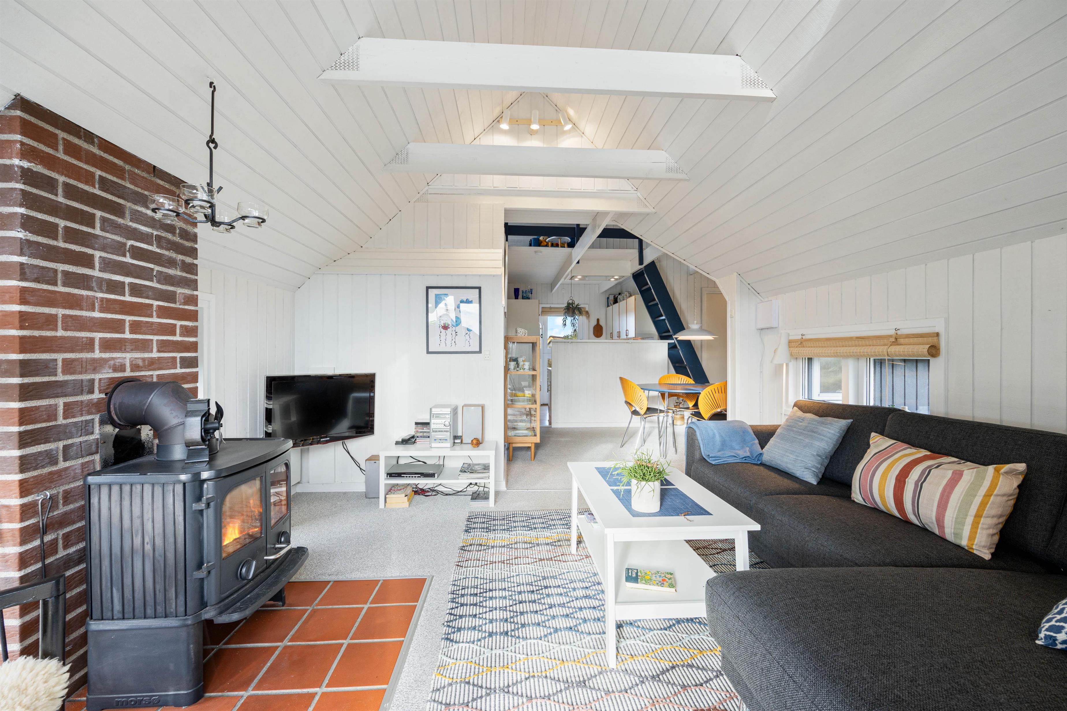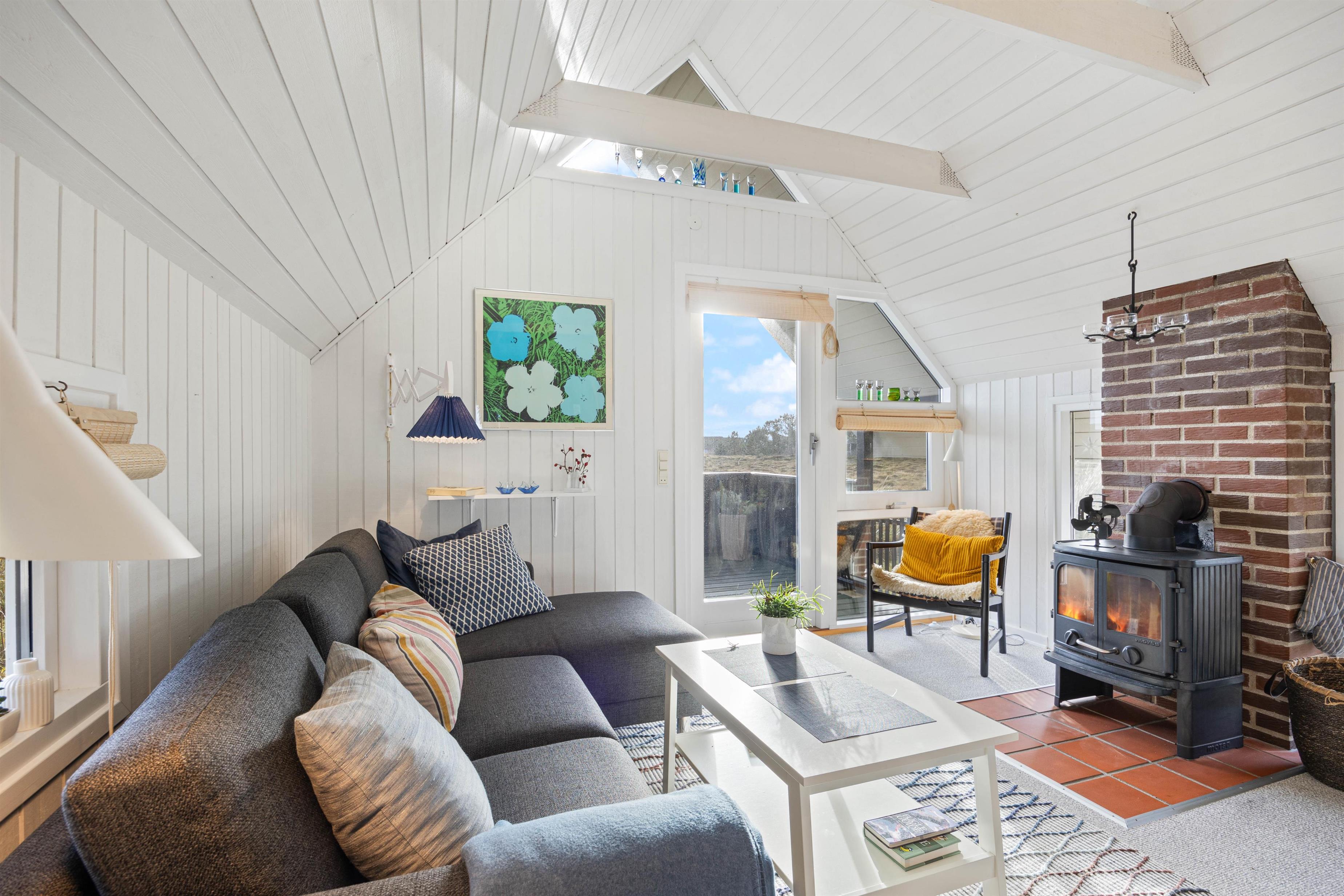 Dette sommerhus har lige det, der skal til for at få en afslappet ferie ved Vesterhavet. Lyse trævægge, komfortable møbler samt klassiske sommerhusmøbler og en brændeovn, som både sørger for dejlig varme og afslappet stemning.