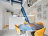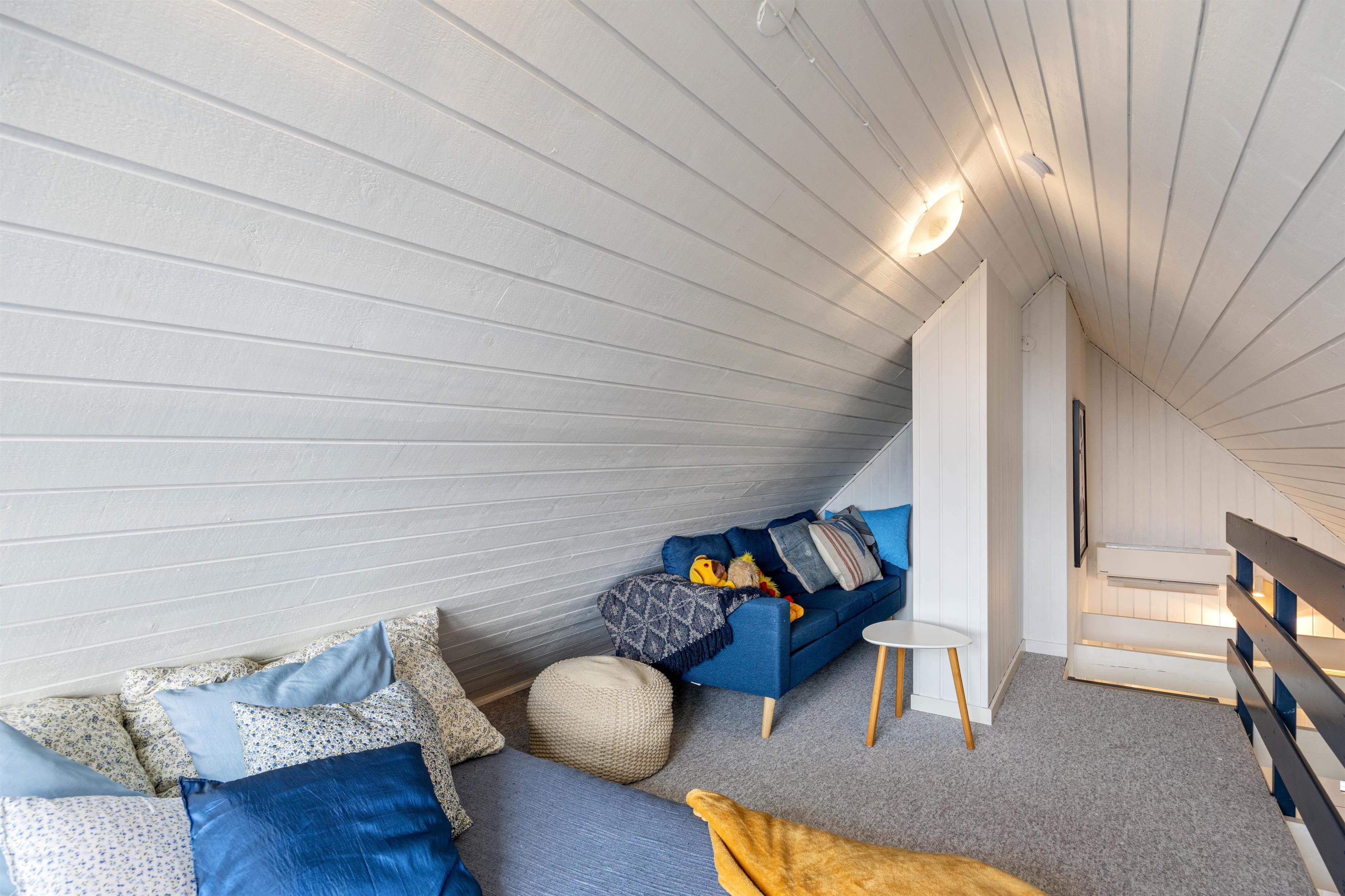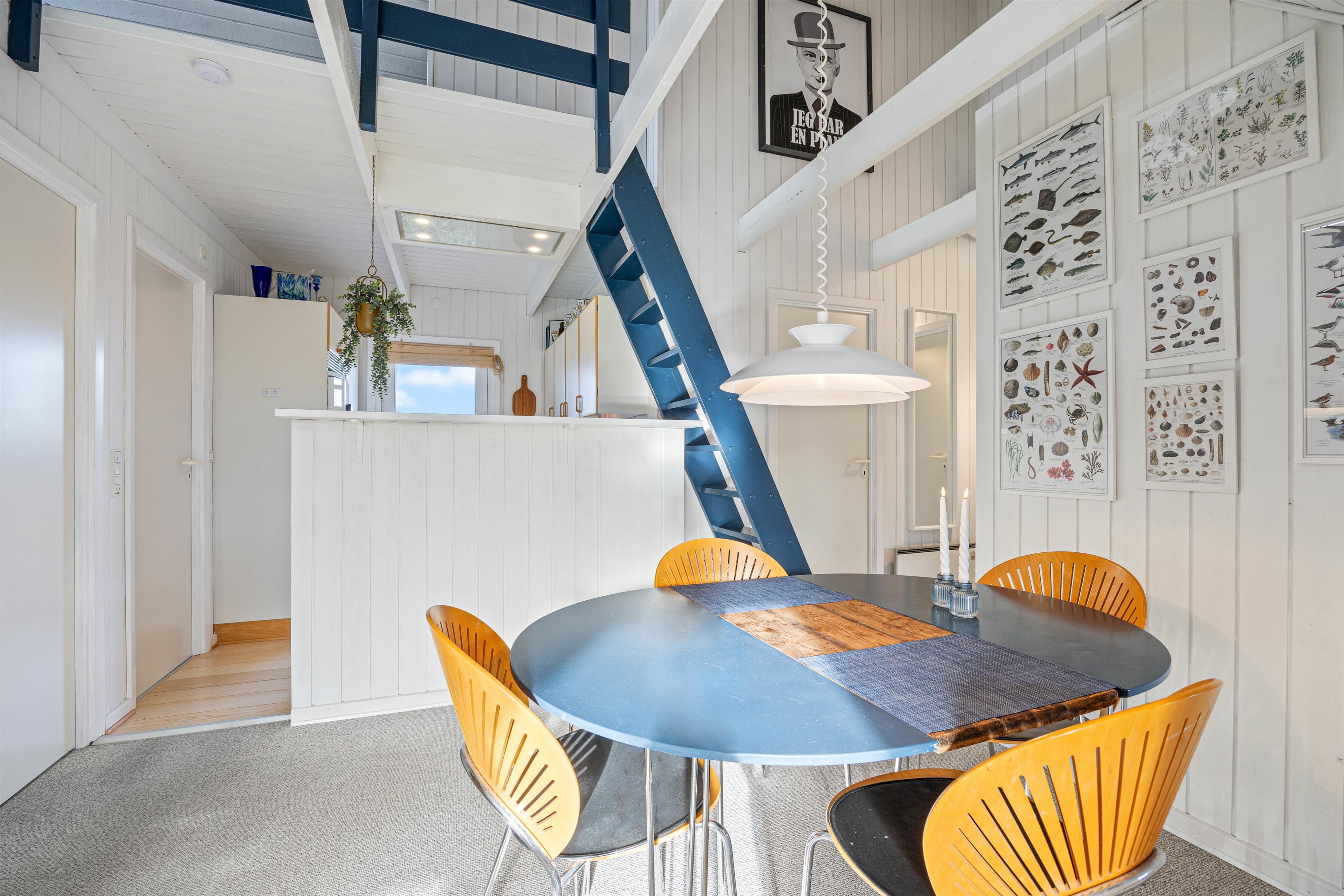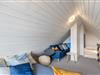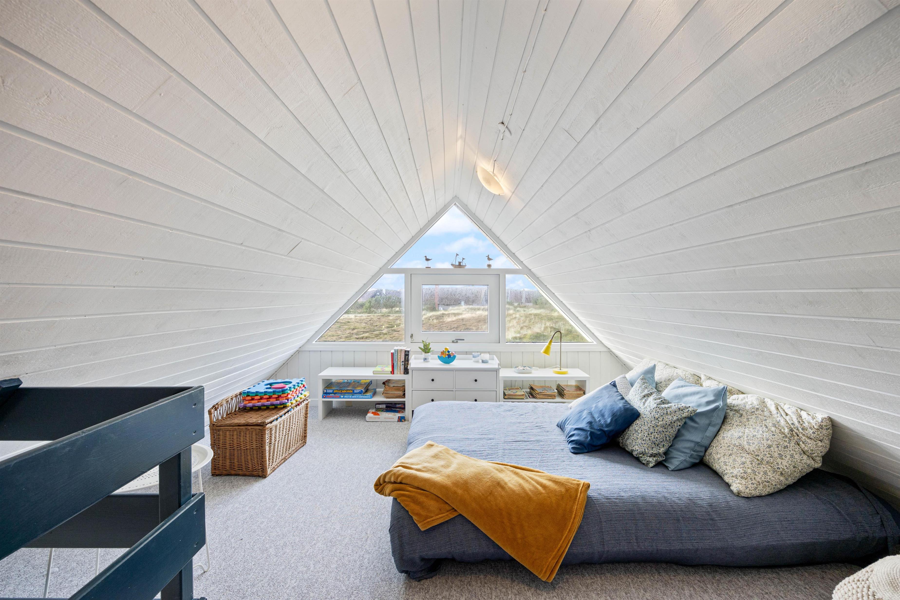 Trappen i spiseafdelingen fører op til feriehusets store hems. En hyggekrog, hvor der er plads til leg og ro. Her er der mulighed for at trække sig tilbage, og hemsen vil uden tvivl blive værdsat af børn og teenagere.
