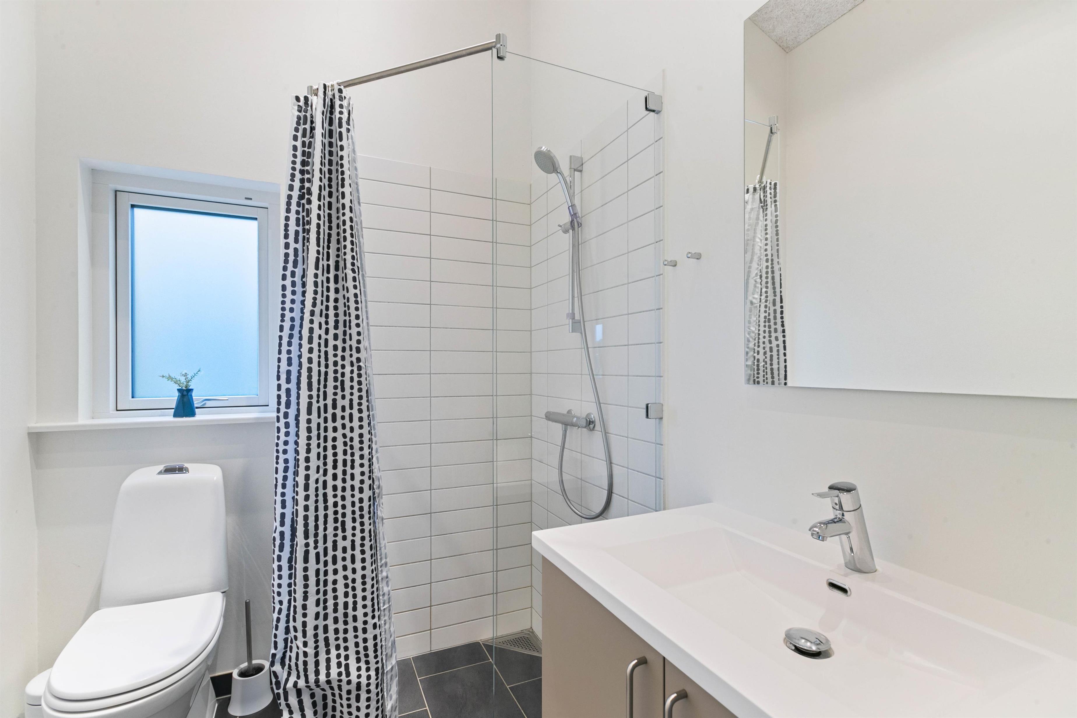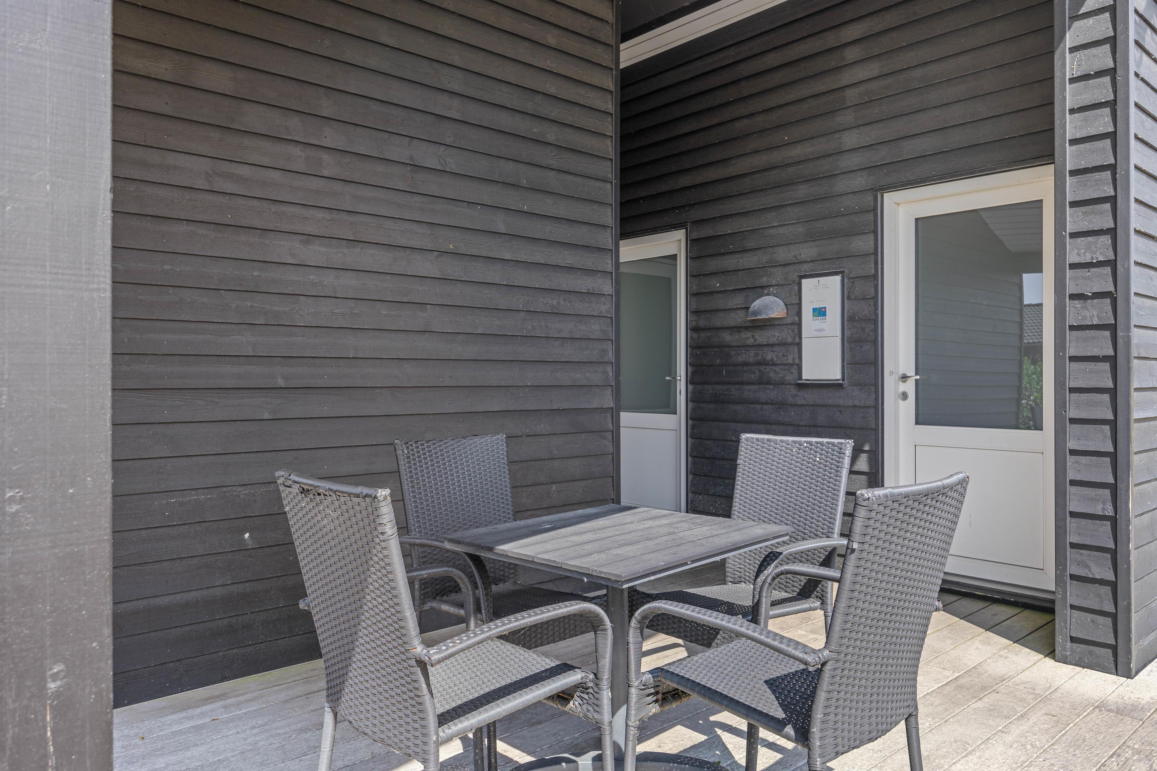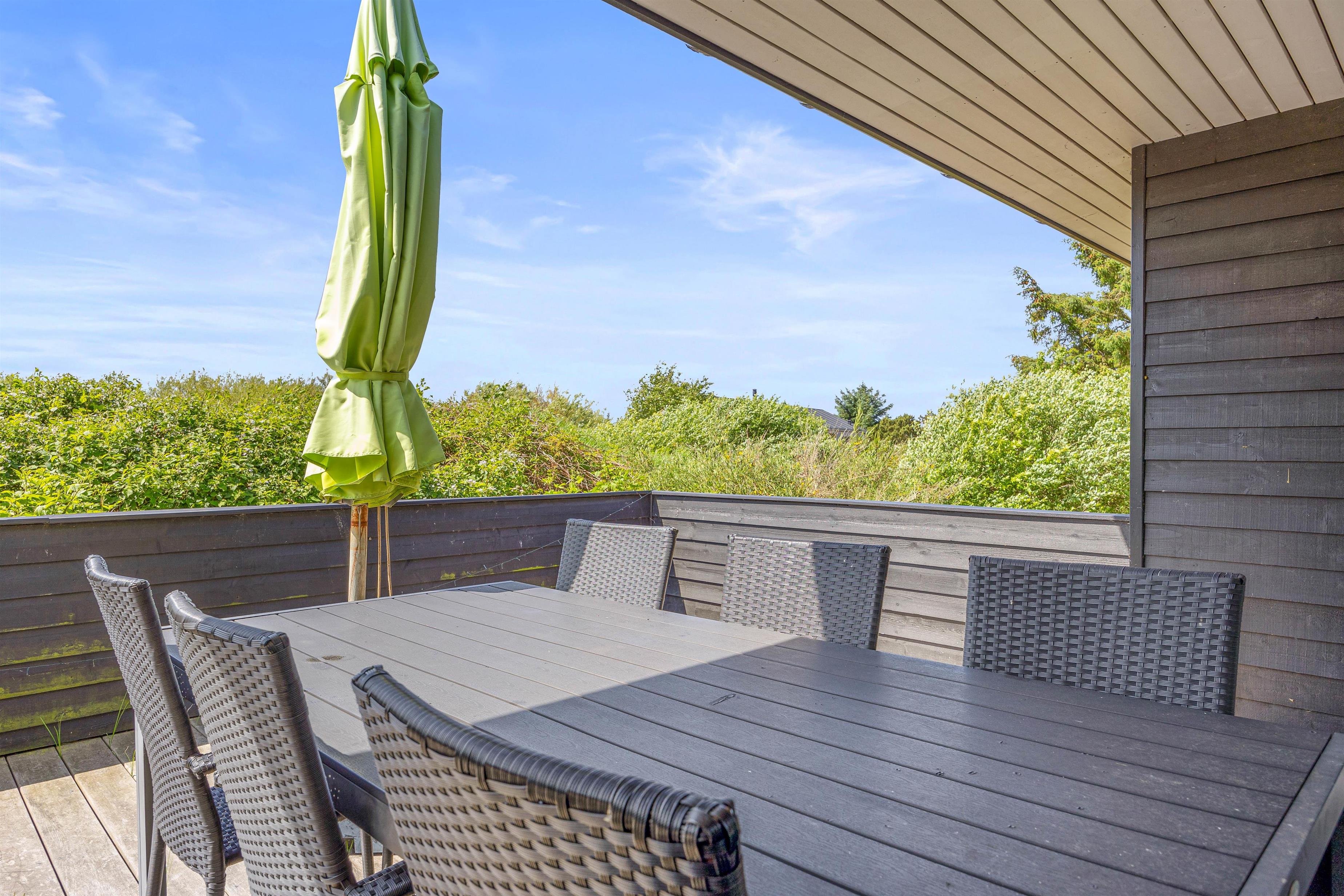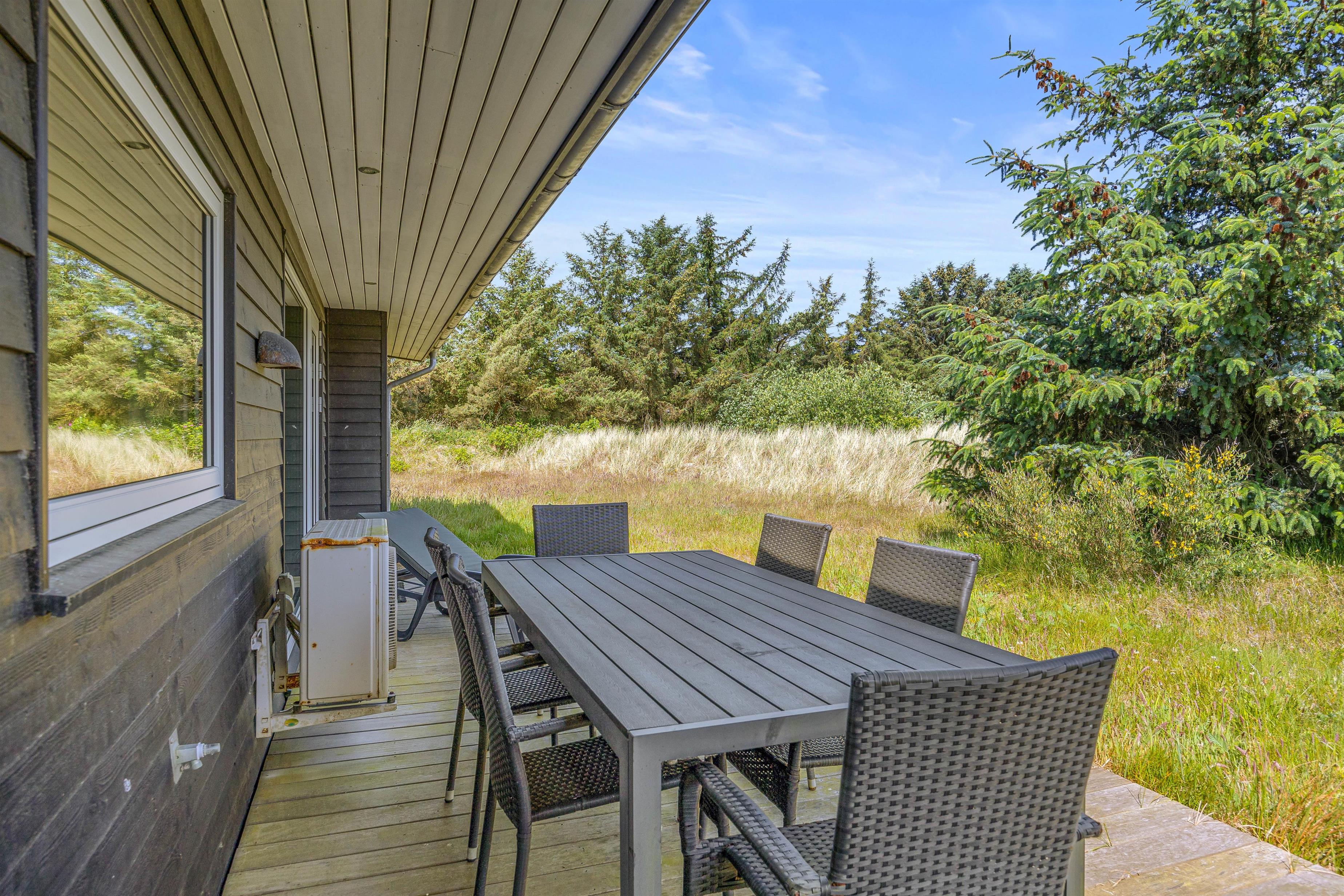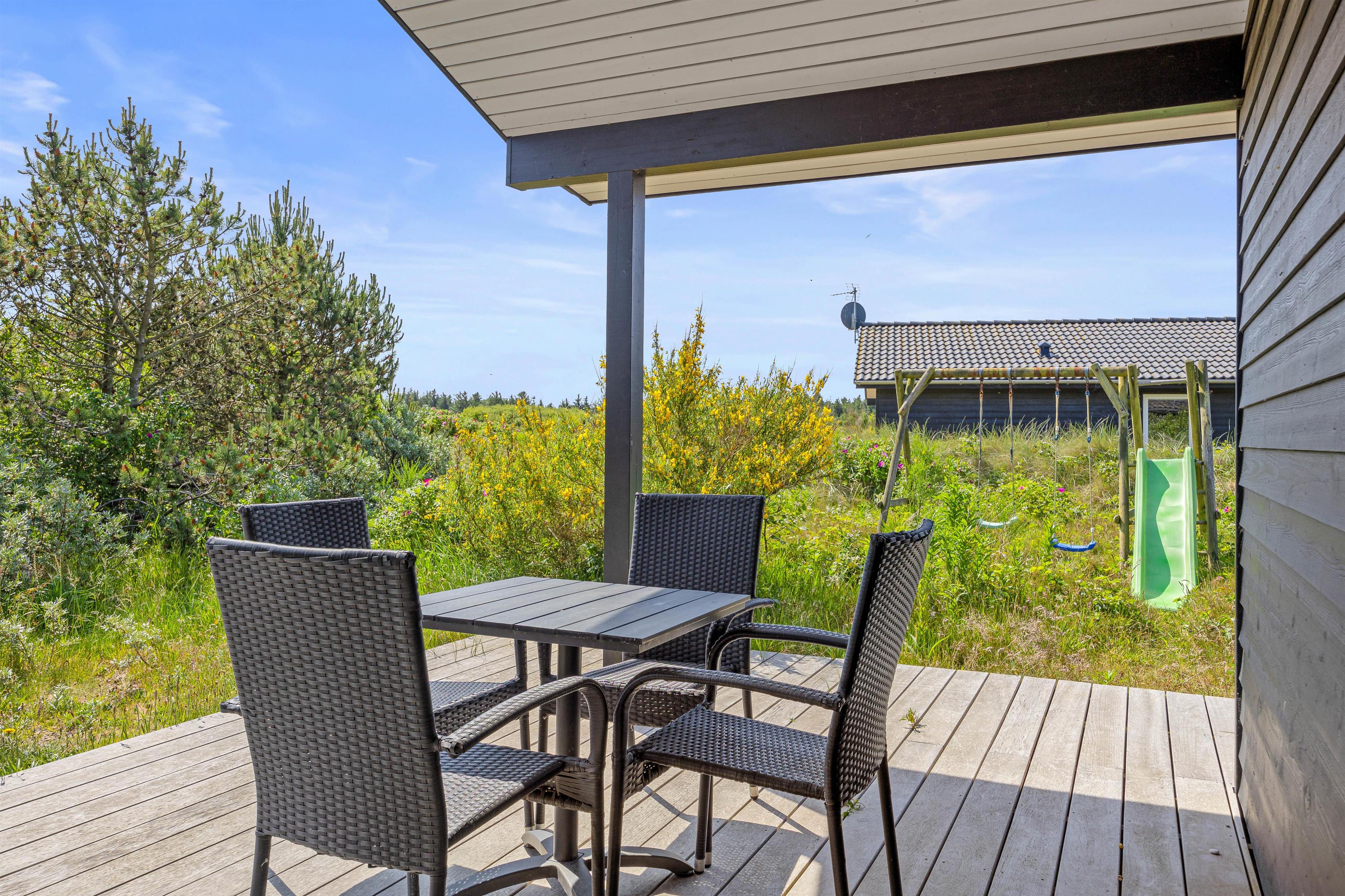 Der er lækre terrasser til dette hus, en der er delvist overdækket og en der er lukket. Man kan således næsten altid finde læ og sol, ligesom der er god mulighed for hyggelige grillaftener i de lune måneder.Den lukkede terrasse er praktisk for både de mindste og hundene, som her kan løbe frit og lege i den grønne natur. På græsplænen ved huset kan de små lege på gyngestativet med rutsjebane, mens de voksne kan slikke sol på husets liggestole.
