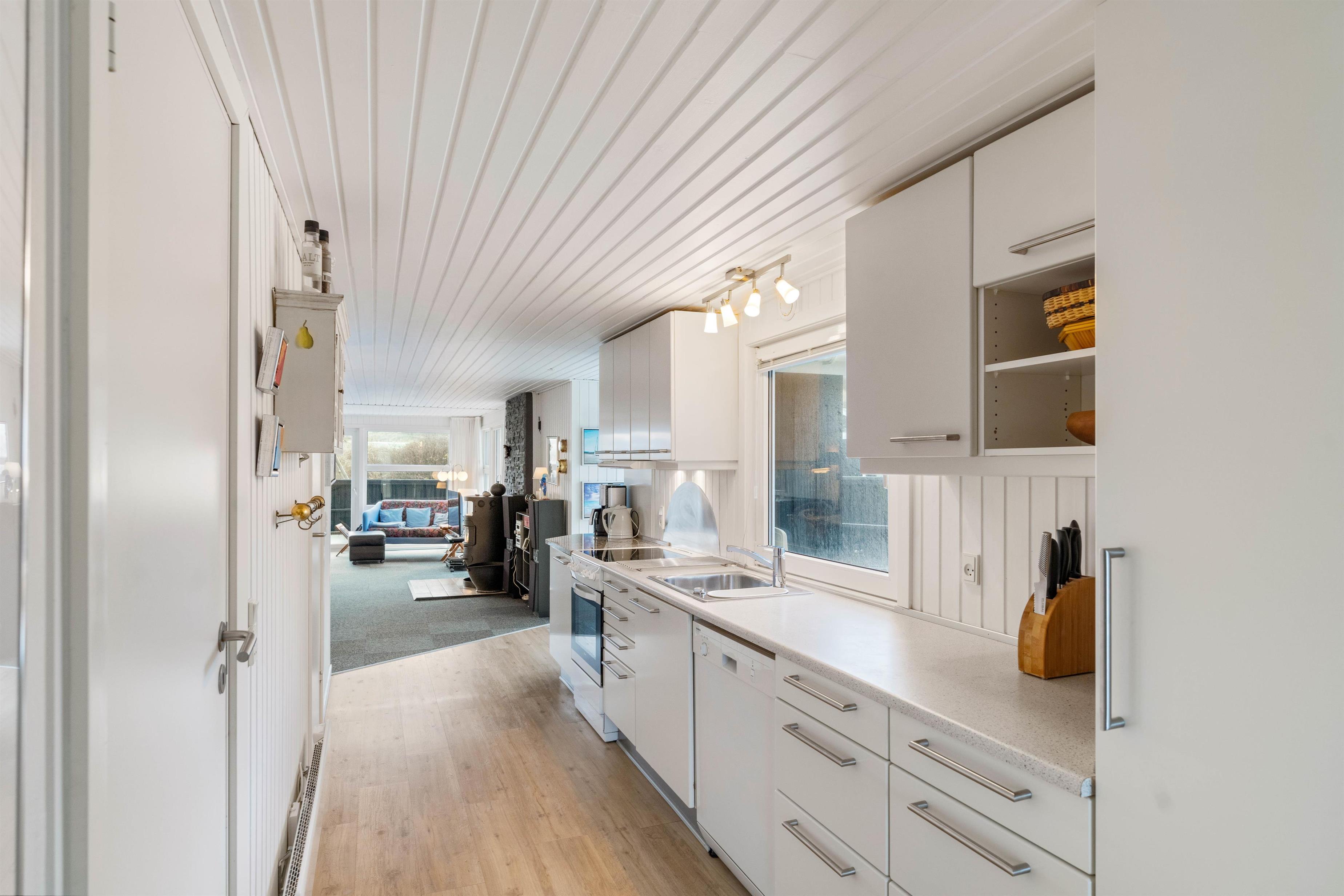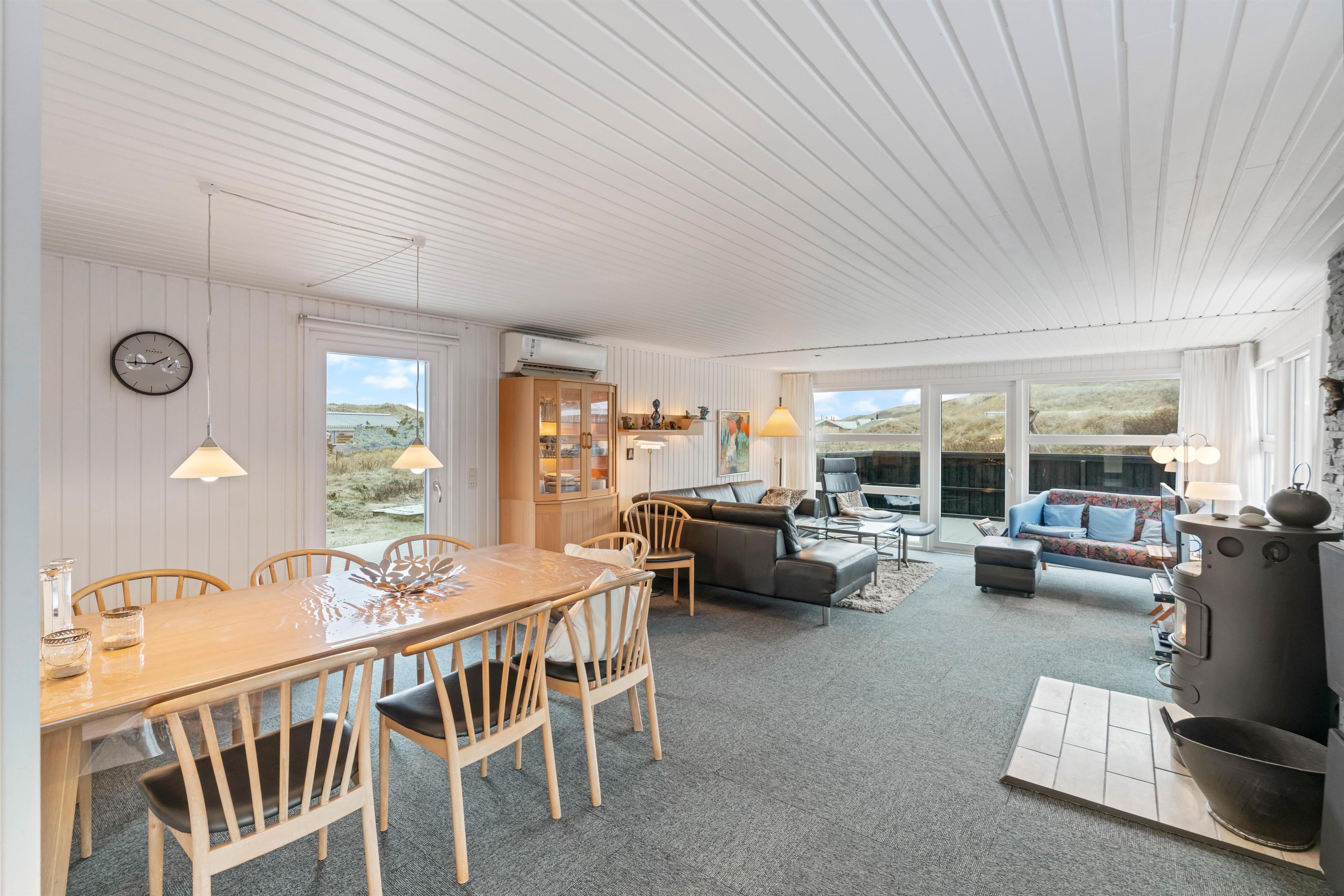 Sommerhuset er indbydende, lyst og venligt indrettet. Et funktionelt og praktisk indrettet køkken er åbent ind til den elegante spiseafdeling og den hyggelige og lyse opholdsafdeling. Det brede vinduesparti giver et smukt lysindfald og udsigt ud i naturen og klitterne. Hyg dig i en god lænestol med en god bog og en kop kaffe, imens ilden fra brændeovnen giver varme og hygge til hele rummet og bidrager til den afslappede feriestemning. Badeværelset med spa og sauna giver rig mulighed for afslapning og velvære. Der er 3 gode, lyse soveværelser med komfortable dobbeltsenge, hvor I kan hvile rigtig godt ud i den friske vesterhavsluft.