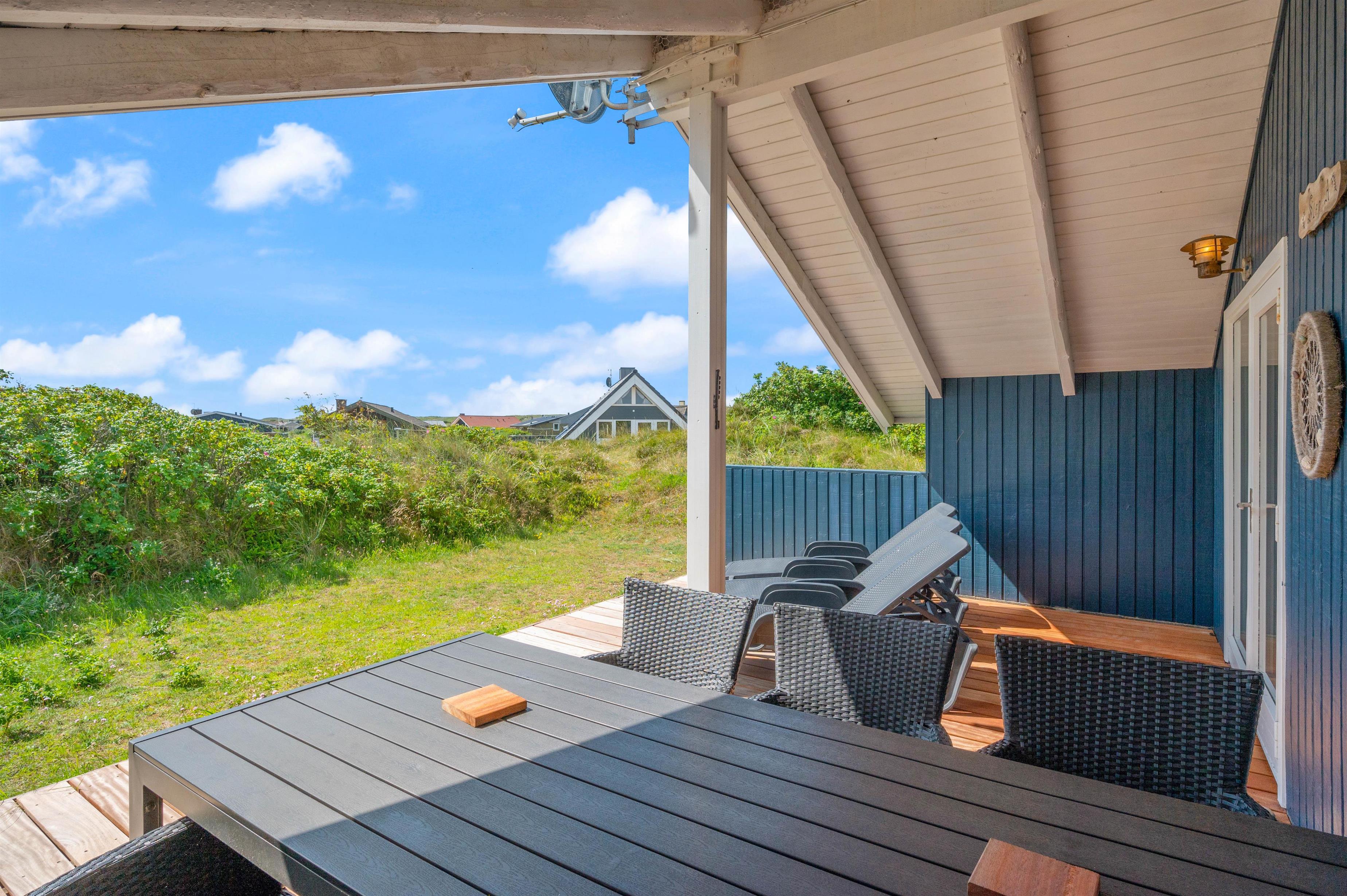 Nyd udelivet på den sydvendte terrasse. Her kan I solbade på de komfortable liggestole eller slappe af i havemøblerne. Ved annekset er endnu en terrasse, så I kan flytte rundt efter vejret. Har I hund med, er det en utrolig smuk egn at gå på opdagelse i – I kan hente frisk morgenbrød hos købmanden eller gå lange ture på den kilometerlange sandstrand. Tænd op i grillen, og nyd et lækkert grillmåltid sammen, imens skyggerne bliver lange. Bagefter kan I gå en afslappende tur til stranden og nyde solnedgangen over Vesterhavet, det er altid en oplevelse.