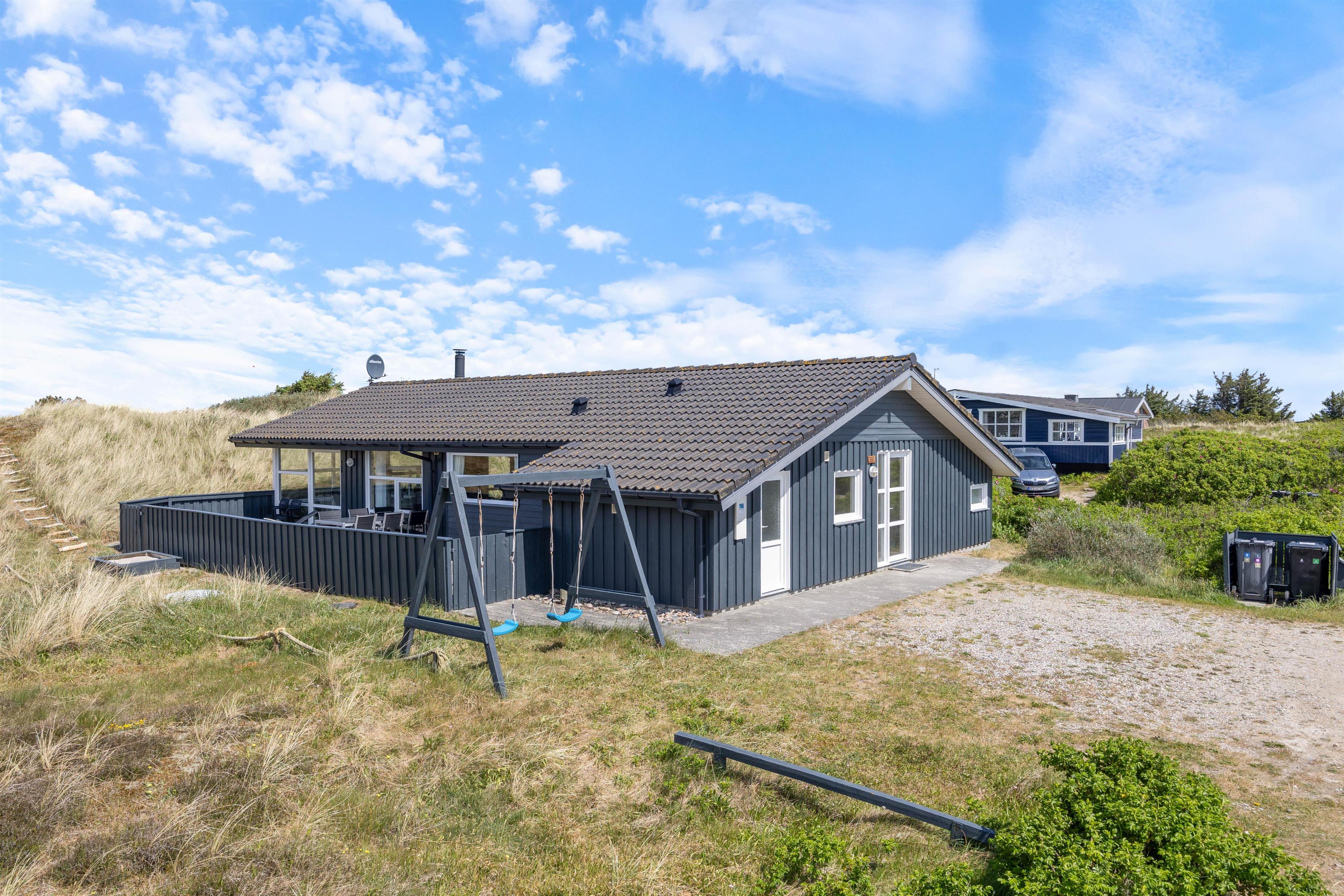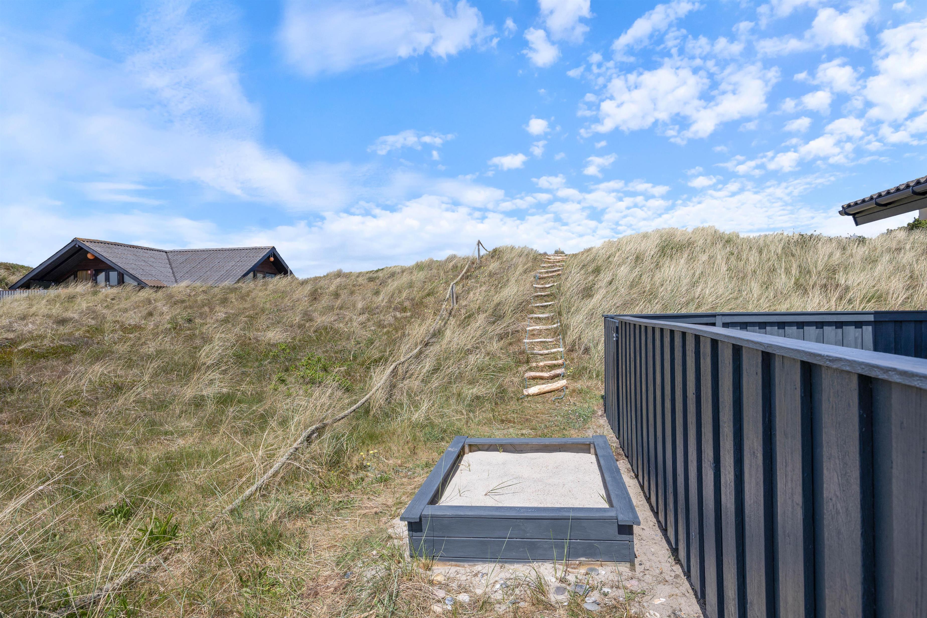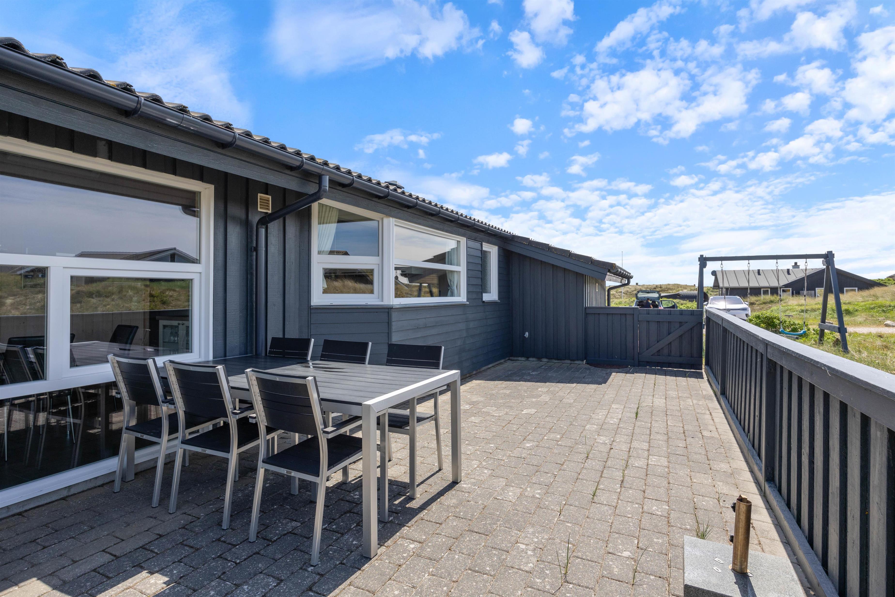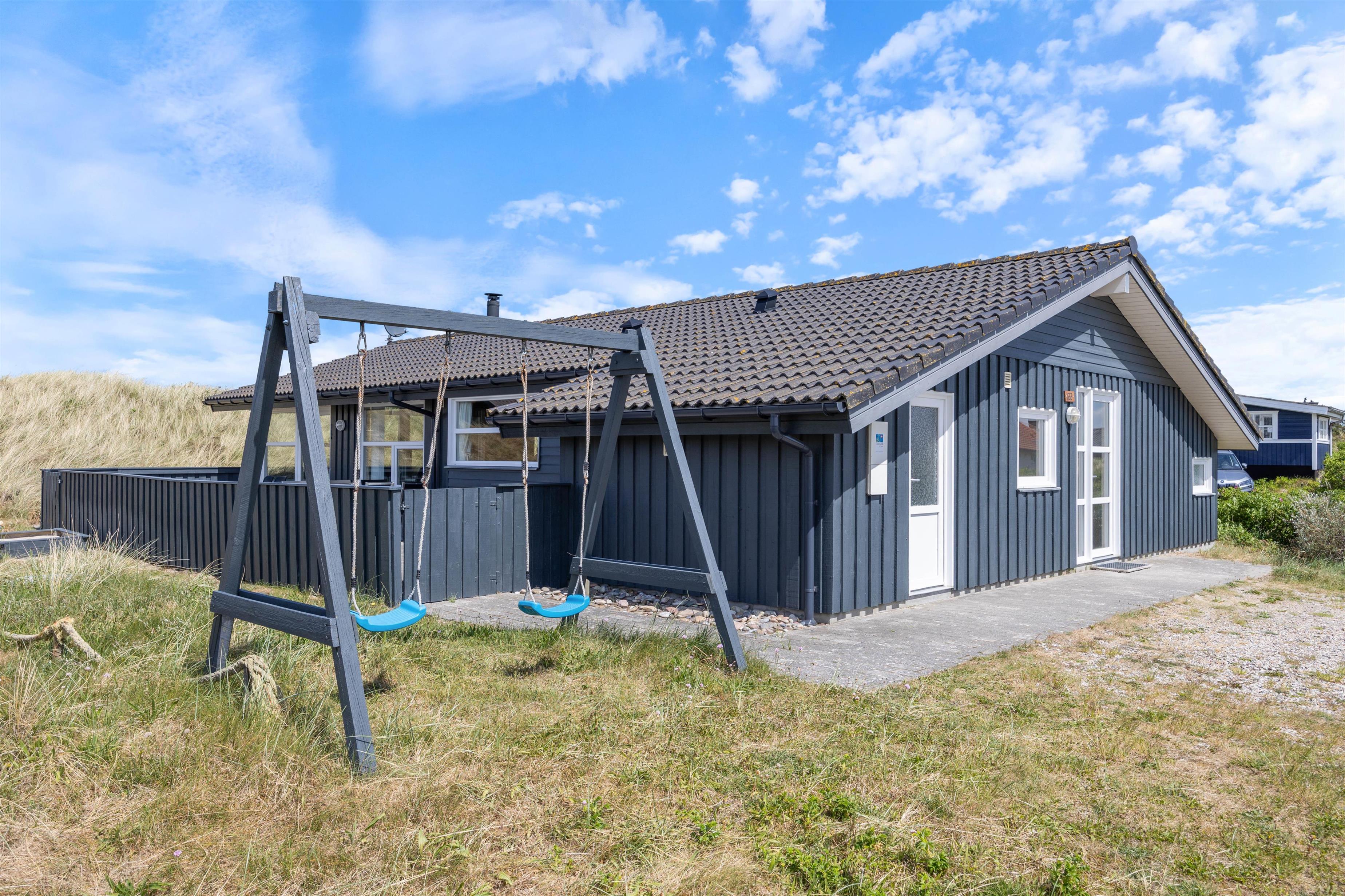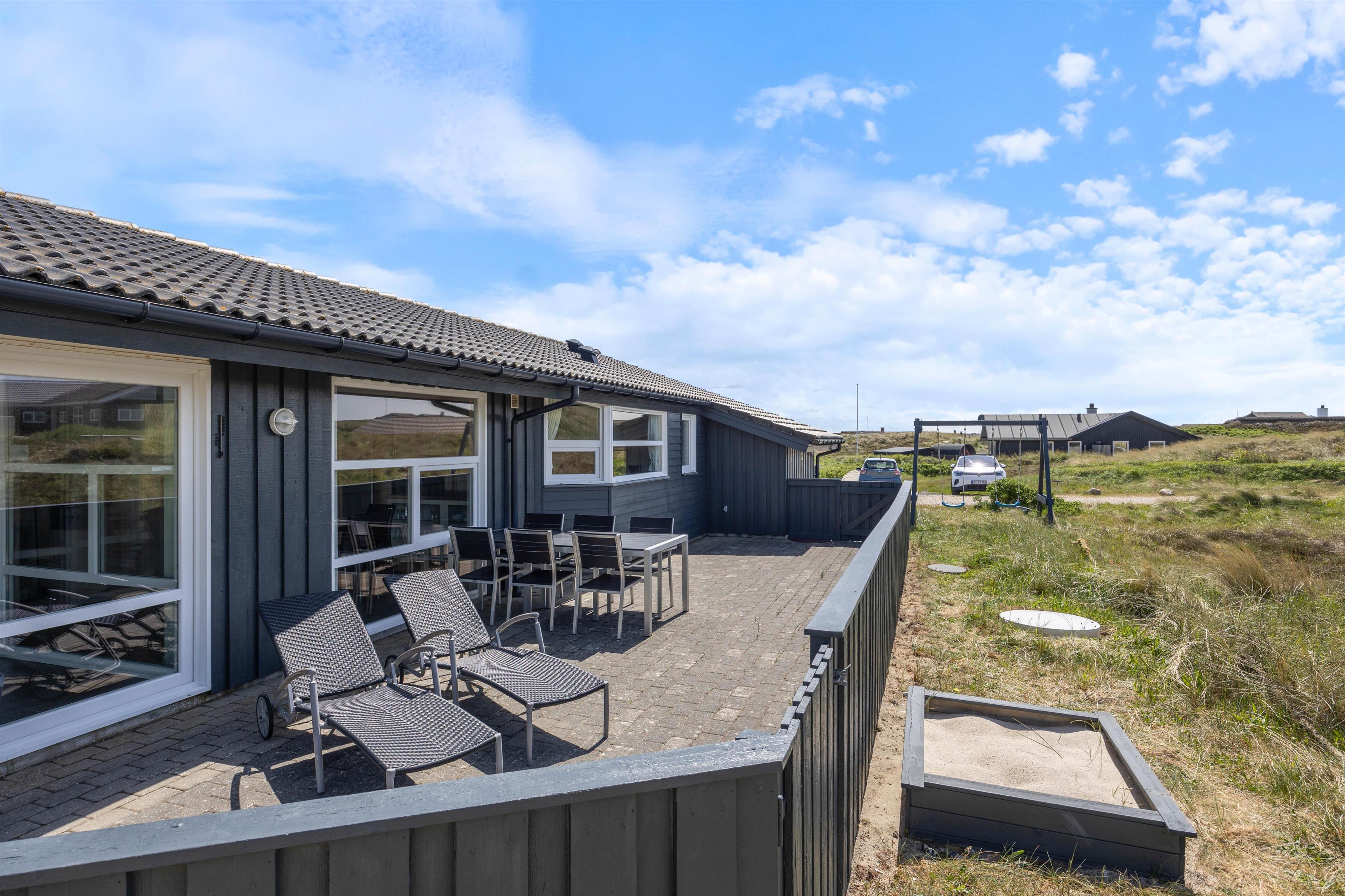 Lige ved siden af terrassen er der opstillet gynger og en sandkasse, så børnene kan lege, mens du sidder lige ved siden af og nyder ferien.