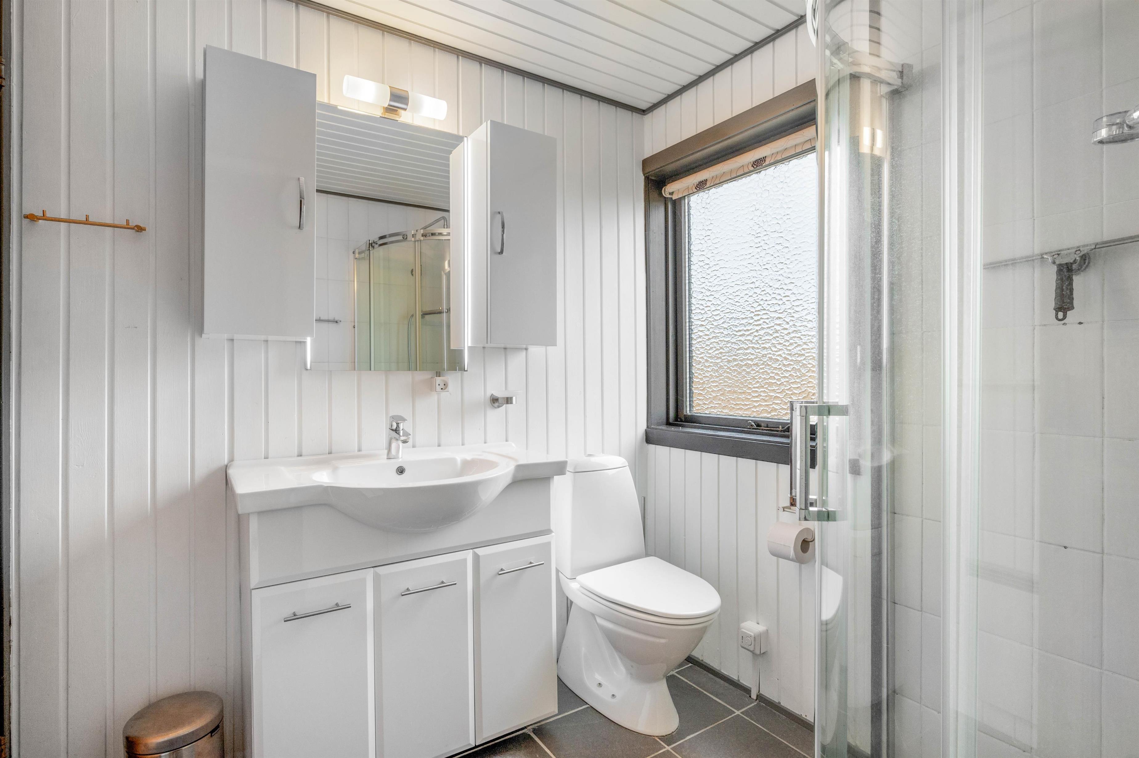 På badeværelset er der gulvvarme, og det er også her, at I finder sommerhusets sauna. Her kan I slappe af og nyde roen efter en god gåtur ved det brusende Vesterhav.