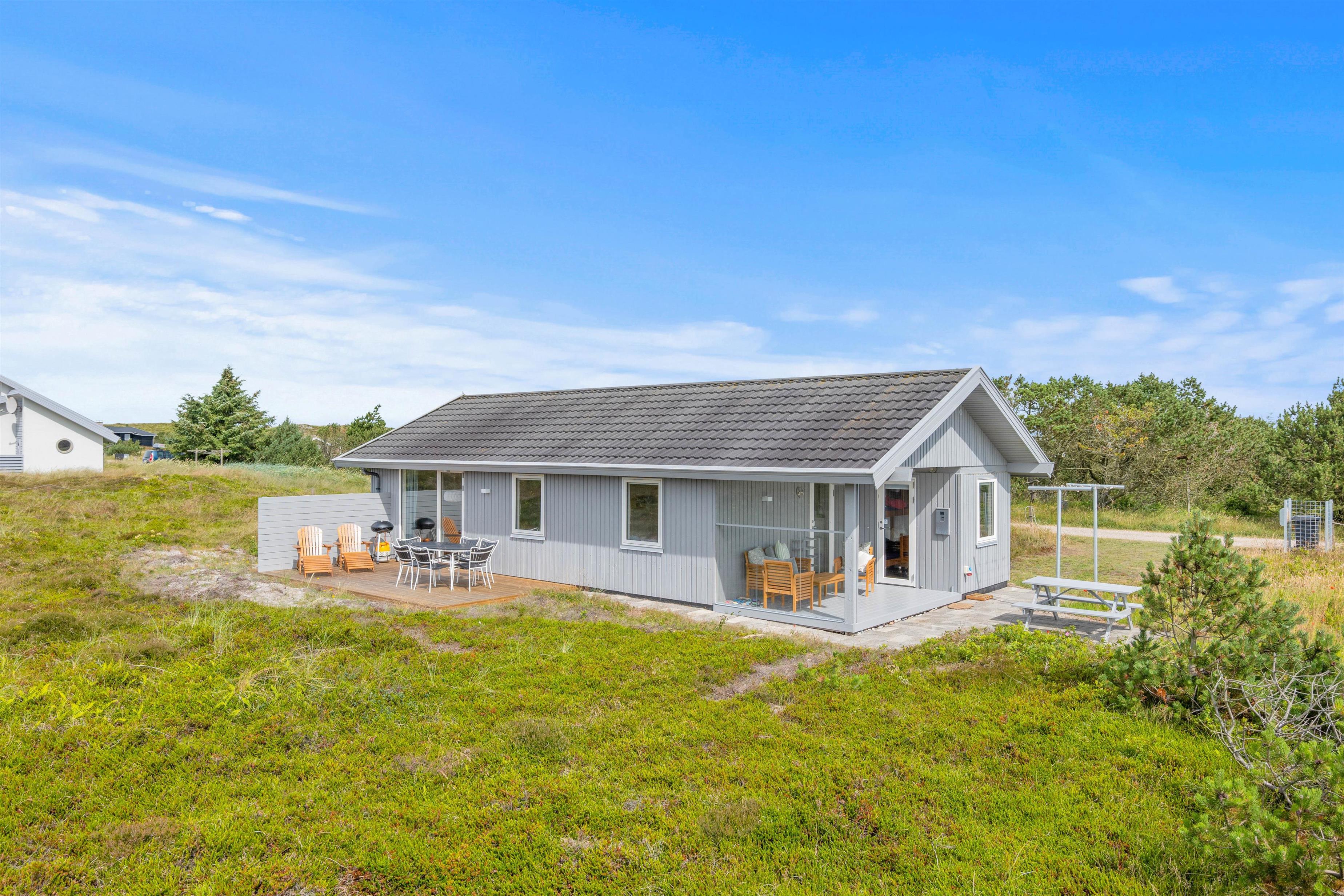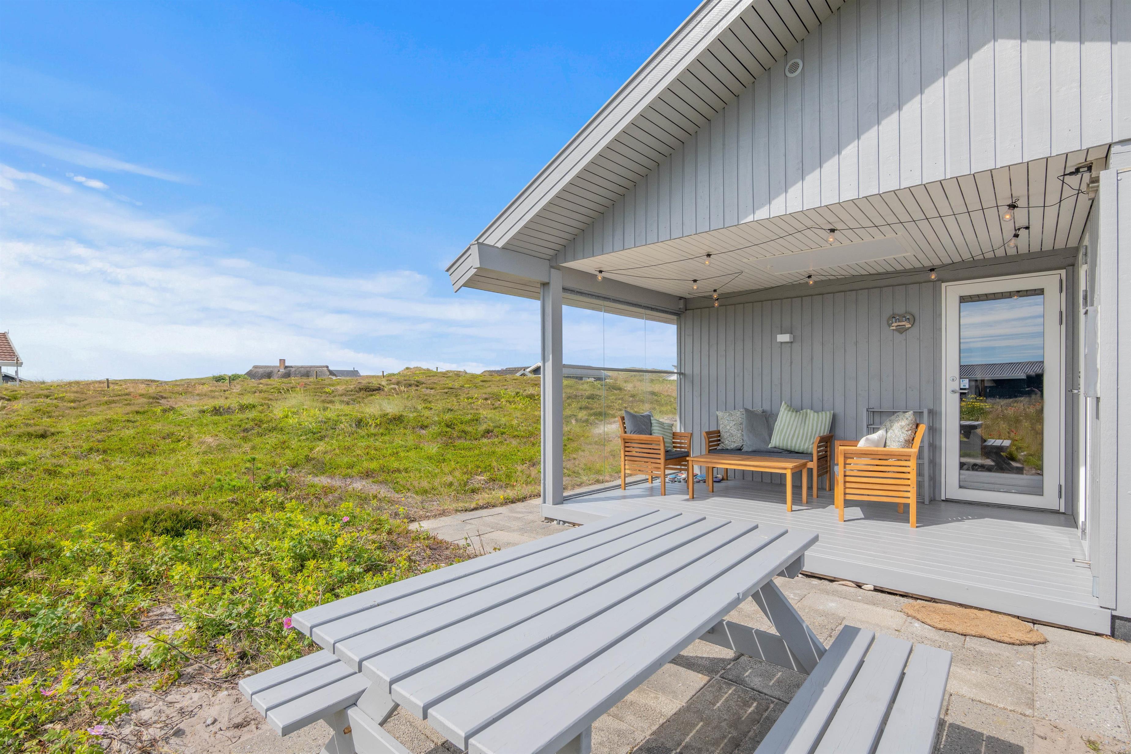 På det udendørs område ved det hyggelige sommerhus indbyder grillen og de komfortable havemøbler til en afslappet grillaften, mens solen går ned bag klitterne og afslutter den begivenhedsrige dag. Terrassen er delvist afskærmet, så I kan sidde i læ for vinden.
