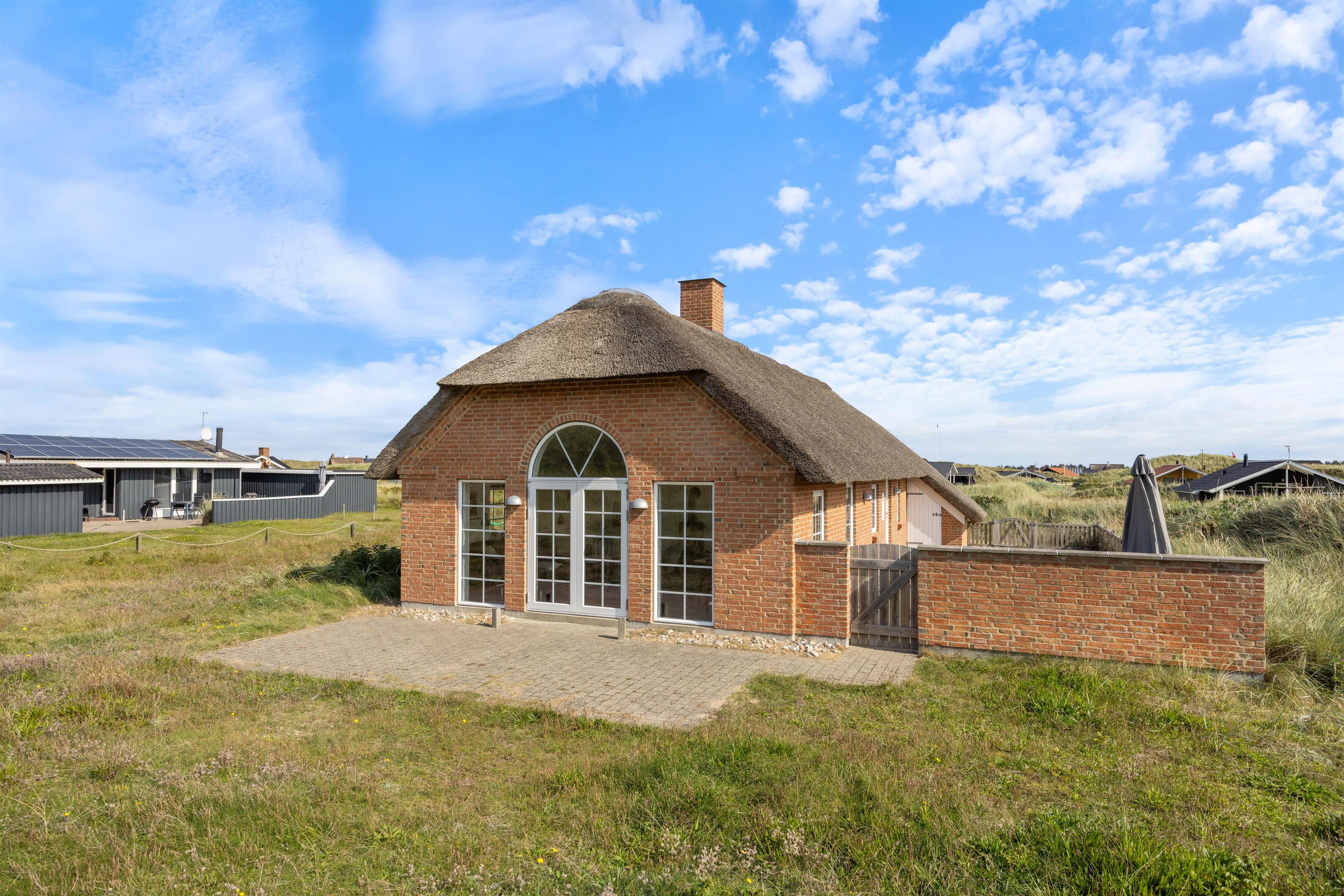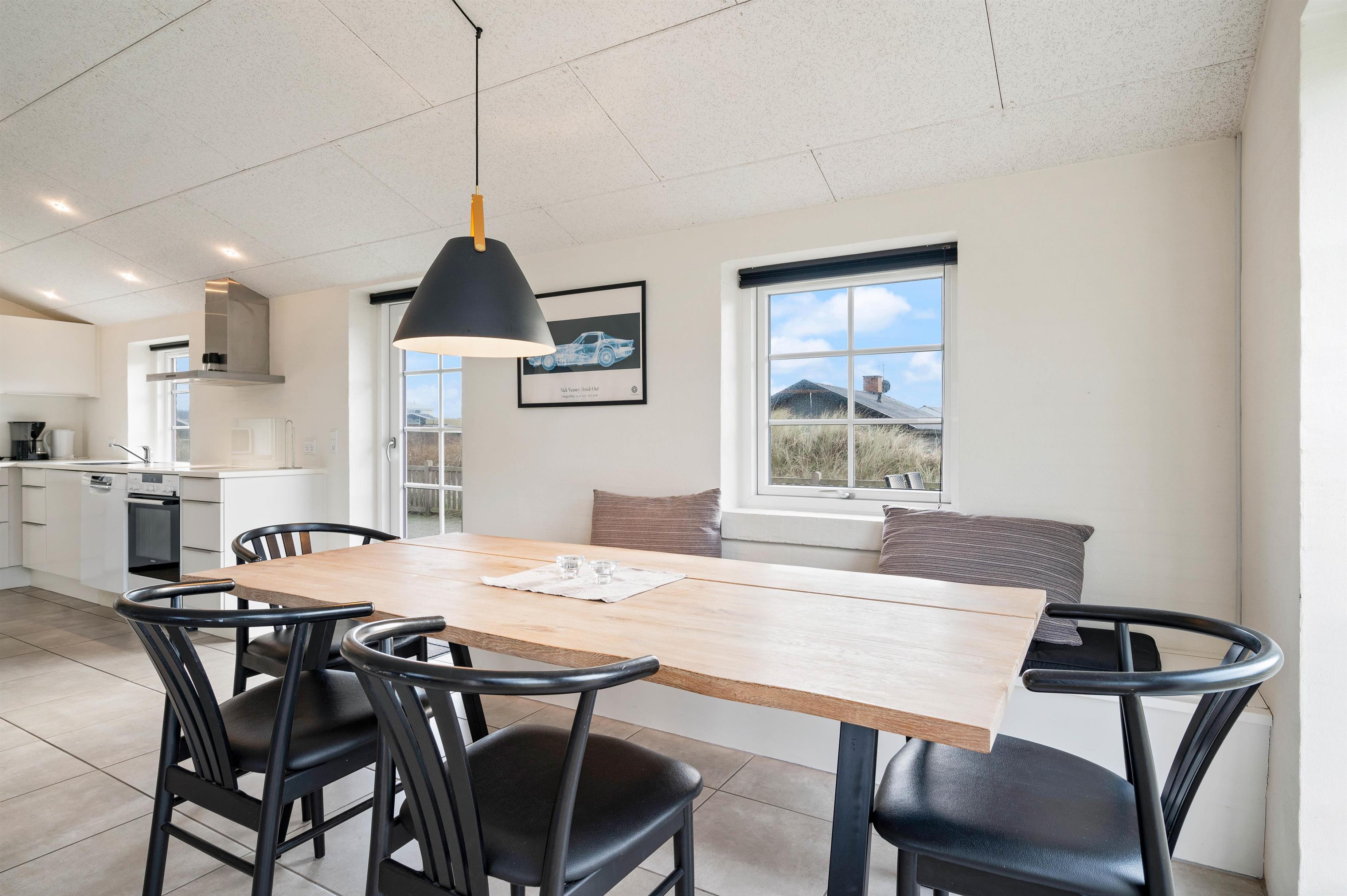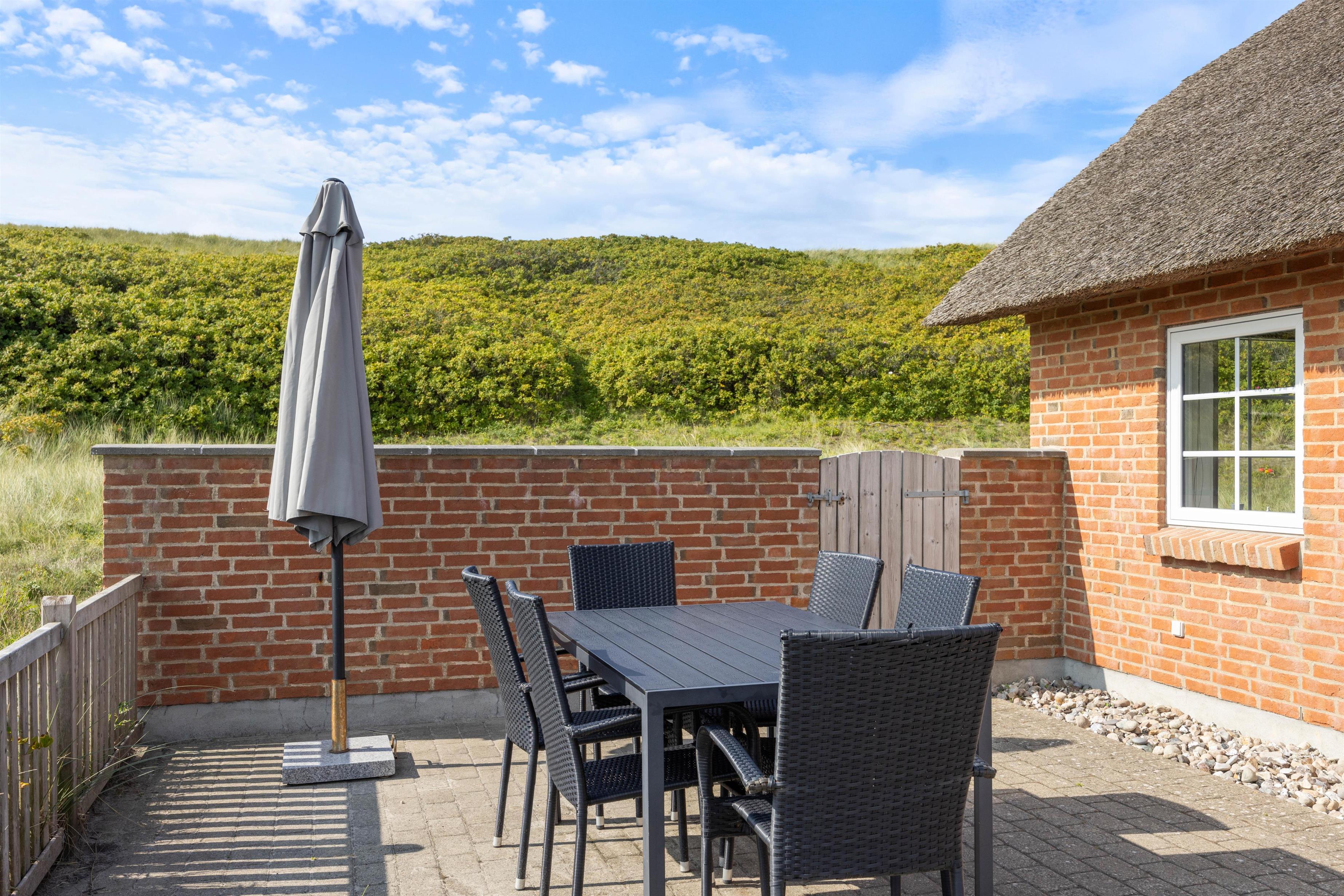 Feriehuset har en fantastisk beliggenhed direkte ved klitterne, og fra terrassen kan I næsten høre bølgernes brusen kalde på jer. På den brede sandstrand, som er et paradis for alle, kan børnene og hundene tumle i sandet, mens I slapper af i de skønne omgivelser, og på de gode sommerdage kan I hoppe en tur i bølgerne.