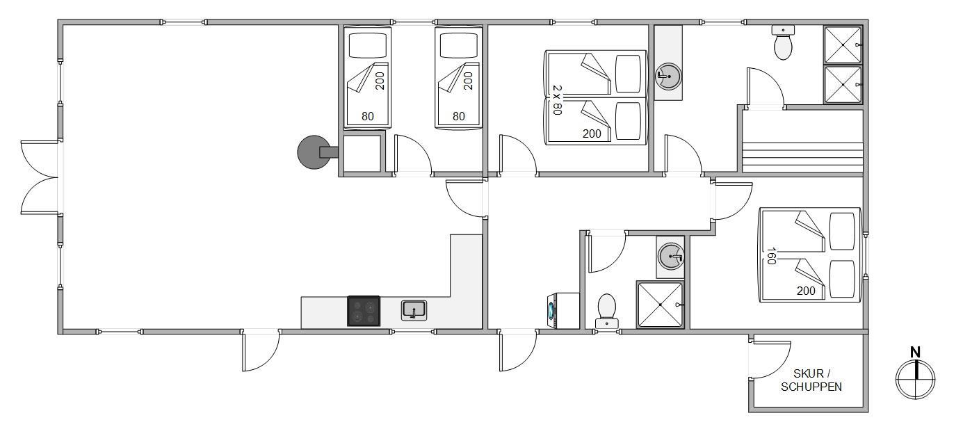 Feriehuset er både lyst og moderne indrettet, og i de indbydende omgivelser vil I fra første ferieøjeblik føle jer godt tilpas. Indretningen er den perfekte kombination mellem det praktiske og de ekstra goder, der sørger for en dejlig ferie. Med plads til 6 personer bliver der hurtigt kø til toilettet, og derfor er huset indrettet med 2 badeværelser med brusebad, så I ikke står i kø, når der skal bades og børstes tænder.