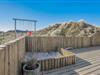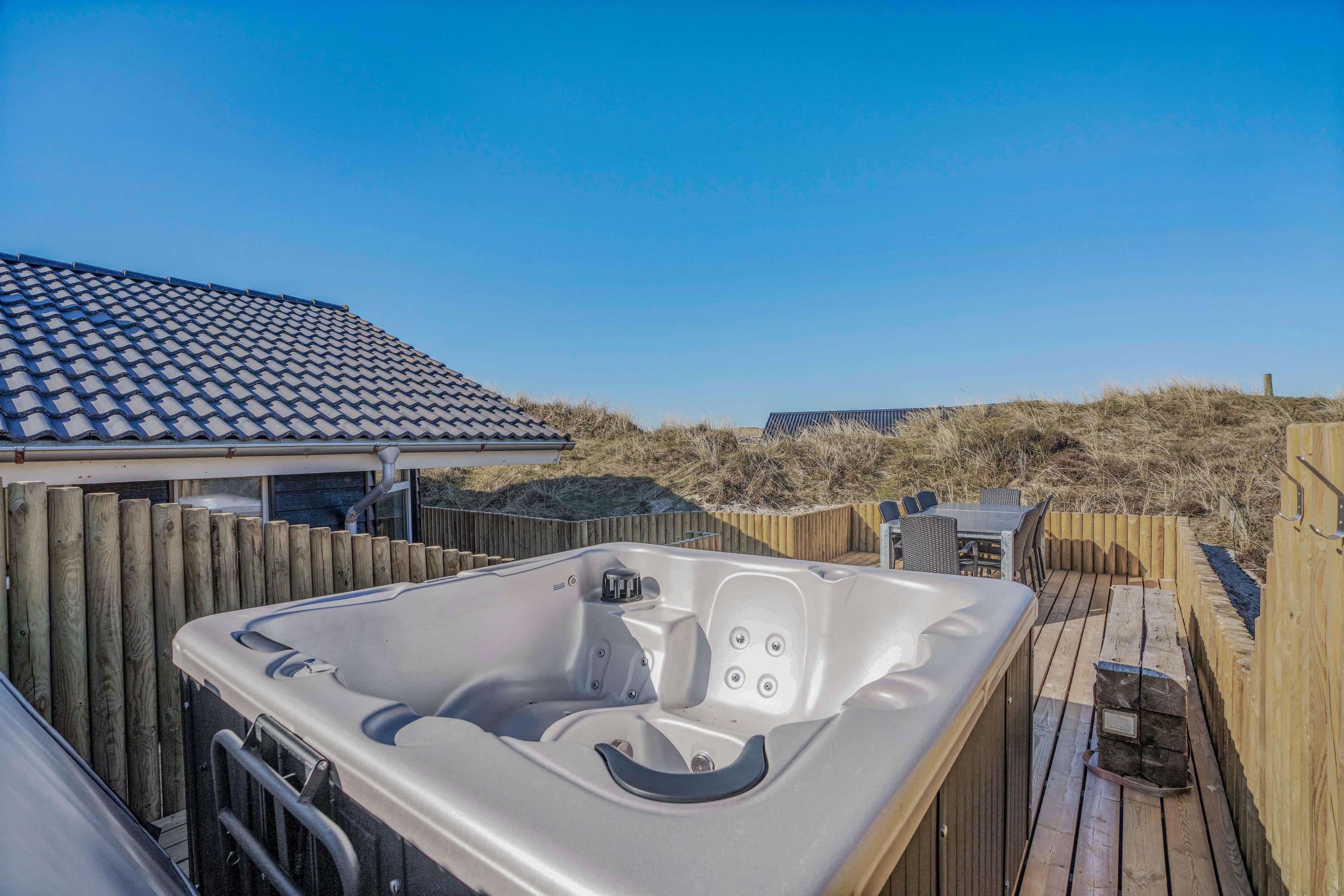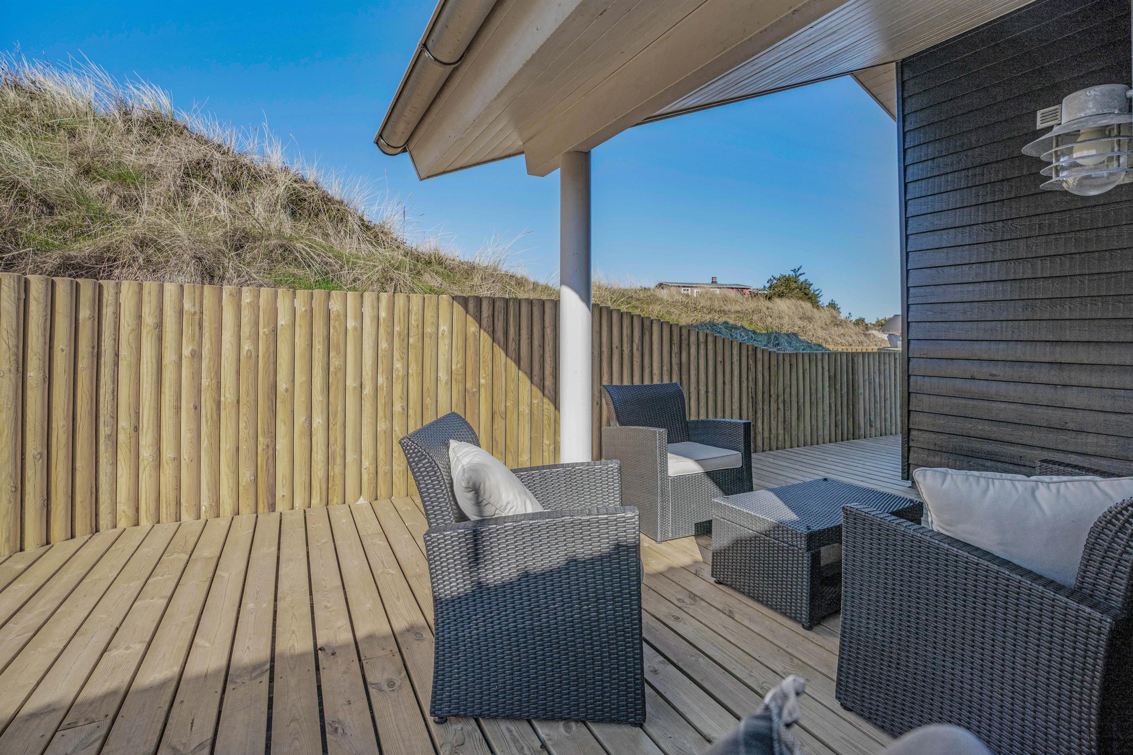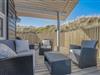 Fra opholdsrummet kommer du ud på sommerhusets skønne terrasse. Terrassen er godt afskærmet af de høje klitter, hvilket både resulterer i læ for vinden og ugenerede dage i solen for dit vedkommende. Under terrassens overdækkede del kan du slænge dig i loungemøblerne og nyde feriefreden i Bjerregårds naturskønne omgivelser.