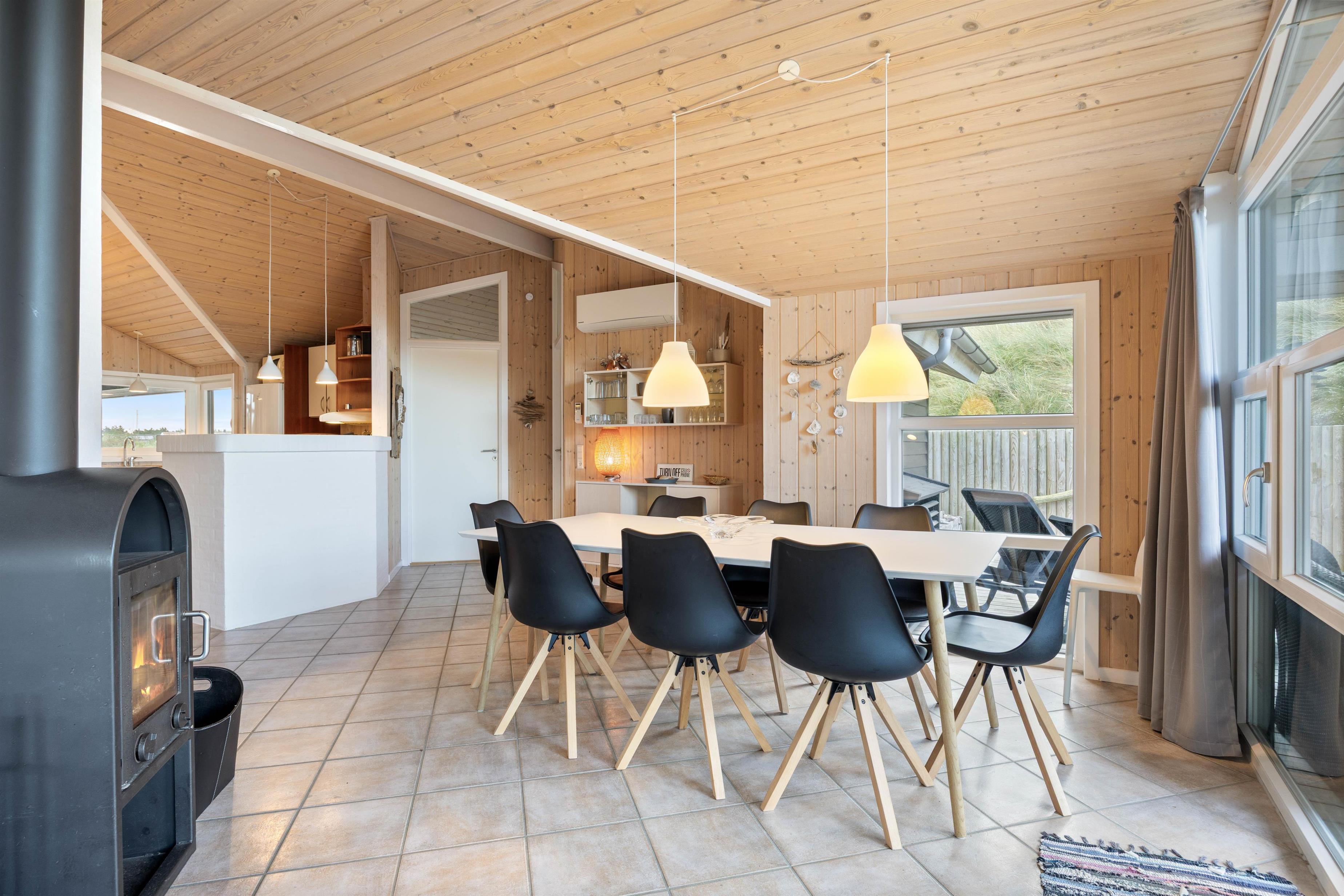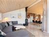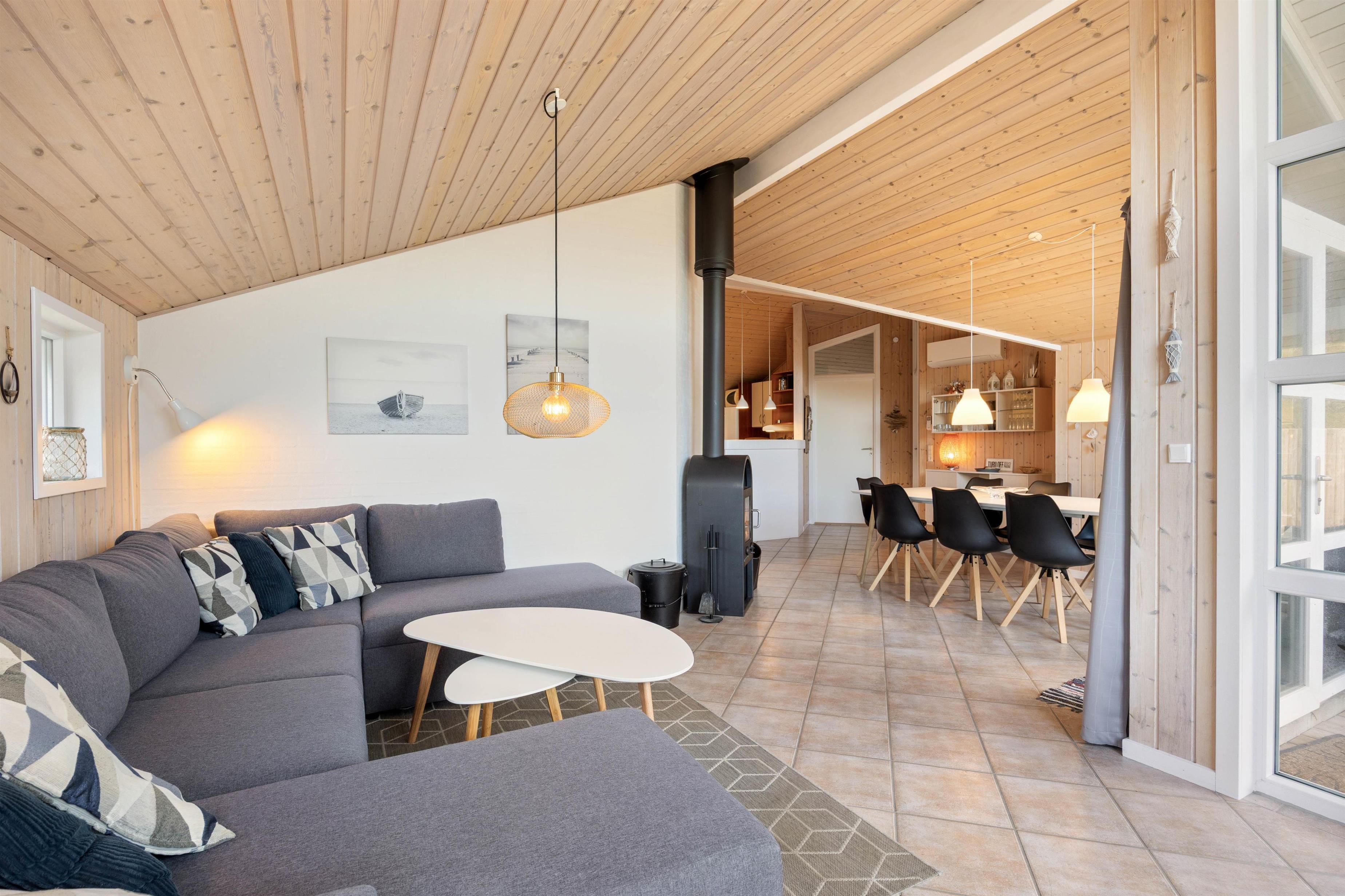 I opholdsrummet, der fungerer som feriehusets centrale mødested, sørger de lyse træoverflader og loftet til kip for en indbydende atmosfære – også godt hjulpet på vej af de store vinduespartier, der både inviterer den smukke natur og masser af sollys indenfor. Hele opholdsrummet er udstyret med gulvvarme, og med en god placering mellem sofahjørne og spiseafdeling sørger brændeovnen for hyggelig stemning hele året rundt.
