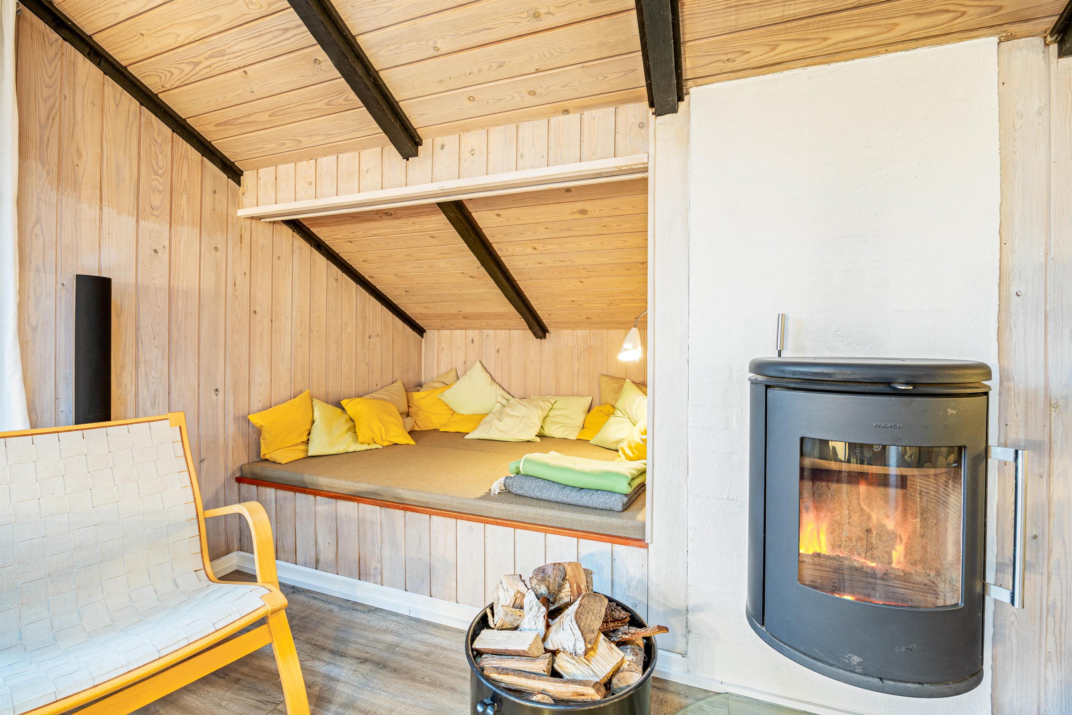 Det gode køkken centralt i feriehuset er åbent mod spisestuen og den gedigent møbleret opholdsafdeling. Her finder I bl.a. den lunende brændeovn og en hyggelig alkove til de mindste eller en afslappende stund for voksne. I kan med fordel også bruge den energibesparende varmepumpe.