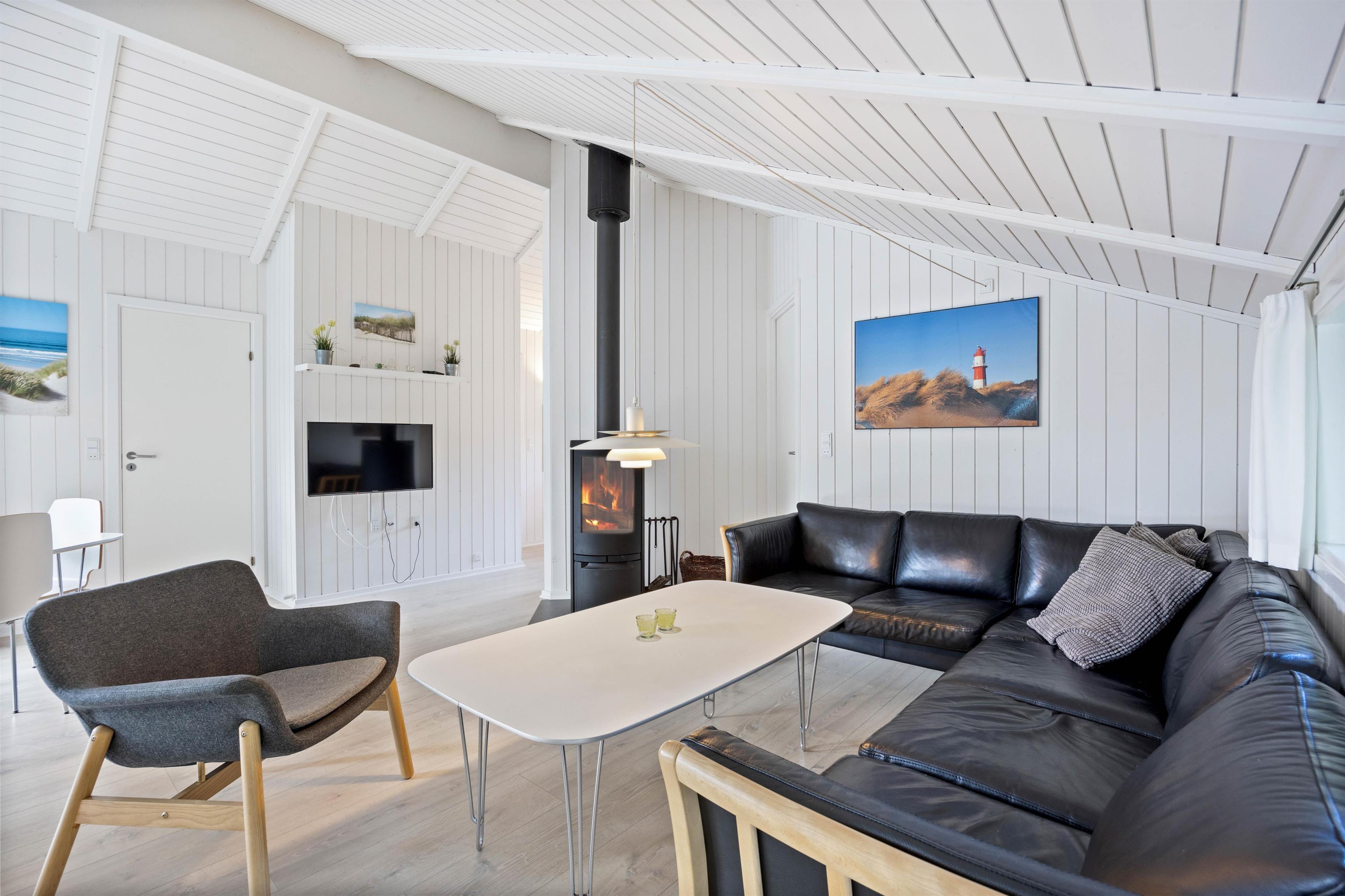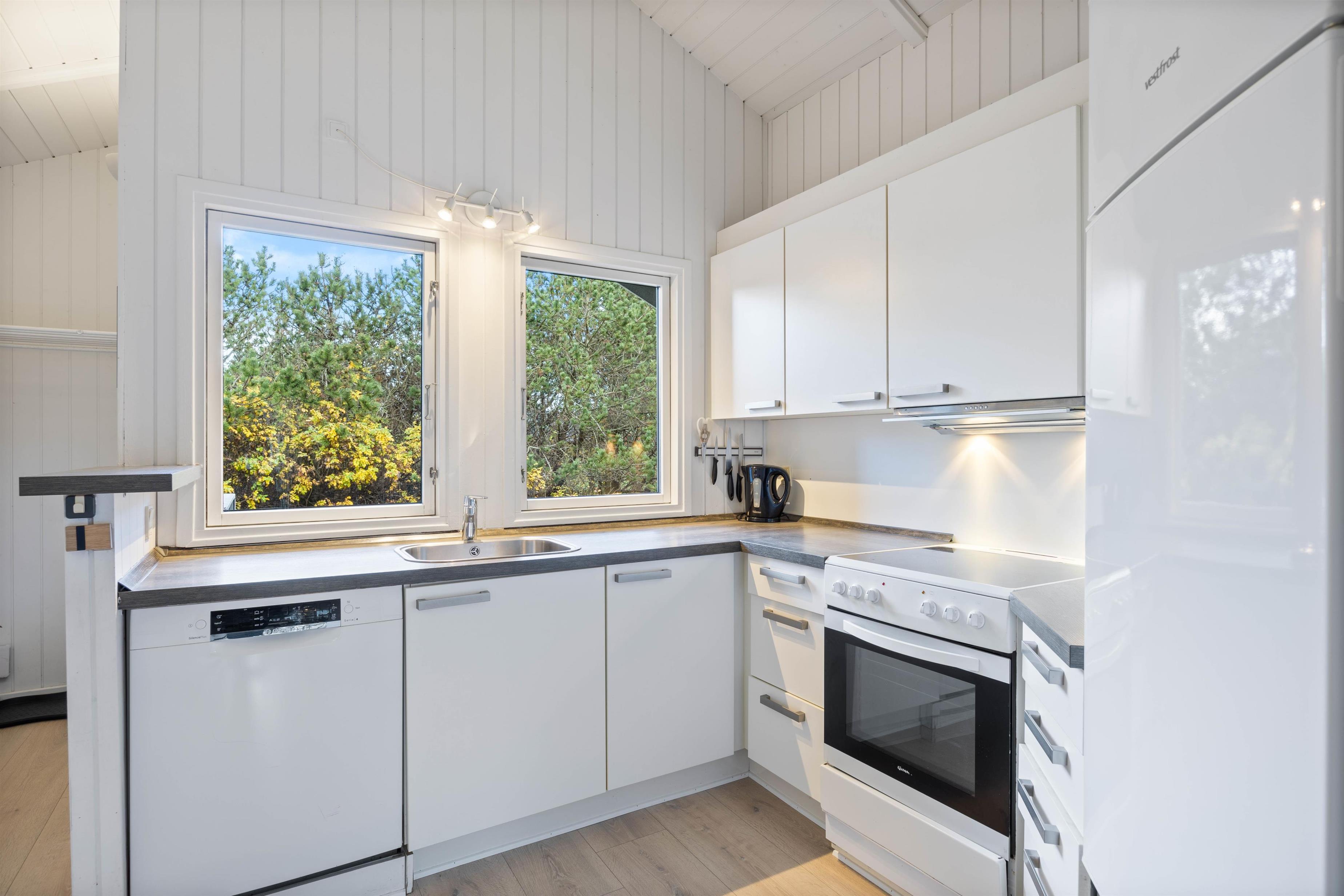 I feriehuset på Bilbergsvej 37 bliver stuen nemt det naturlige samlingssted. Her kan man hygge sig i sofagruppen, se en film sammen på TV’et, eventuelt med ild i brændeovnen. I køkkenet er der alt, hvad I behøver for at forkæle hinanden med lækre måltider, inklusive opvaskemaskine, mikroovn og fryser på 50 l.