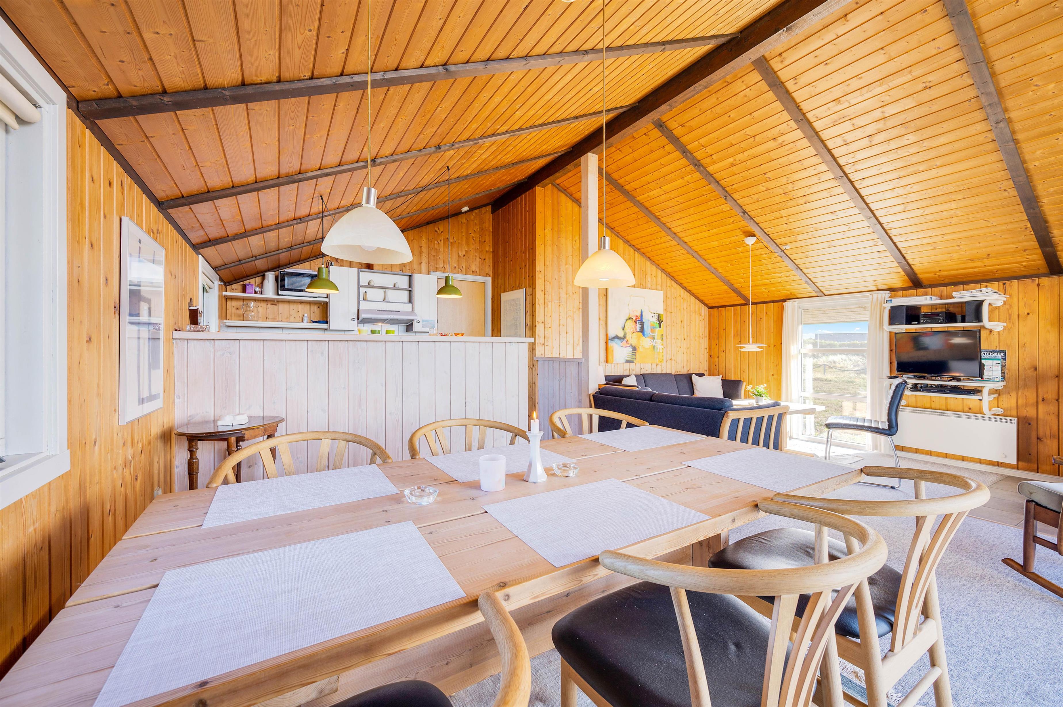 Sommerhusets hyggelige stue og køkken ligger i åben forbindelse, og her er der loft til kip med synlige bjælker. Køkkenet er praktisk udstyret med både opvaskemaskine, mikroovn og separat 10-liters fryser.