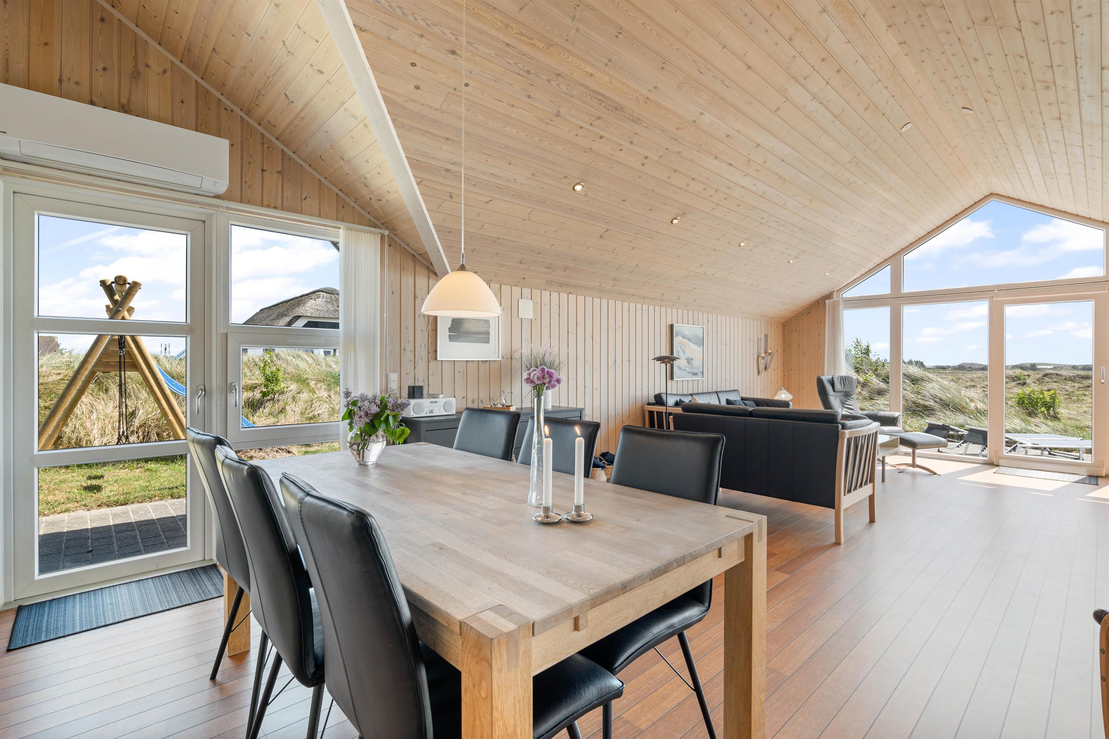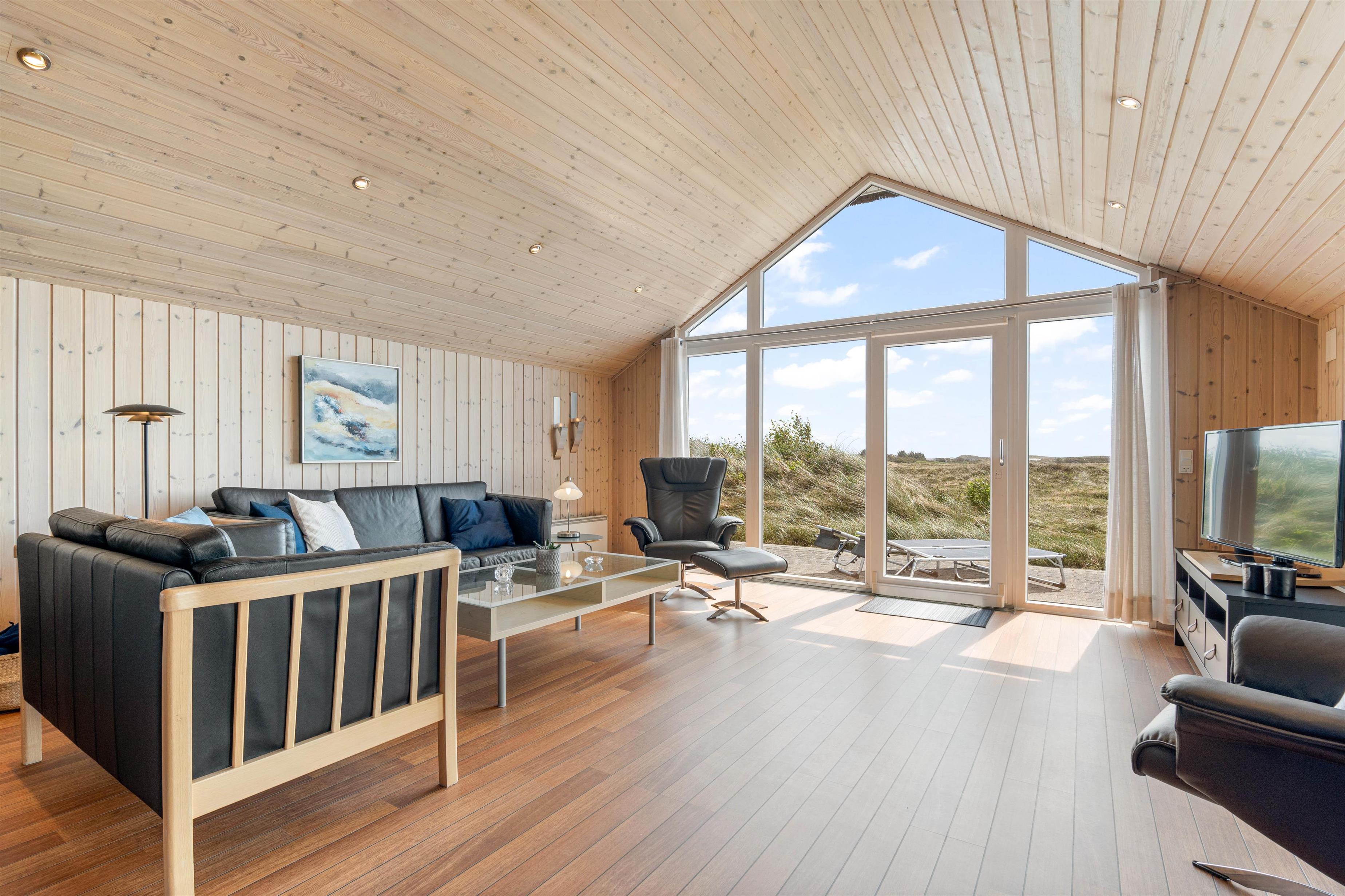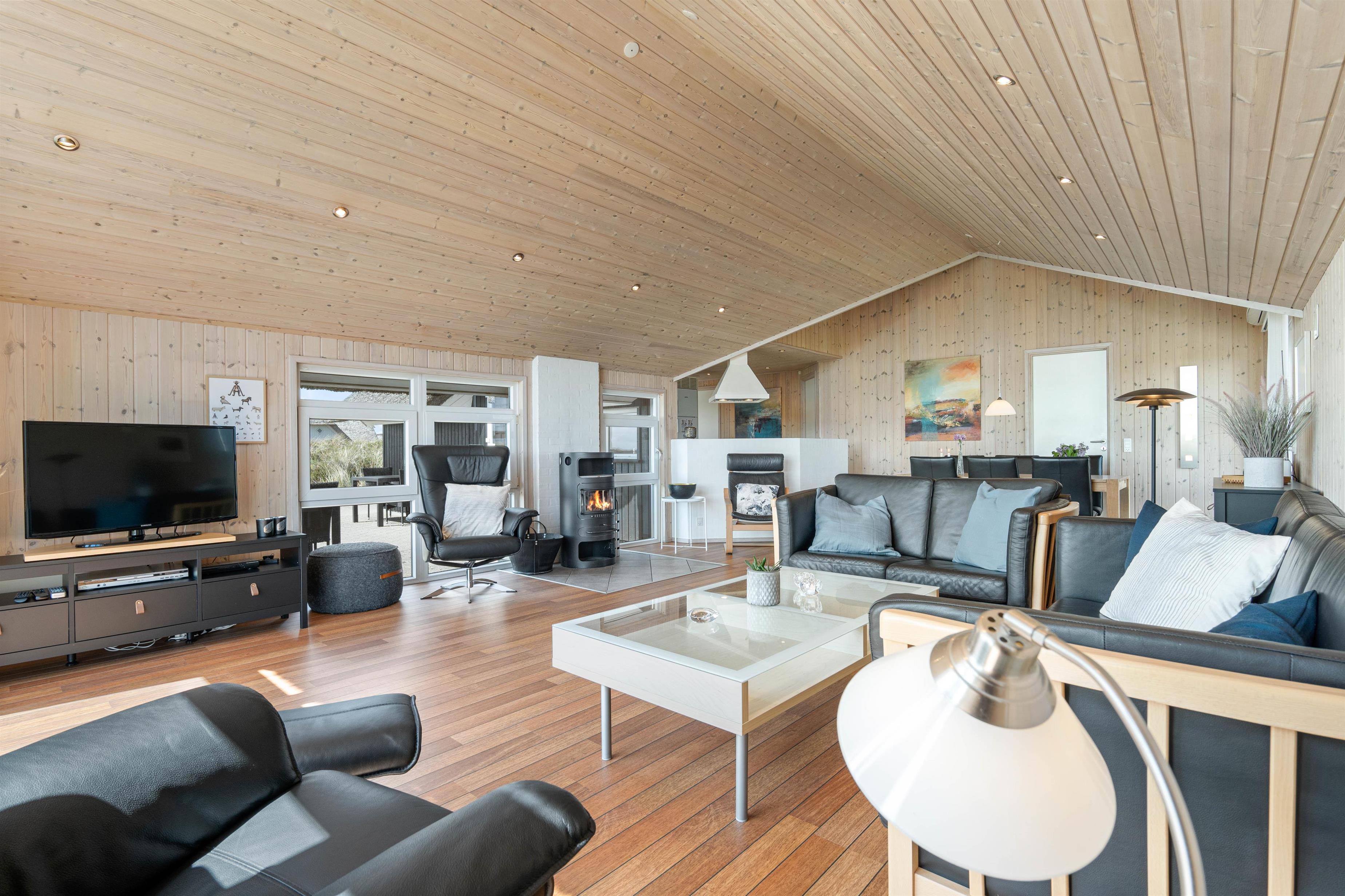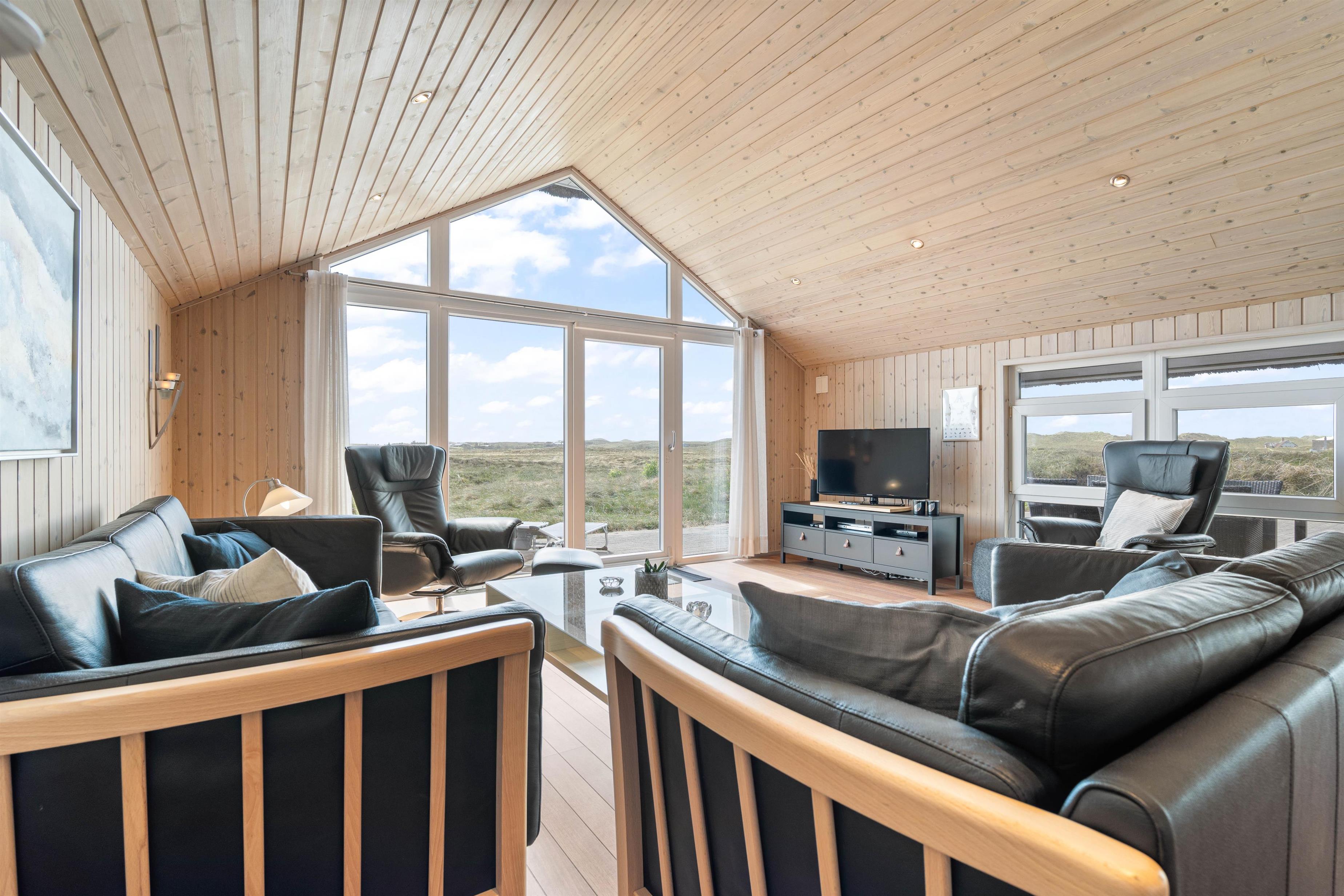 De store vinduespartier i stuen giver et naturligt lysindfald og en fantastiske udsigt ud over heden. Huset er bygget af kvalitetsmaterialer og smagfuldt indrettet med gedigne møbler. Som varmekilde er der både varmepumpe, brændeovn og el. De 3 store soveværelser er udstyret med kvalitets dobbeltsenge og klædeskabe. Alle 3 værelser har direkte udgang til terrasserne. Gratis wi-fi, dvd afspiller, Chromecast, parabol og DAB-radio.