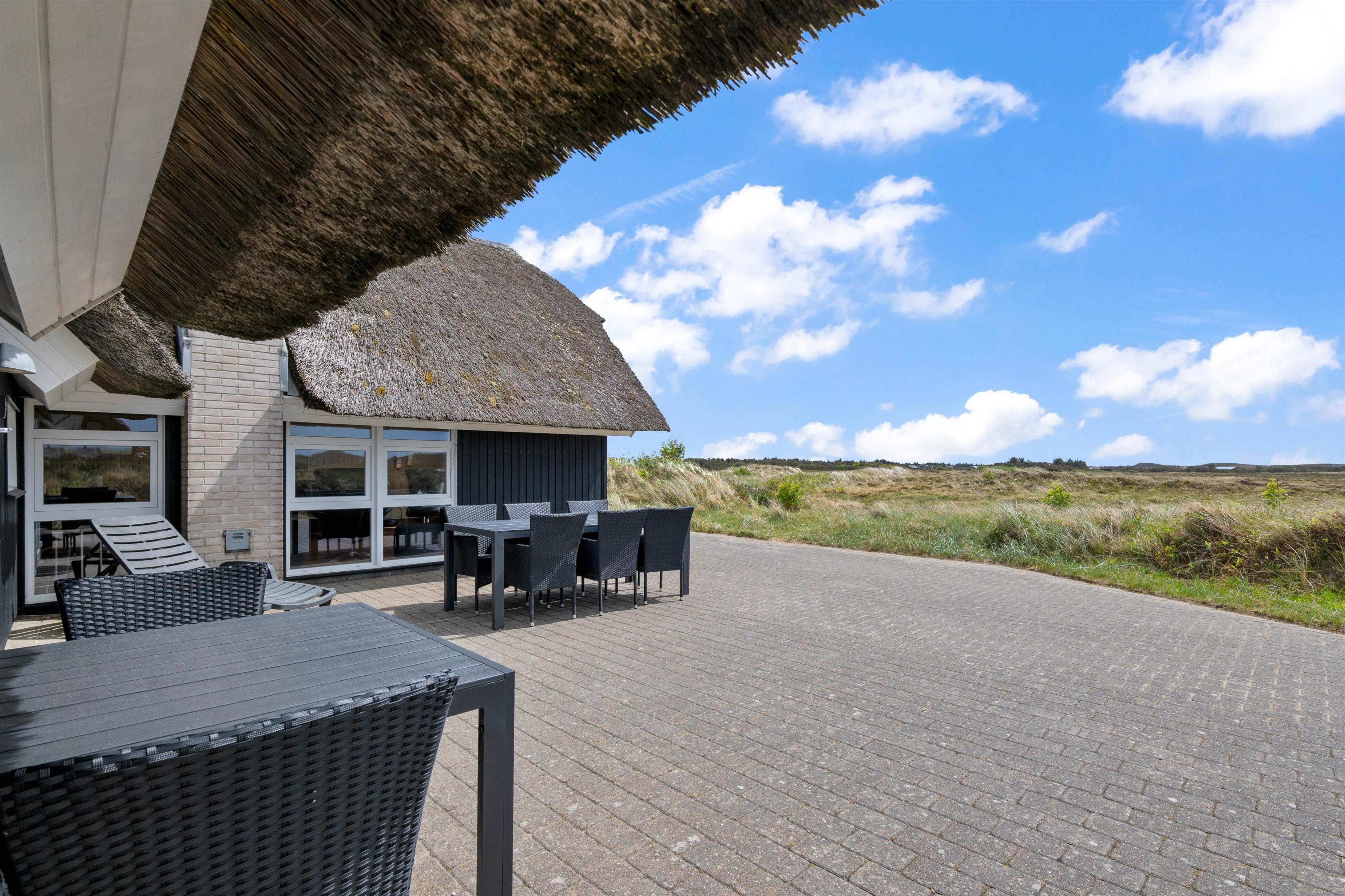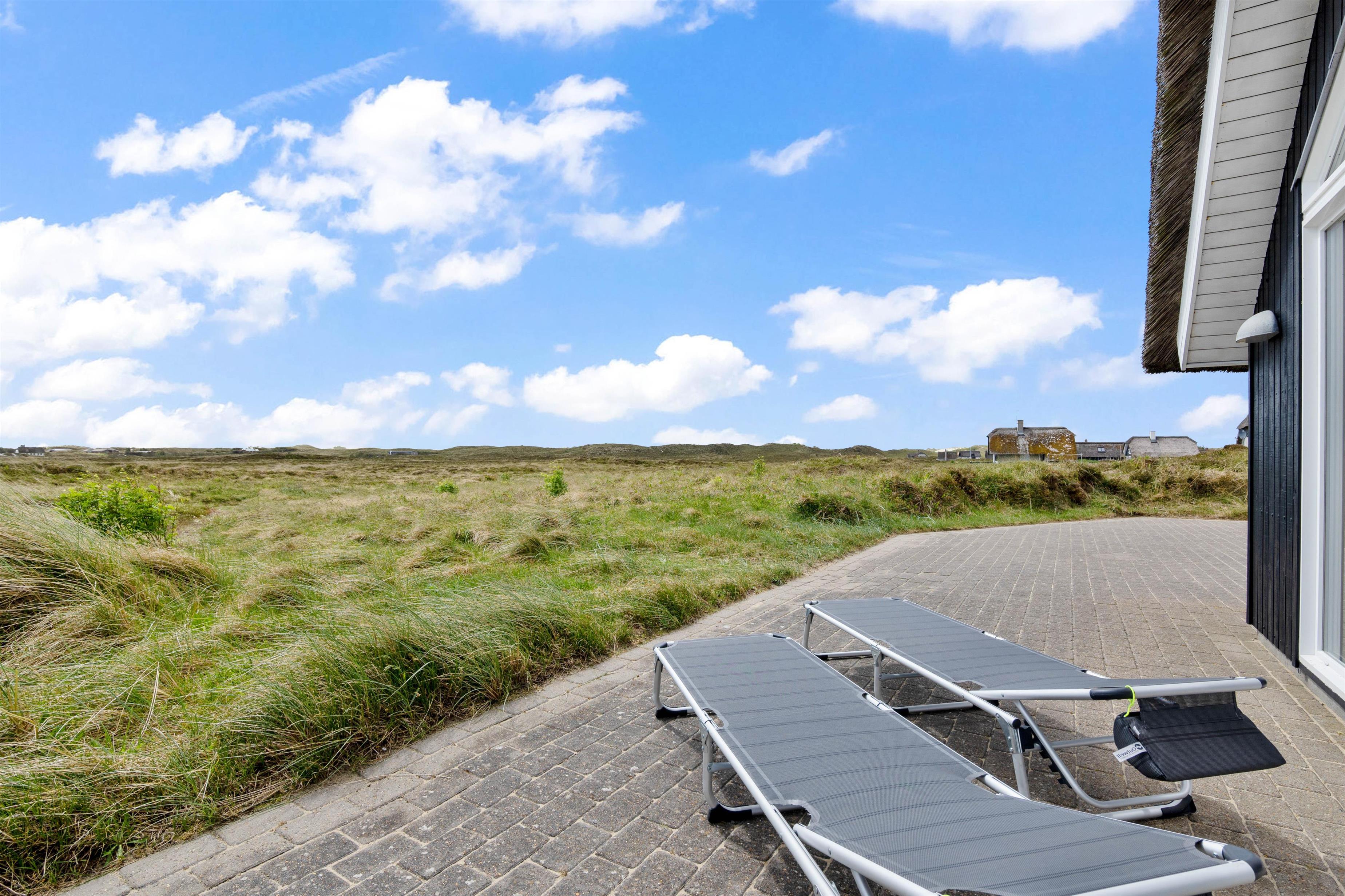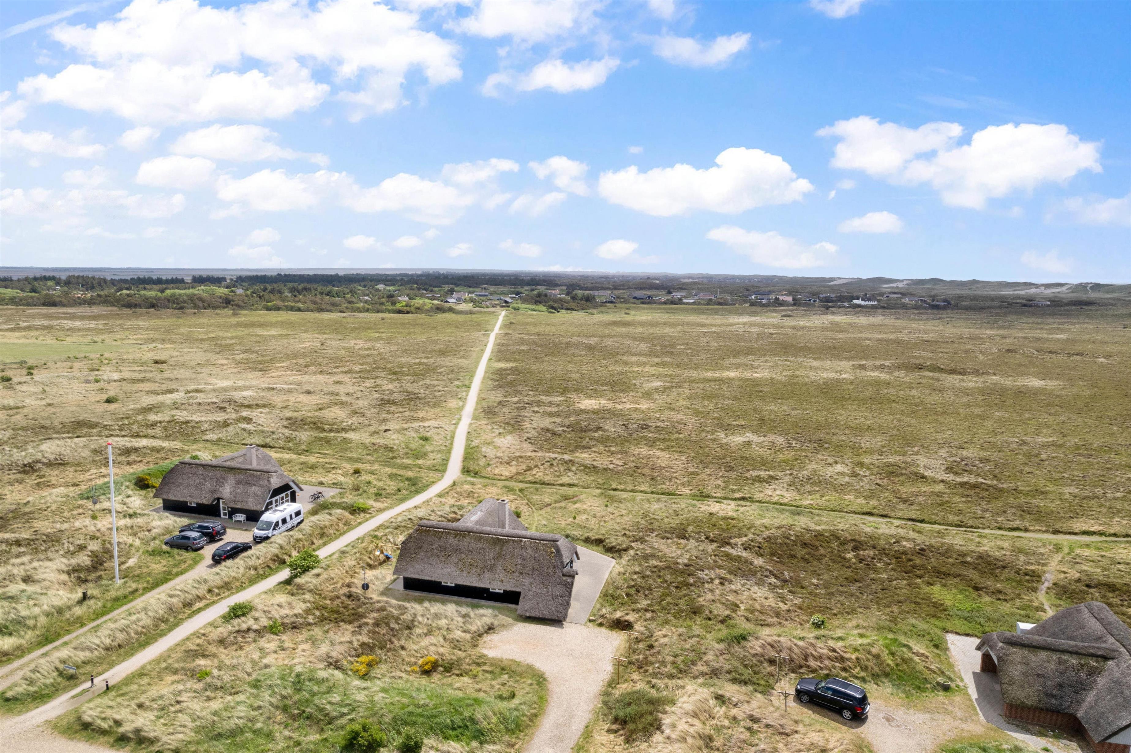 Huset ligger på en stor naturgrund dækket af lyng og marehalm direkte ud til det fredede lynglandskab. Omkring huset er der flere terrasser på i alt 150 m2 samt et legeområde til de mindste. Tæt på huset løber den gamle natursti som fører direkte ned til Vesterhavet over klitterne og gennem det unikke naturområde. Det smukke træhus er bygget i en for egnen traditionel stil med stråtag og som en særlig detalje er tagrygningen af lokal lyng.