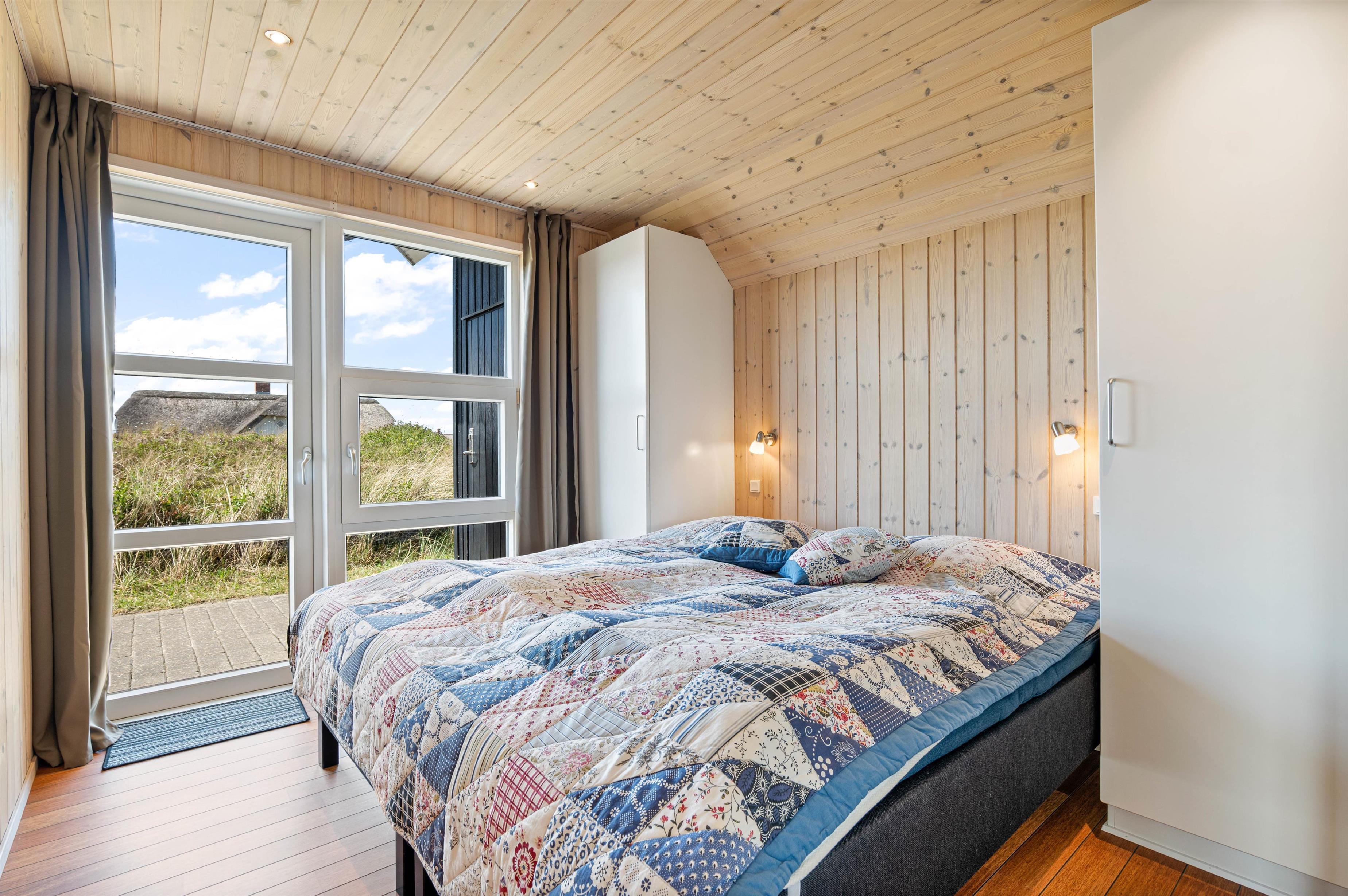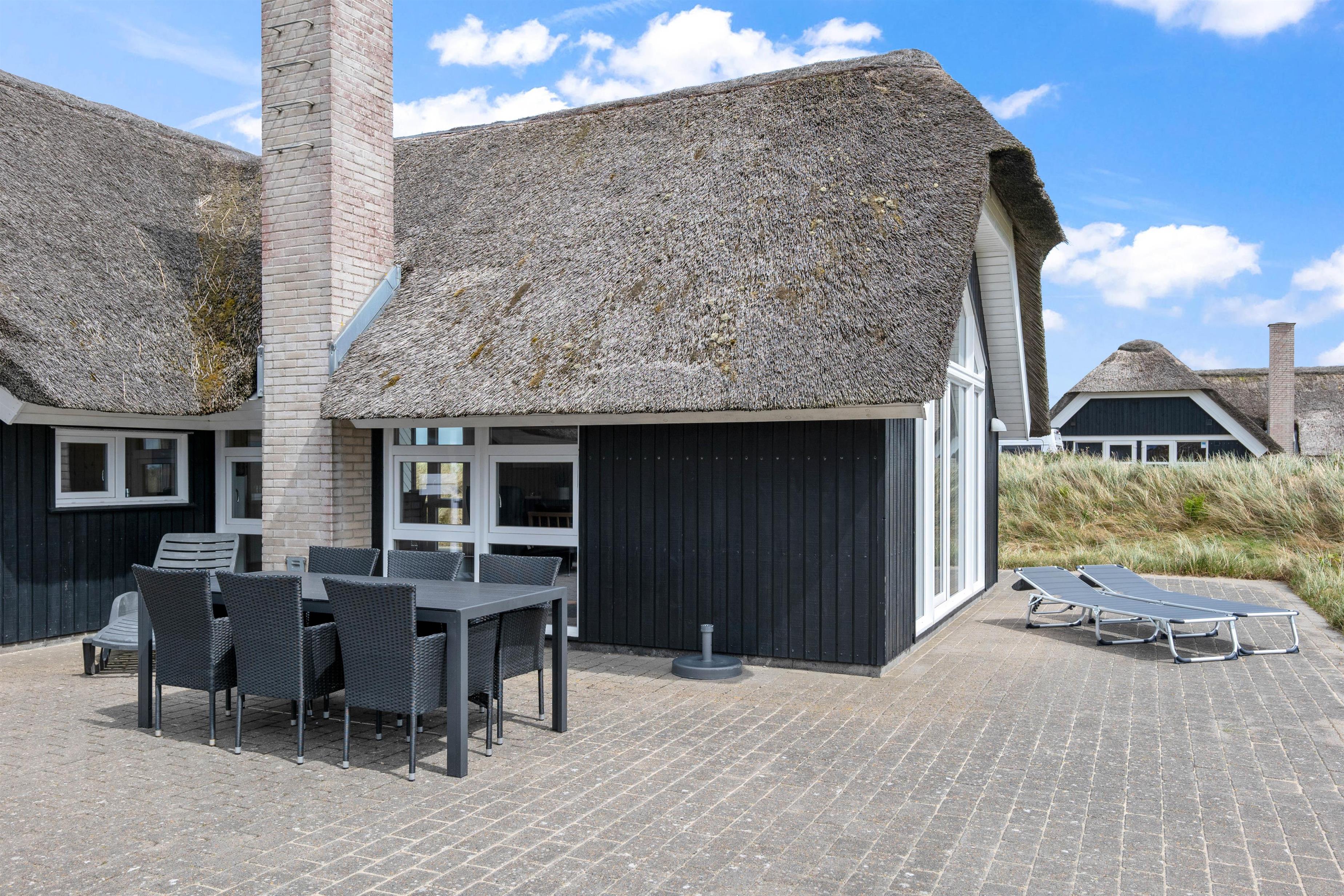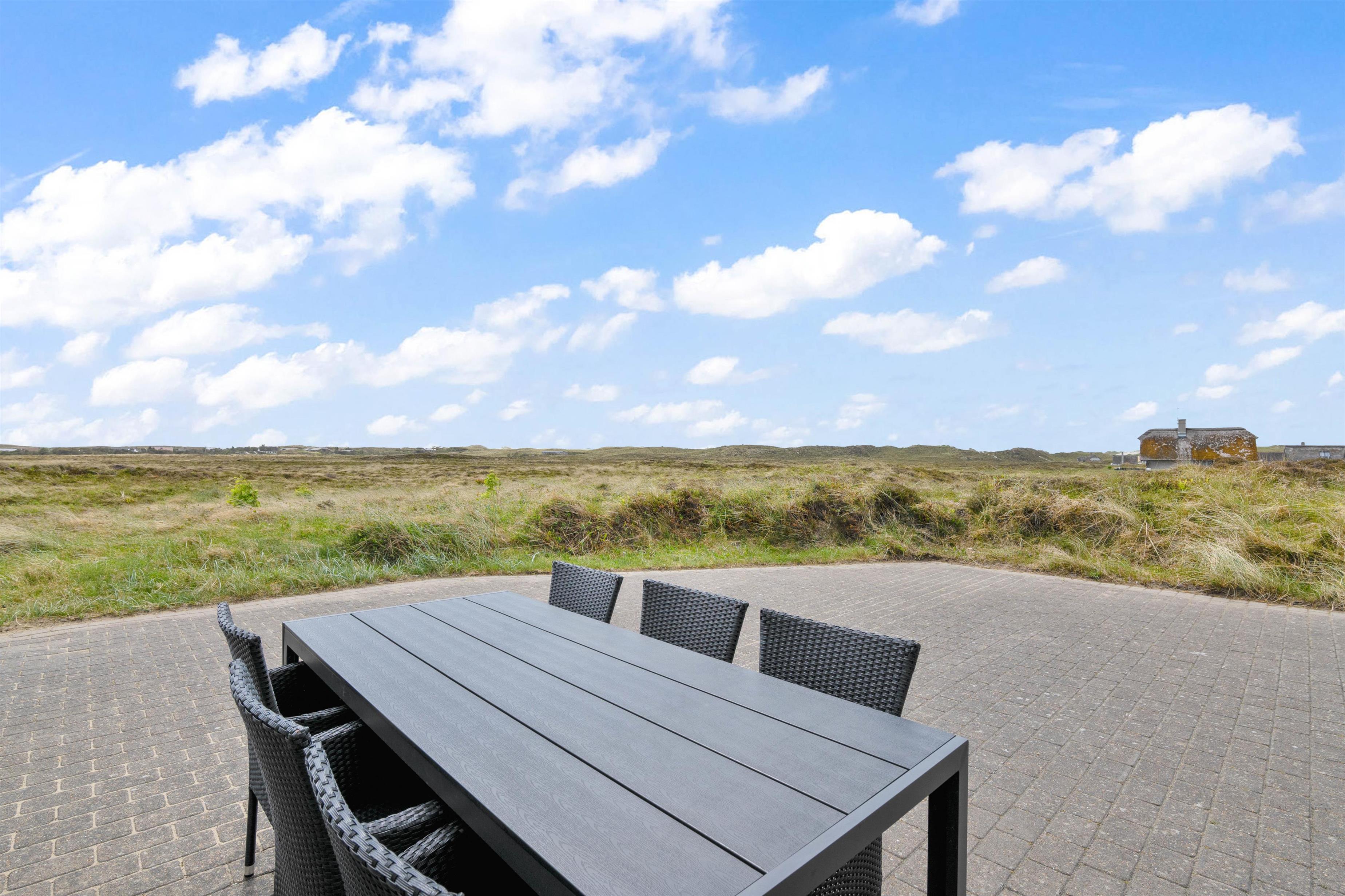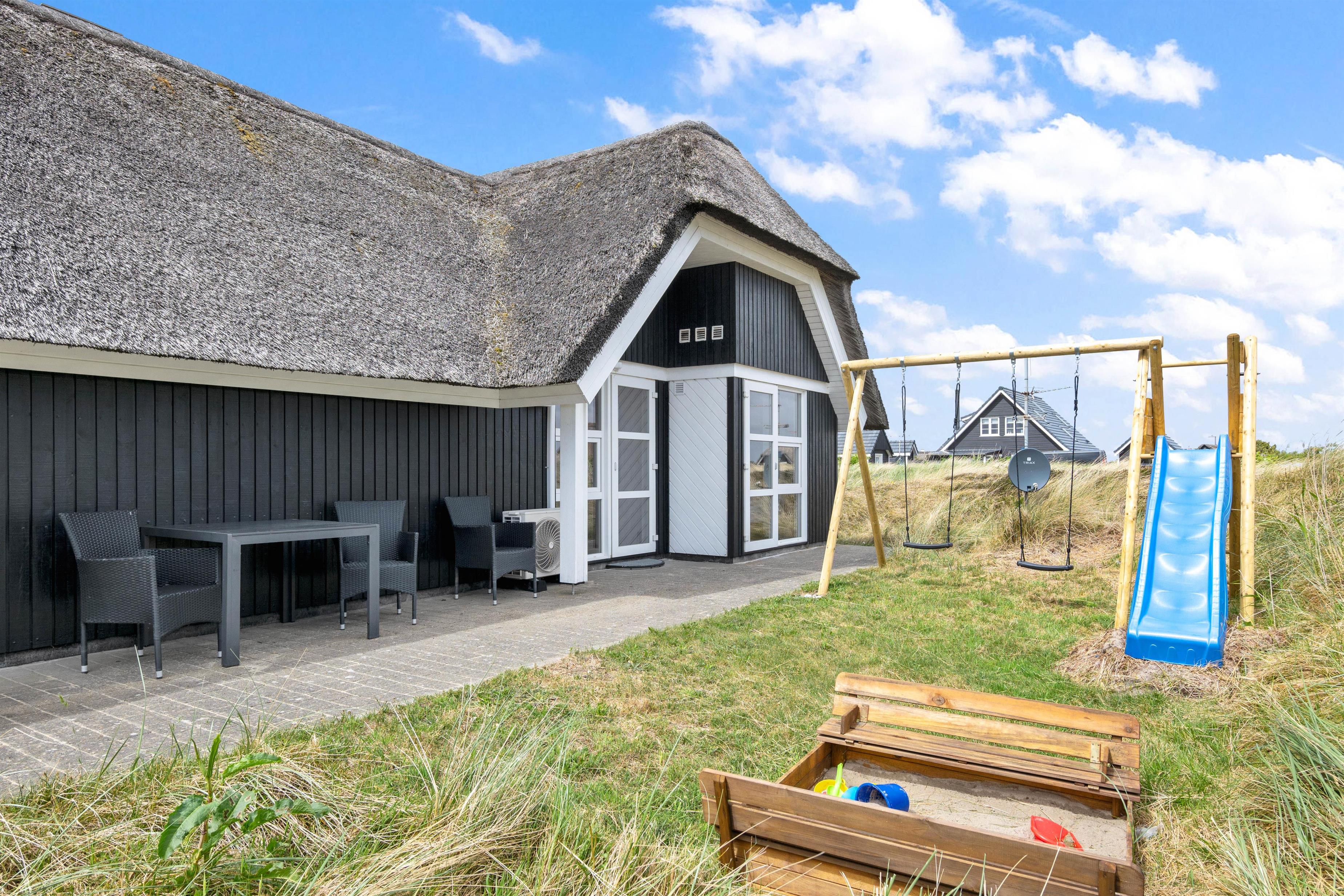 Huset ligger på en stor naturgrund dækket af lyng og marehalm direkte ud til det fredede lynglandskab. Omkring huset er der flere terrasser på i alt 150 m2 samt et legeområde til de mindste. Tæt på huset løber den gamle natursti som fører direkte ned til Vesterhavet over klitterne og gennem det unikke naturområde. Det smukke træhus er bygget i en for egnen traditionel stil med stråtag og som en særlig detalje er tagrygningen af lokal lyng.