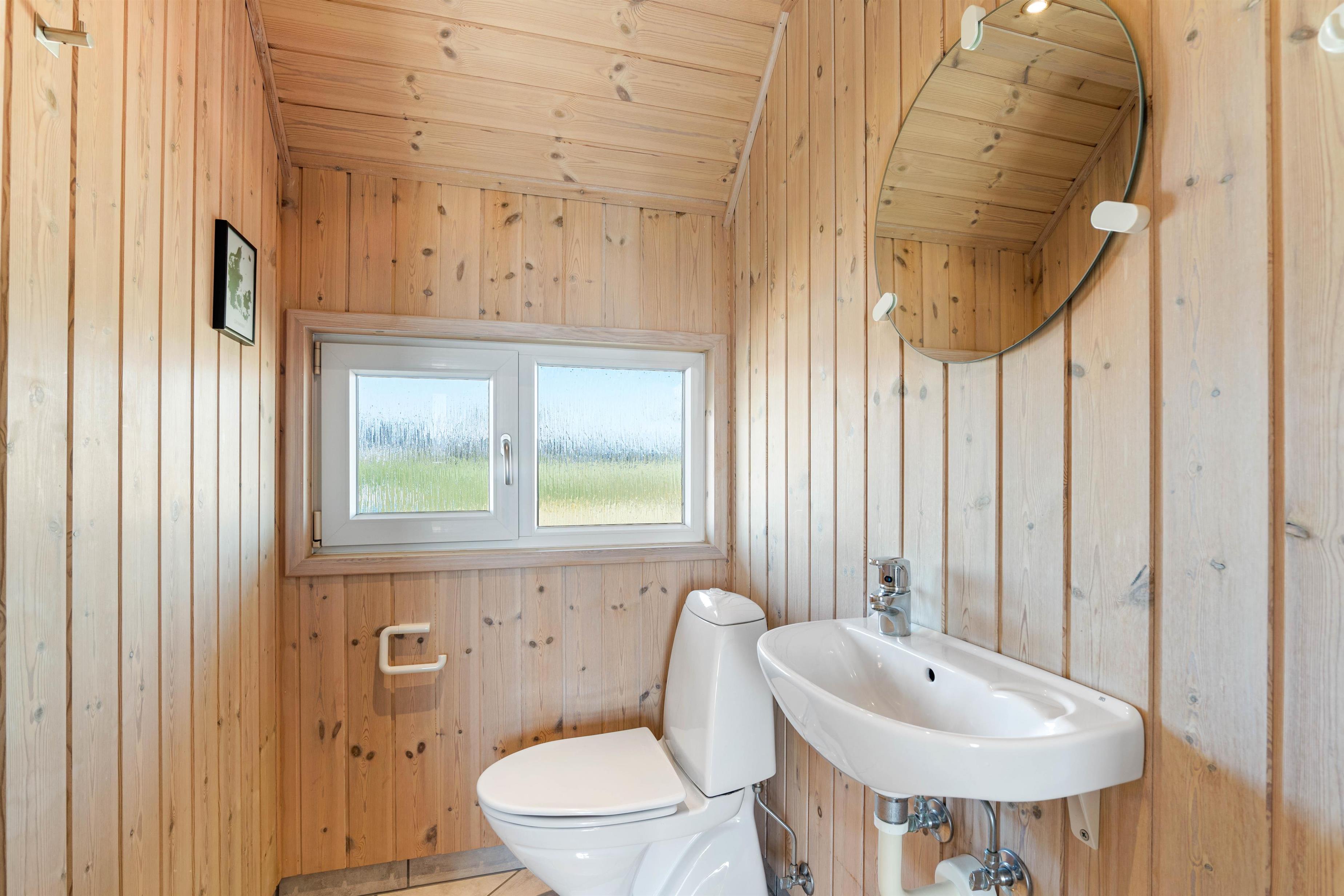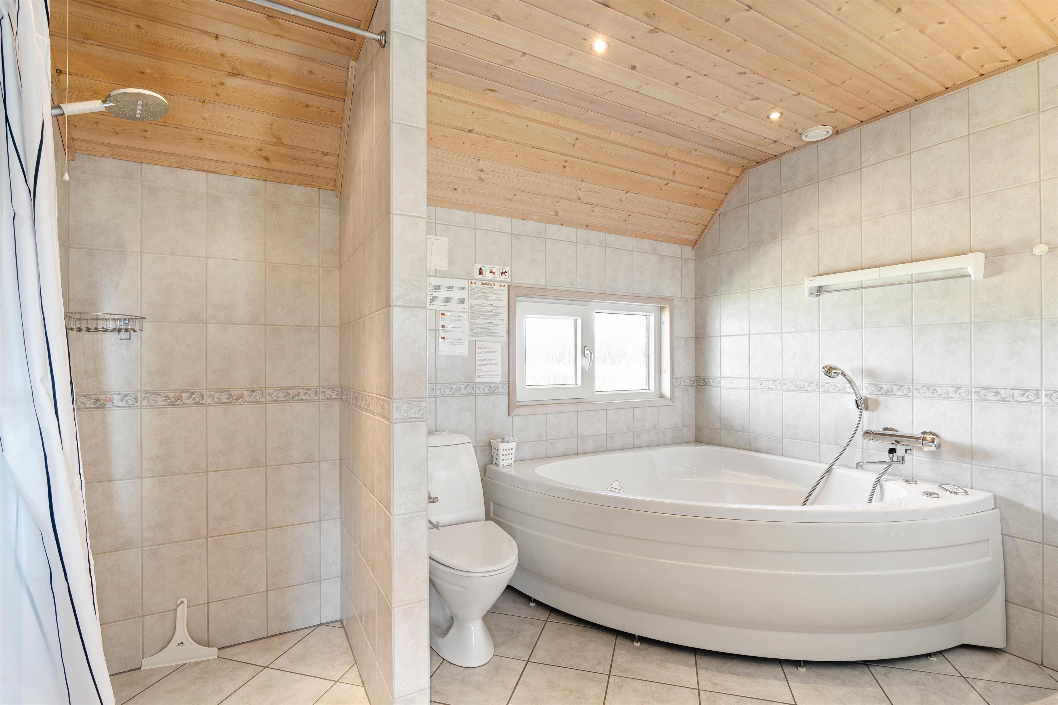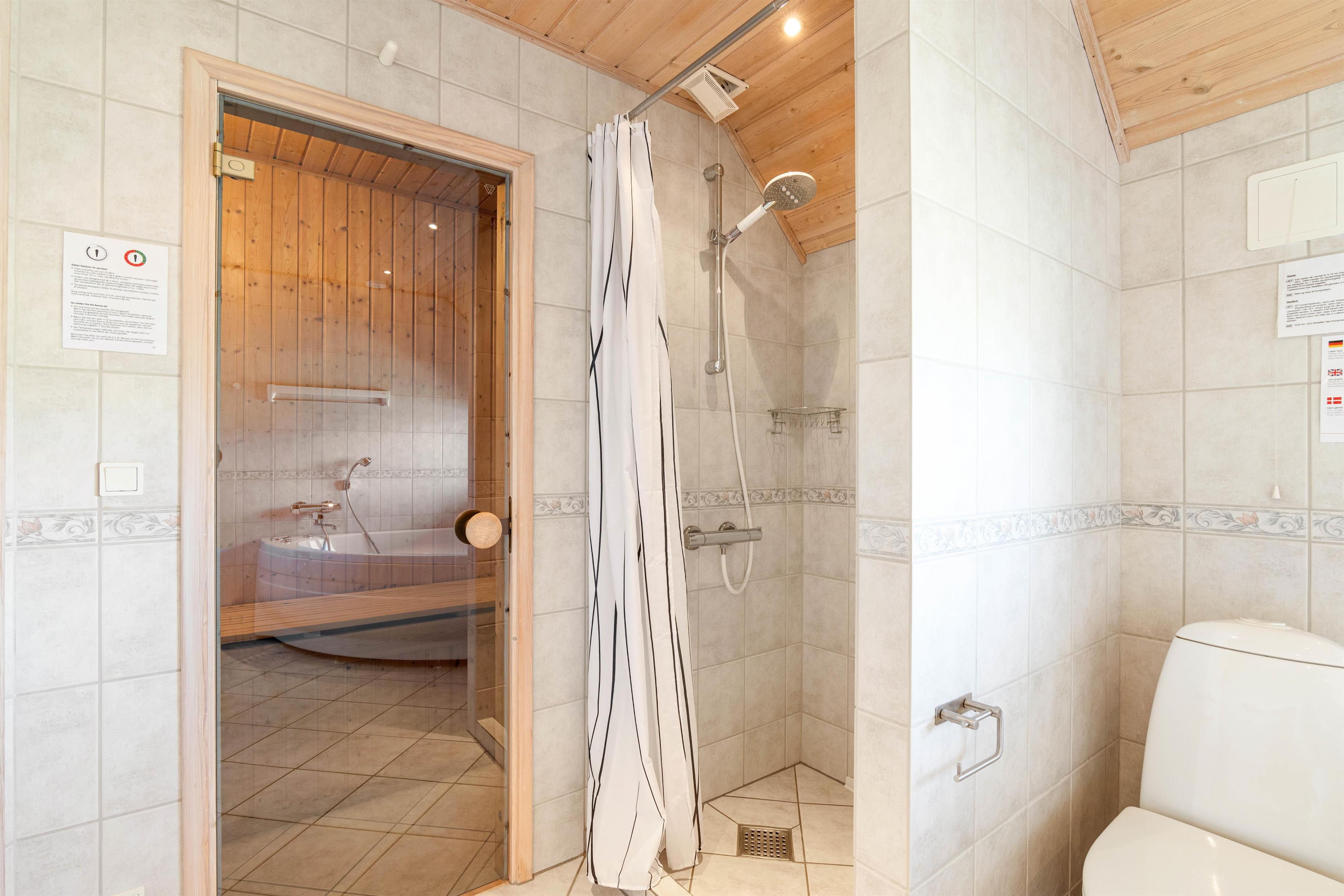 Huset har et stort badeværelse med selvstændig bruser, sauna og spa samt vaskemaskine og tørretumbler. Derudover et mindre badeværelse med toilet og håndvask.