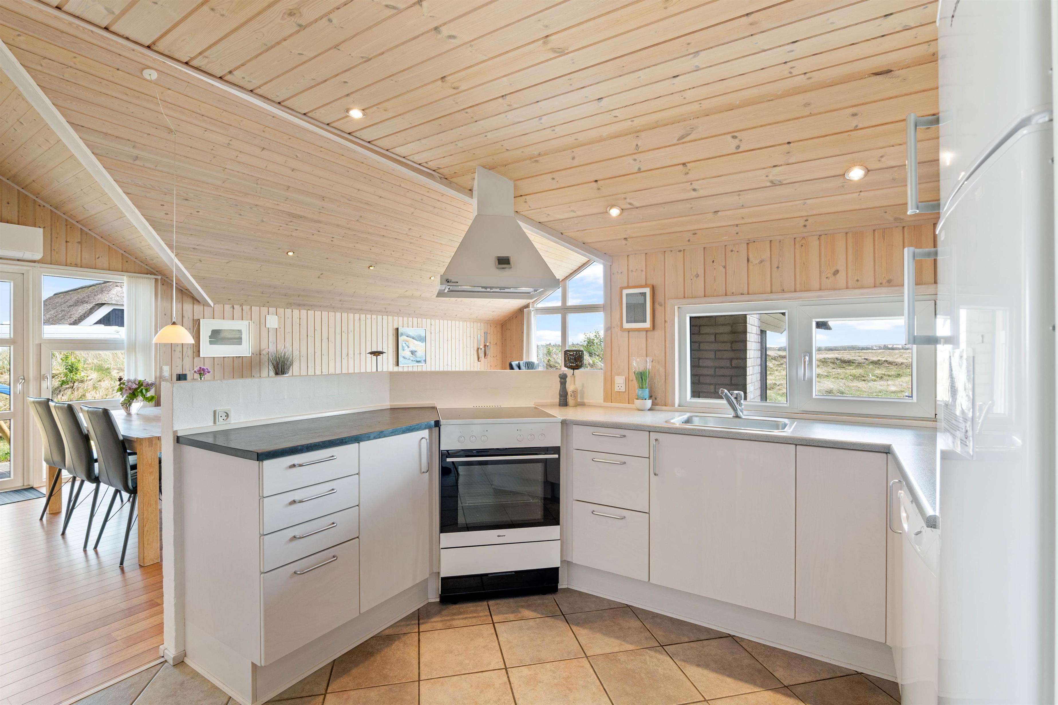 Midt i huset i åben forbindelse med stuen er det veludstyrede køkken.