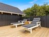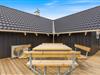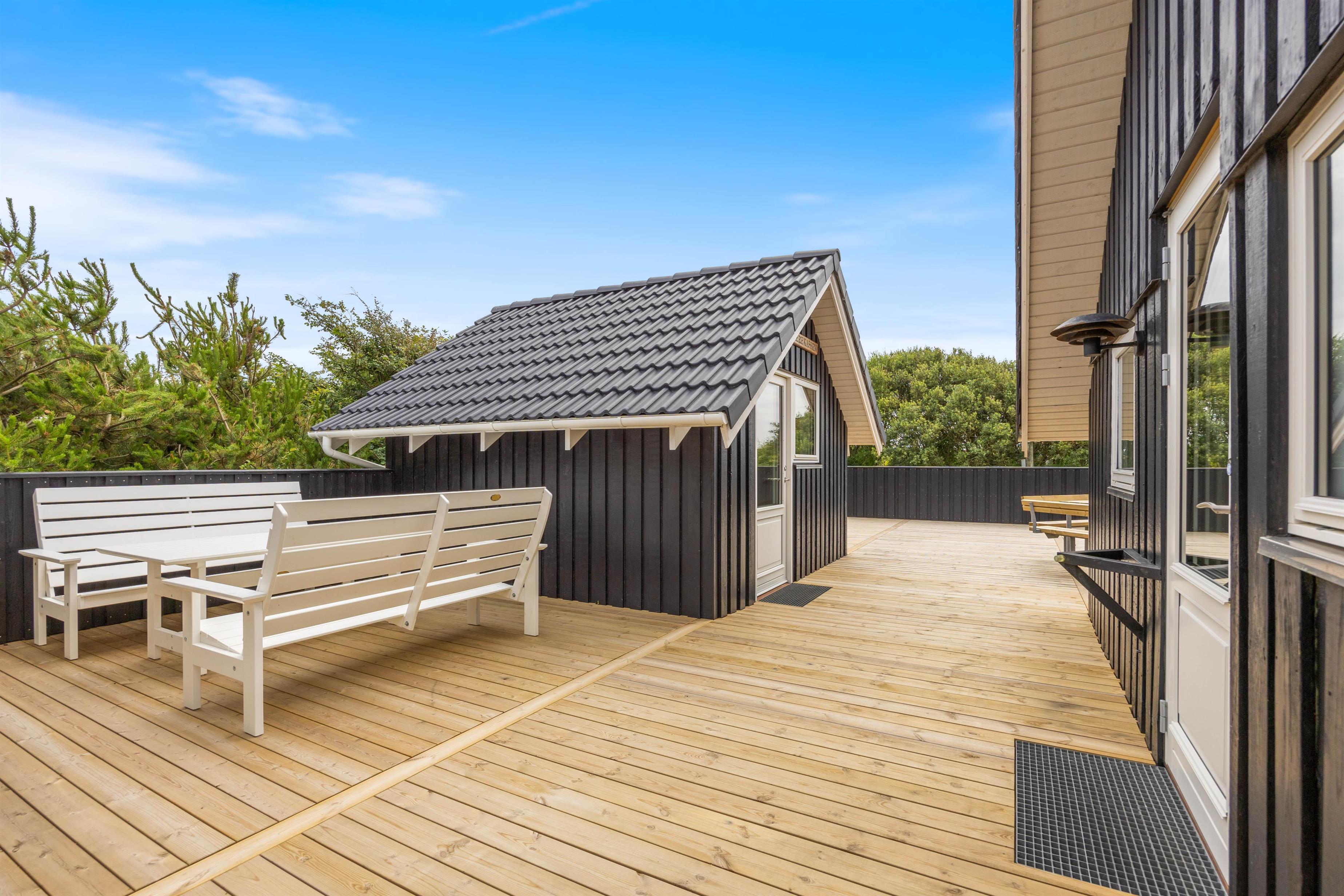 Rundt om hele ferieboligen er der anlagt en skøn fliseterrasse, og der er mange dejlige kroge, der giver mulighed for at nyde solen fra den smukke solopgang mod øst til den lige så betagende solnedgang mod vest. Fra opholdsstuen er der udgang til den sydvendte del af terrassen, og her kan I slappe af, mens børnene leger på den store plænegrund med gynger og sandkasse inden for synsvidde.