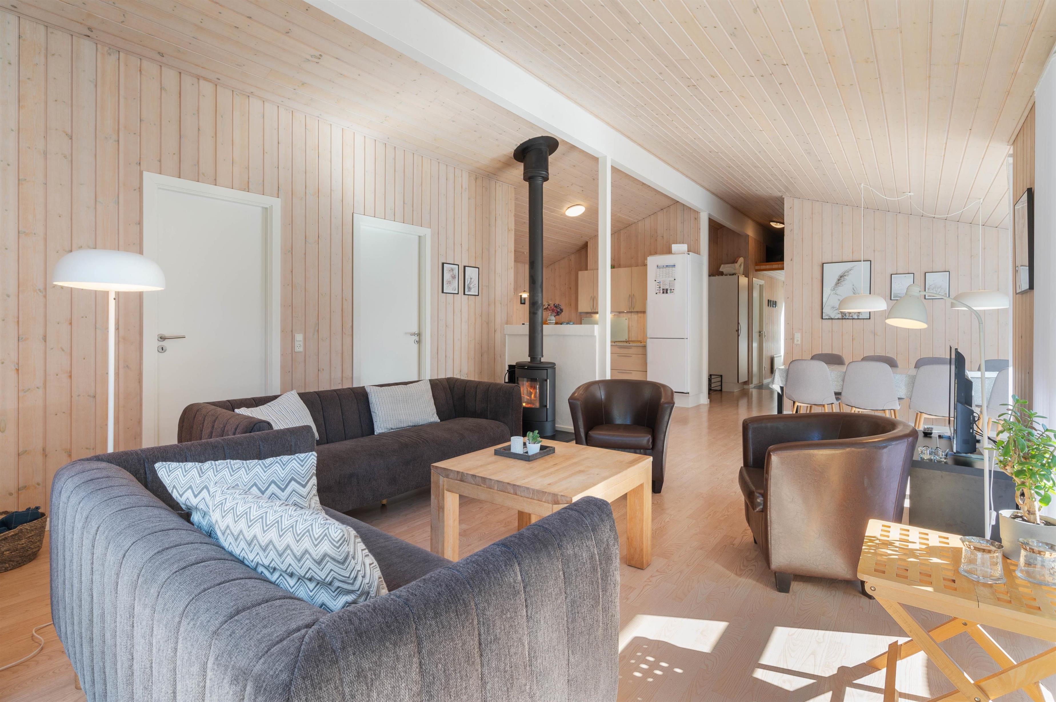 I køkkenet er der god plads, så I kan hjælpes ad og hygge jer med madlavningen. Og i stuen er der indsat store vinduespartier, hvilket ikke alene giver et godt lysindfald, men også muligheden for at sidde inde og nyde de grønne omgivelser. Som et ekstra plus er der både brændeovn og en energibesparende varmpepumpe i sommerhuset.