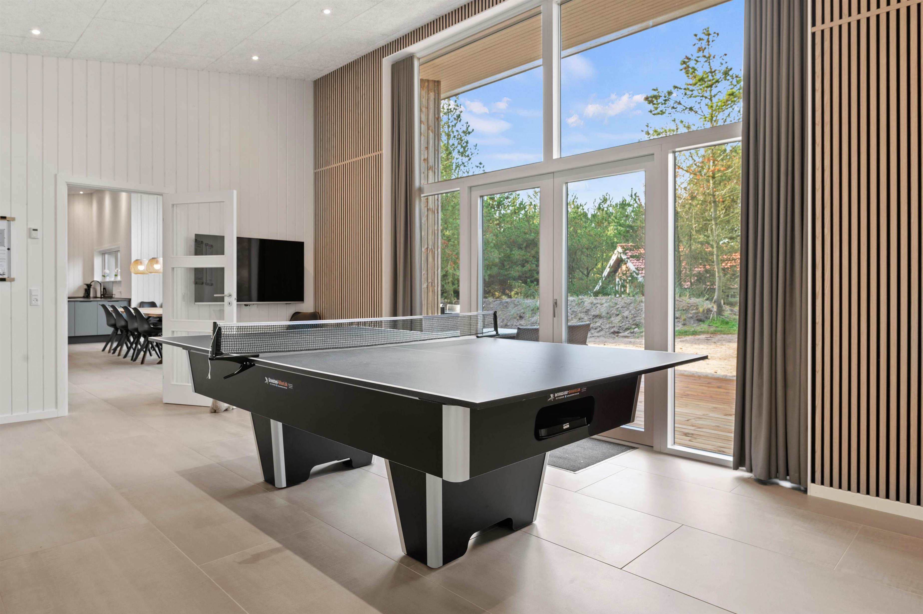 Det moderne indrettede feriehus har meget at byde på. I den rummelige stue kan du hygge dig med tv, arrangere en spilaften eller læse en god bog ved varmen fra brændeovnen. Mere fysiske aktiviteter, som bordtennis og billard foregår i aktivitetsrummet. Der er gulvvarme i stuen samt alle badeværelser, og energibesparende opvarmning fra varmepumpen.