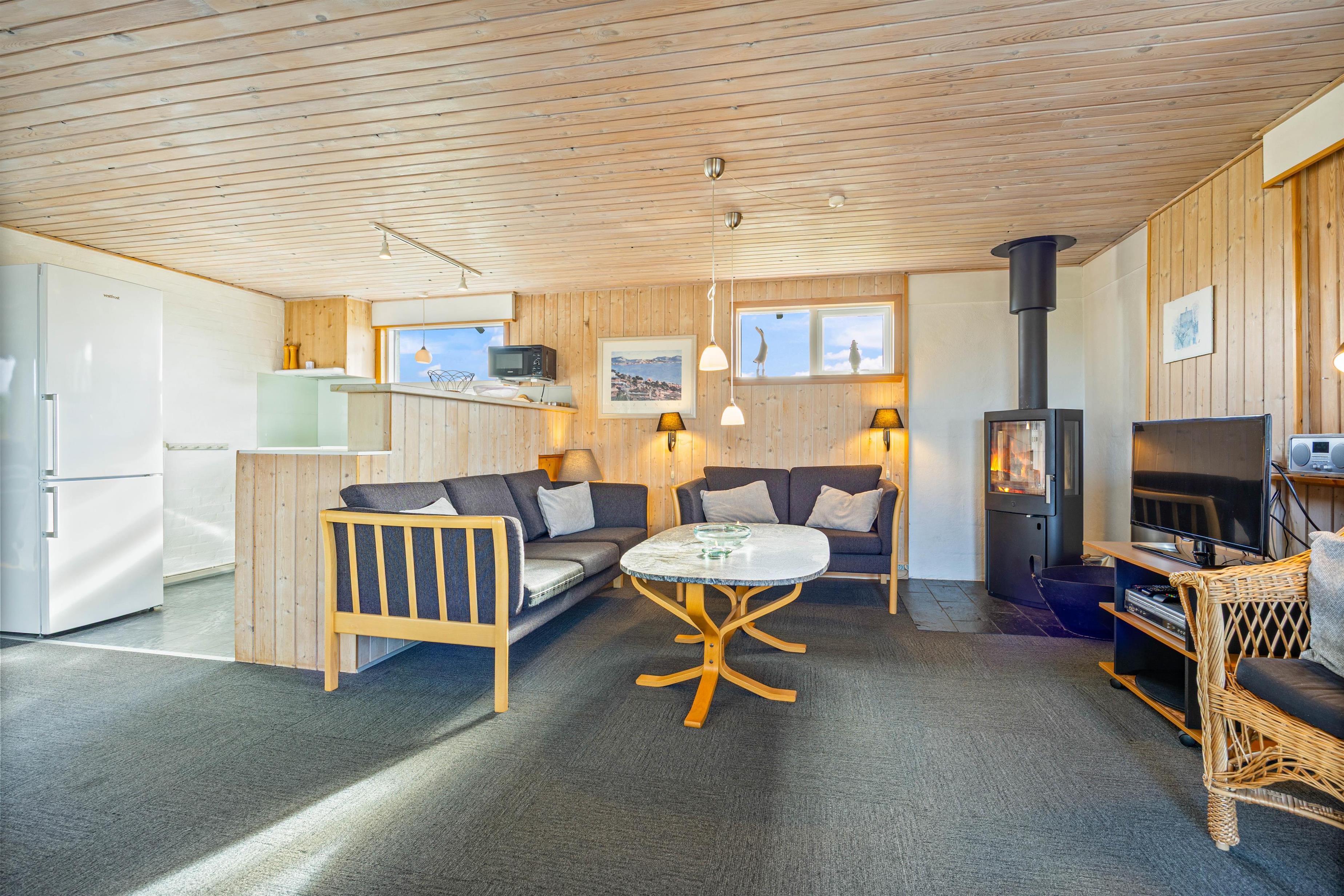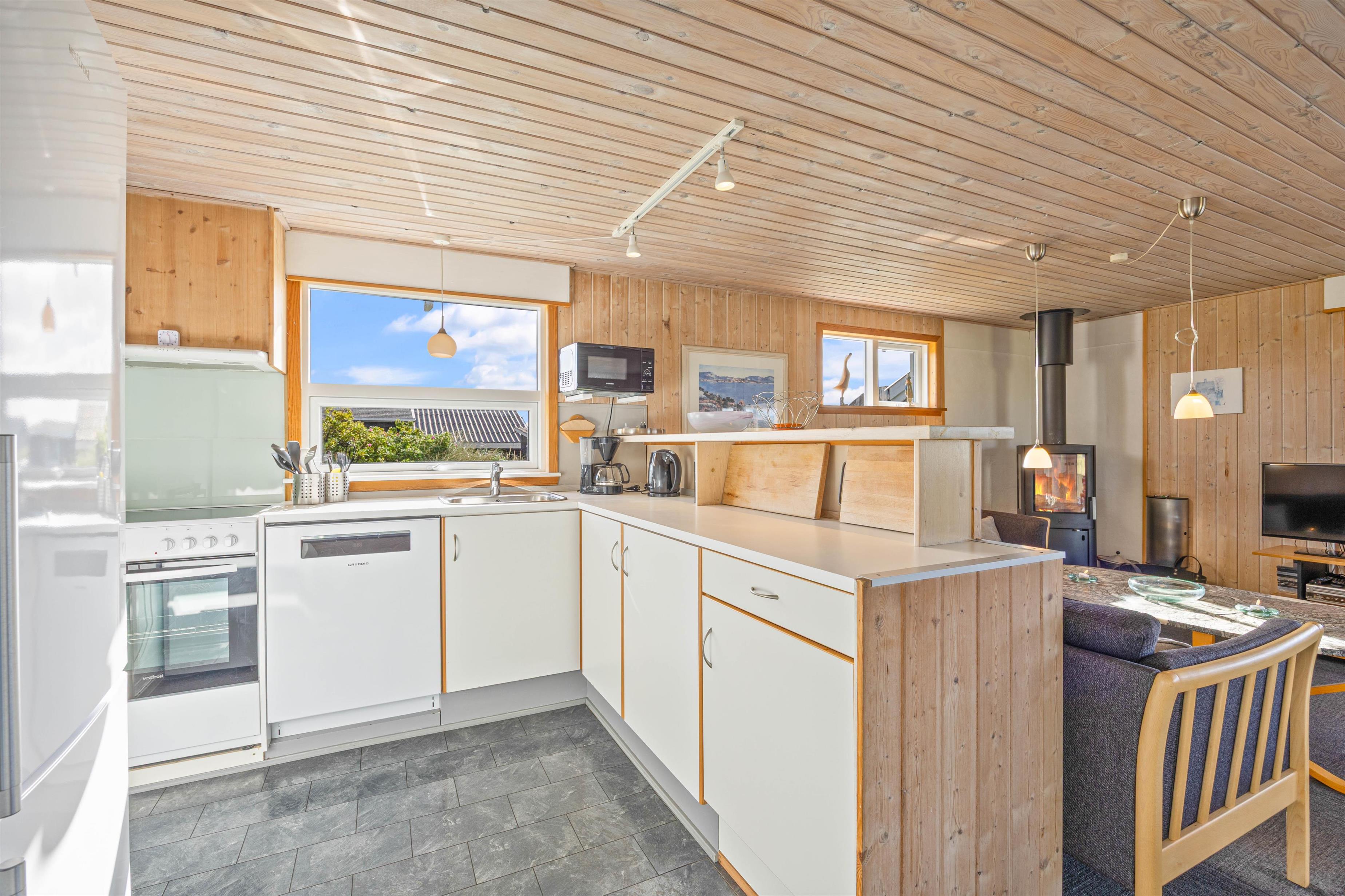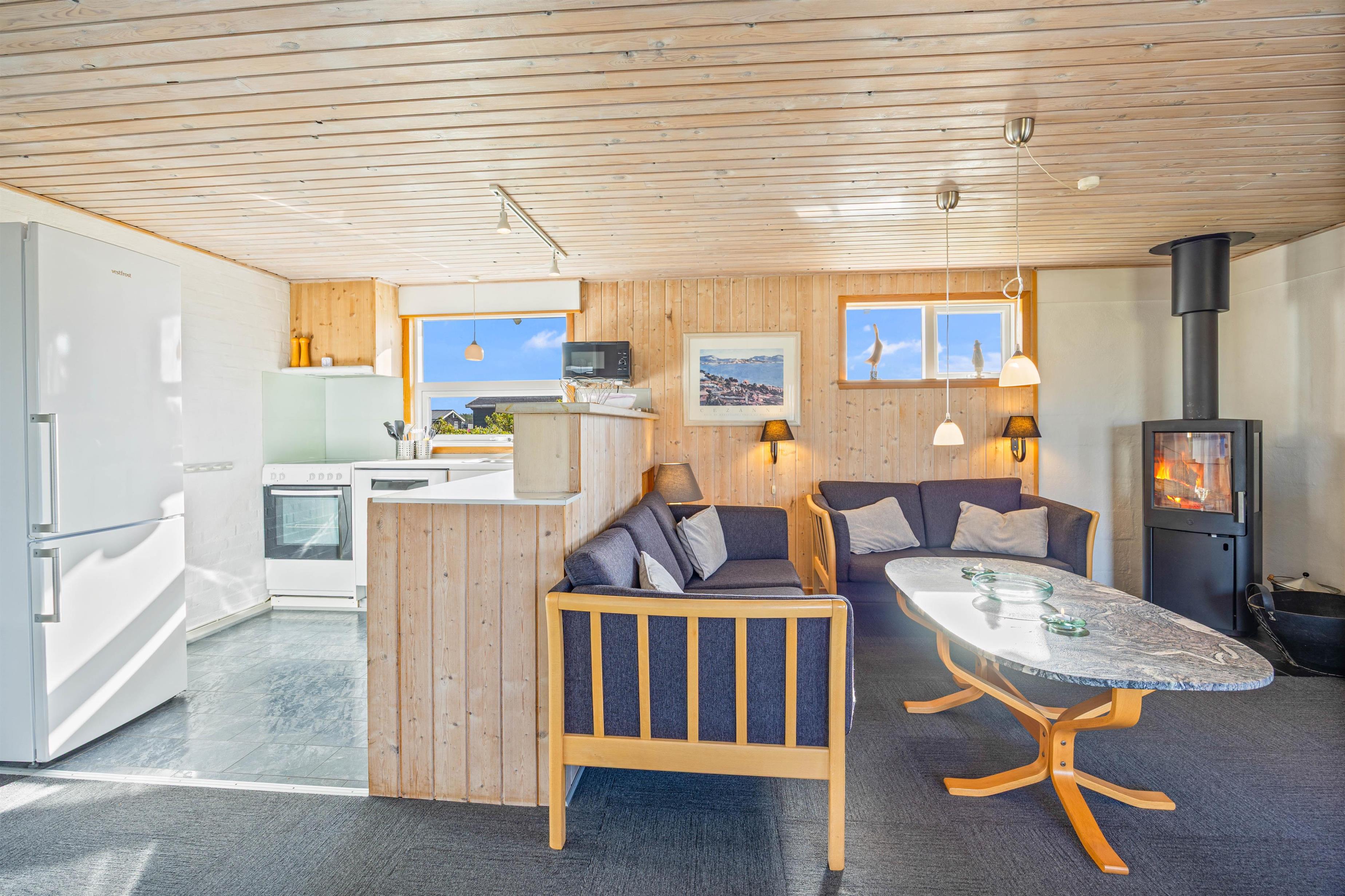 Det åbne- og funktionelt indrettede køkken i forbindelse med stue med komfortabel spiseafdeling og hyggeligt opholdsområde med hjørnesofa og brændeovn er hjertet i dette klassiske sommerhus. Især lystfiskere vil blive glade for den separate fryser, men det er også udstyret med opvaskemaskine og mikrobølgeovn. De store vinduespartier giver et godt lysindfald, så I kan lægge et puslespil ved spisebordet eller læse en god bog ved den knitrende ild i brændeovnen.