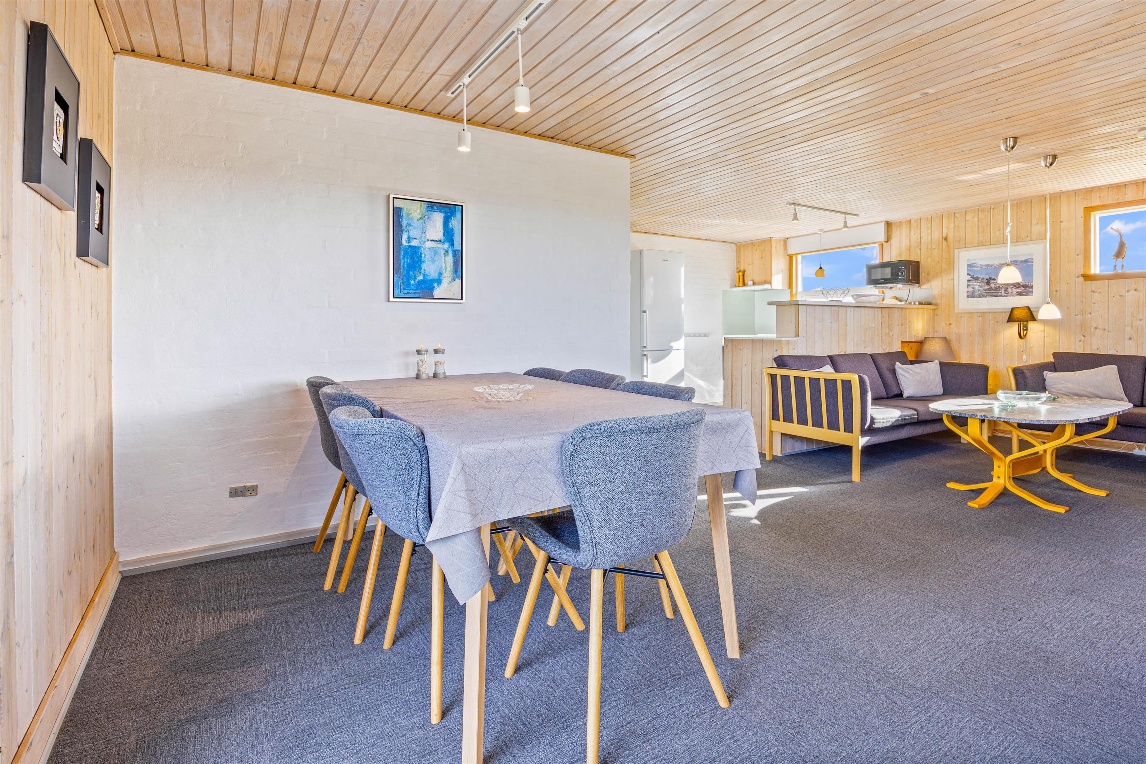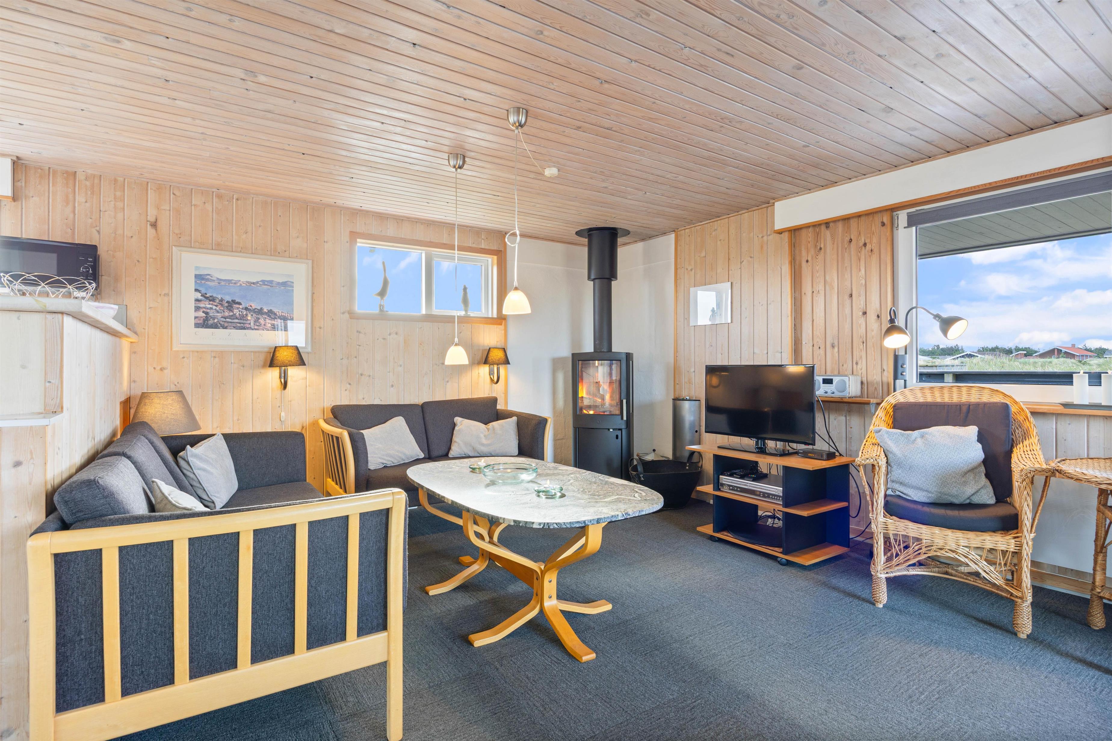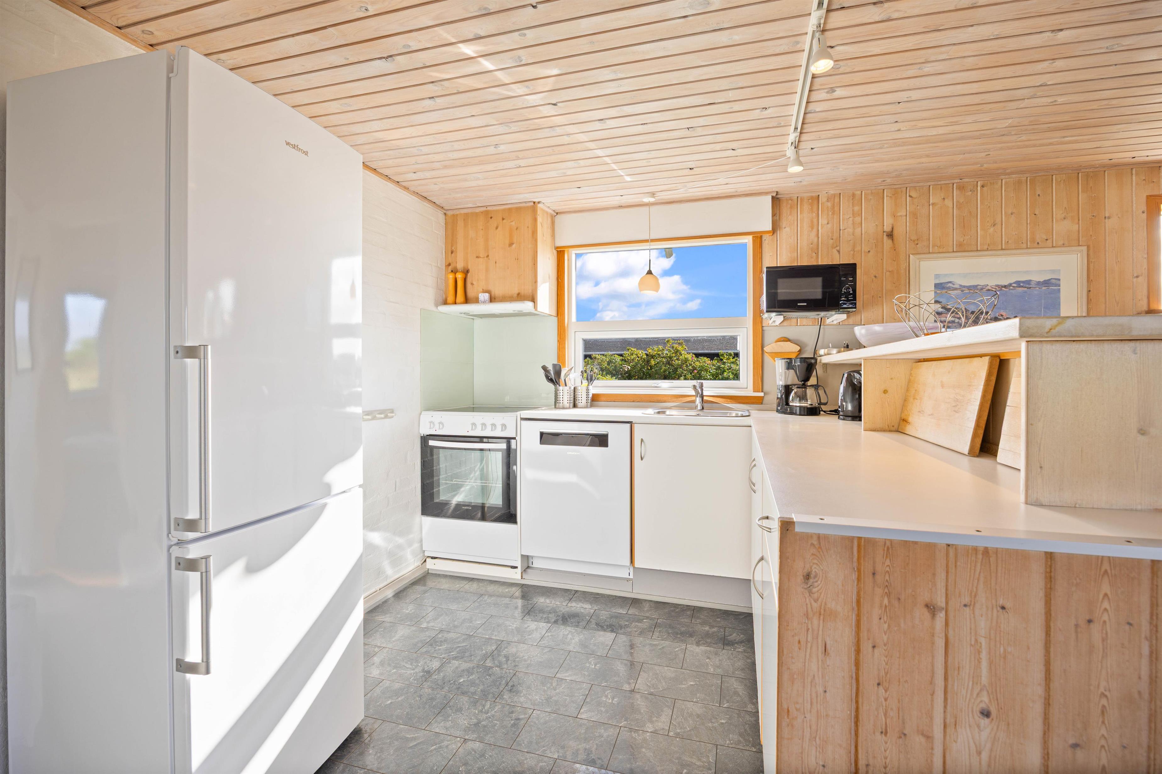 Det åbne- og funktionelt indrettede køkken i forbindelse med stue med komfortabel spiseafdeling og hyggeligt opholdsområde med hjørnesofa og brændeovn er hjertet i dette klassiske sommerhus. Især lystfiskere vil blive glade for den separate fryser, men det er også udstyret med opvaskemaskine og mikrobølgeovn. De store vinduespartier giver et godt lysindfald, så I kan lægge et puslespil ved spisebordet eller læse en god bog ved den knitrende ild i brændeovnen.