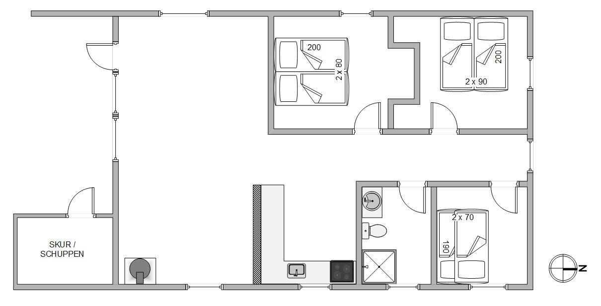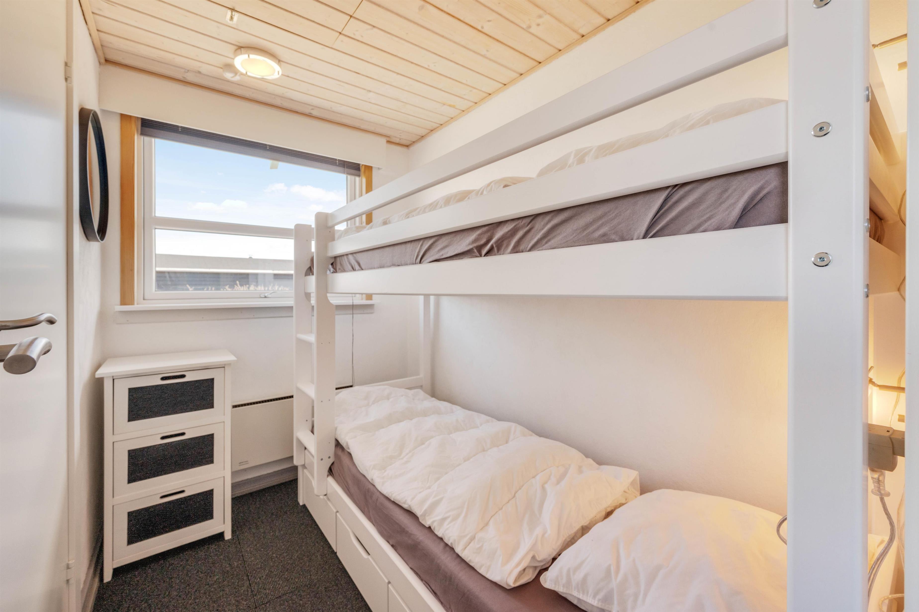 Der er 3 soveværelser, 2 med dobbeltsenge og 1 med køjesenge, samt et praktisk badeværelse med gulvvarme. I stue og soveværelser er der gulvtæppe, og vaskemaskinen skal også nok komme i brug, hvis du har børn med på ferien.