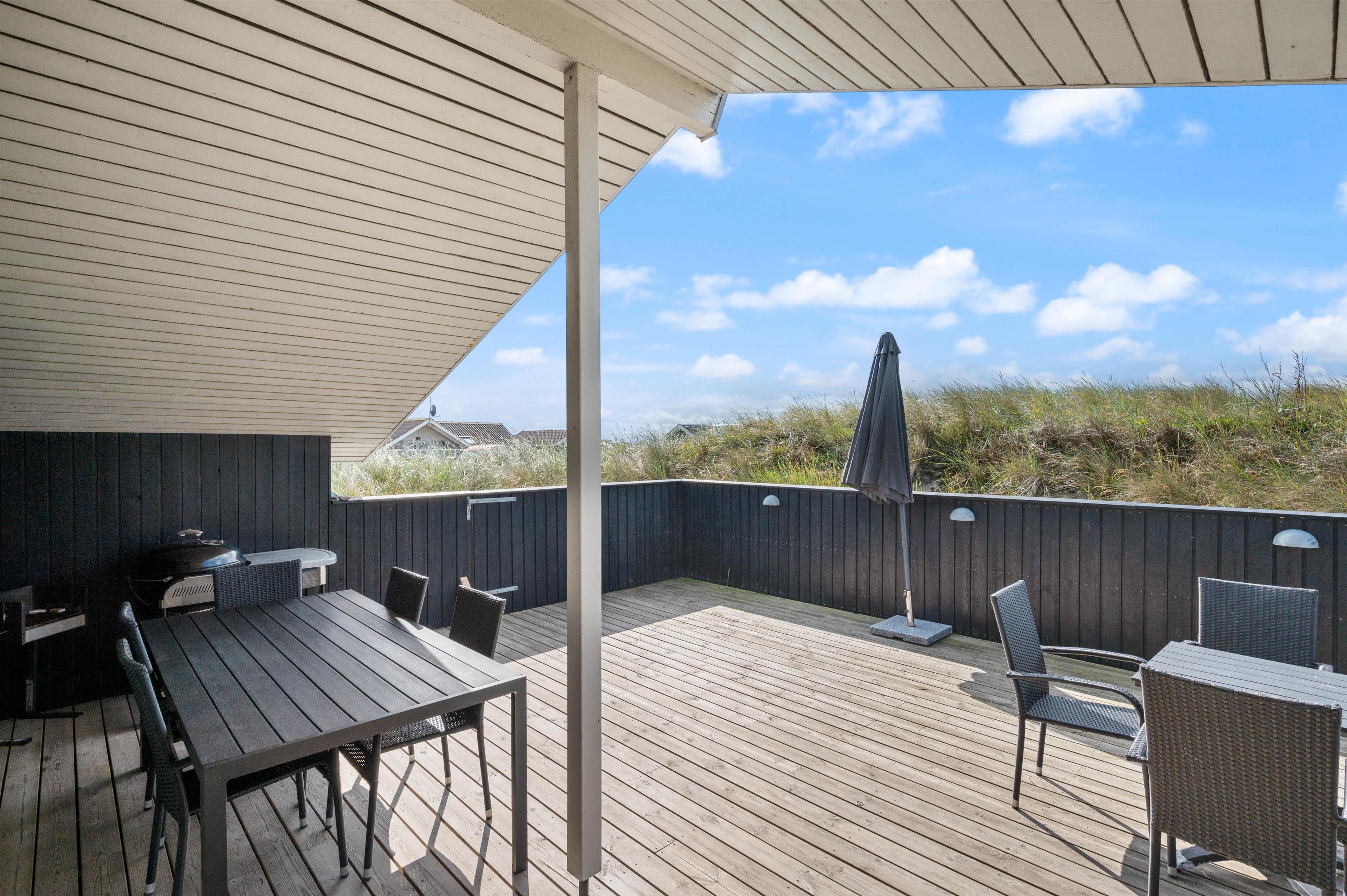 Fra alrummet træder I ud på den store, nordvendte terrasse, der er delvist overdækket og lukket hele vejen rundt. Her har I de bedste forudsætninger for at nyde den friske havluft og den flotte, vestjyske natur; gode havemøbler, liggestole, grill og ikke mindst vildmarksbadet, hvor I kan give ferien endnu et ekstra wellness-touch.